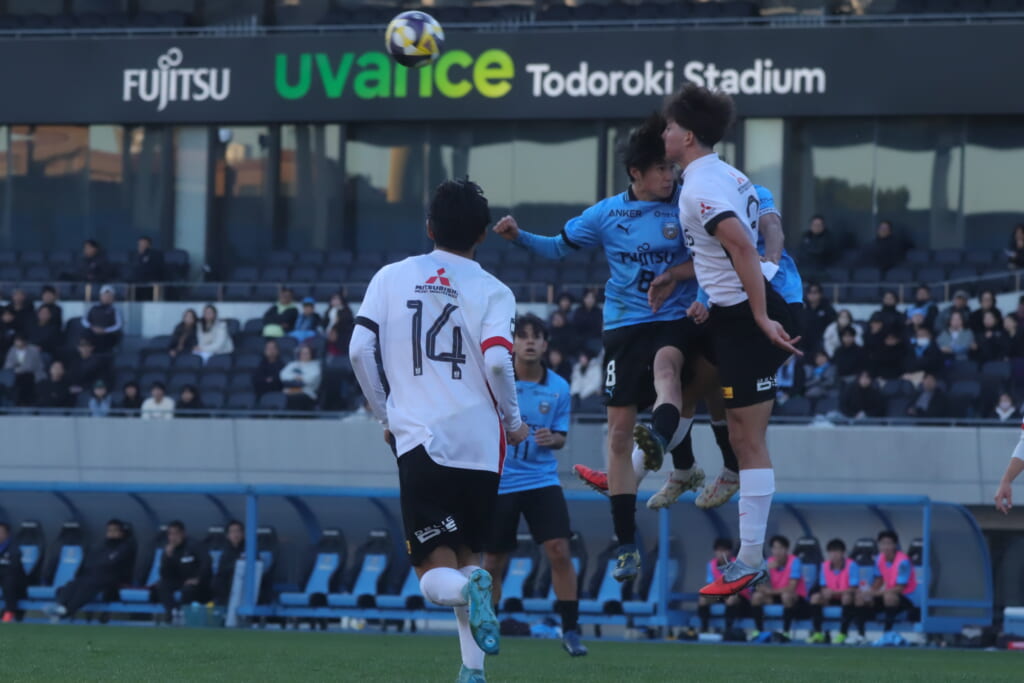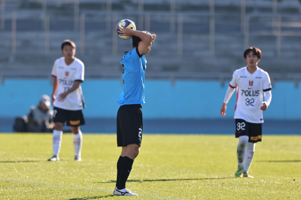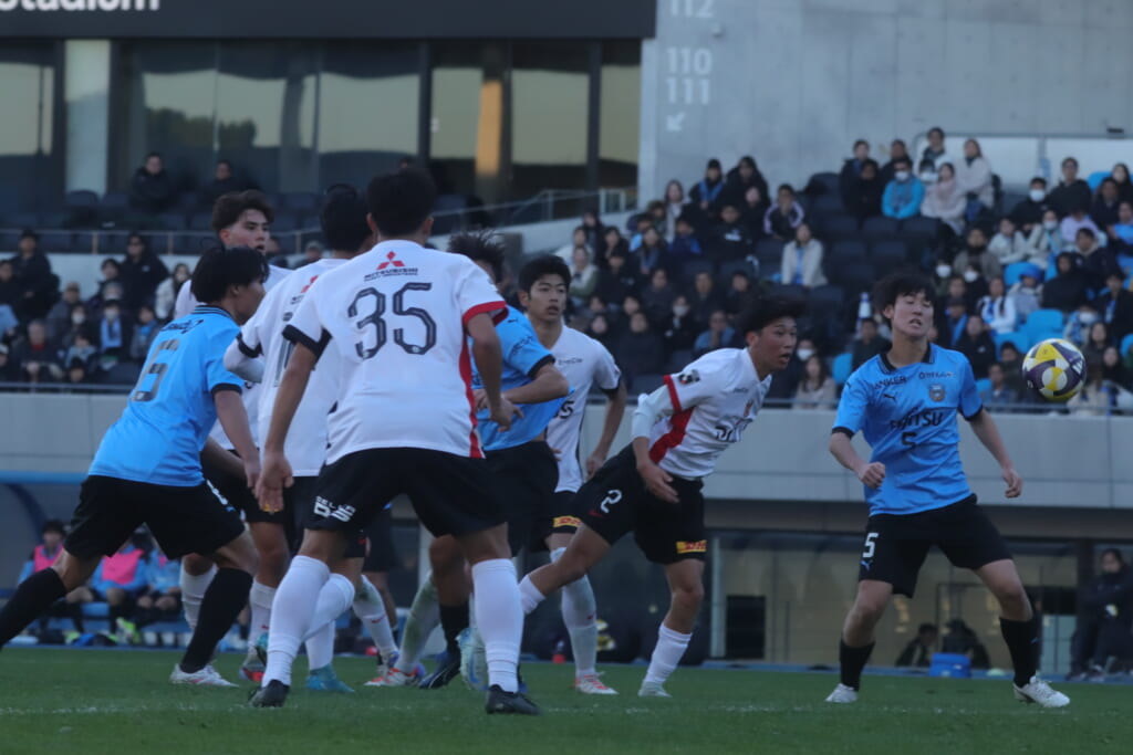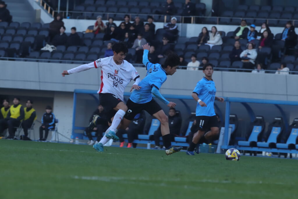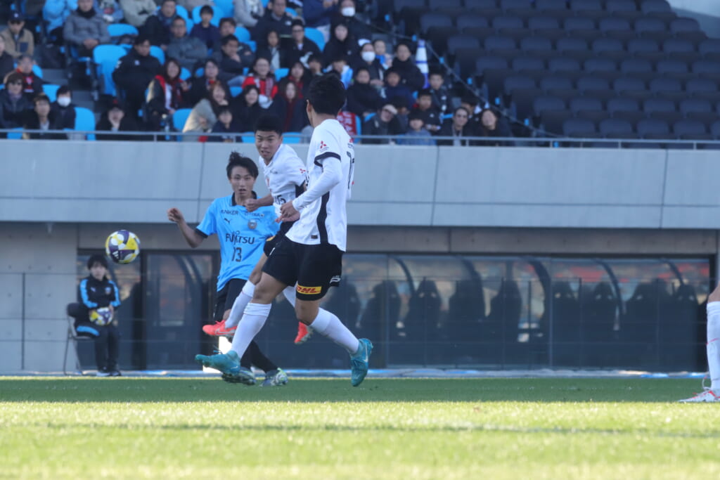 フリーキックを得たフロンターレ。新堀、平塚が立ち、遠いサイドに入れていくと楠田が折り返そうとしますが、浦和、木下侑也がカバー。