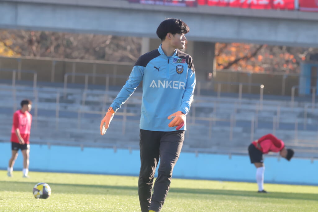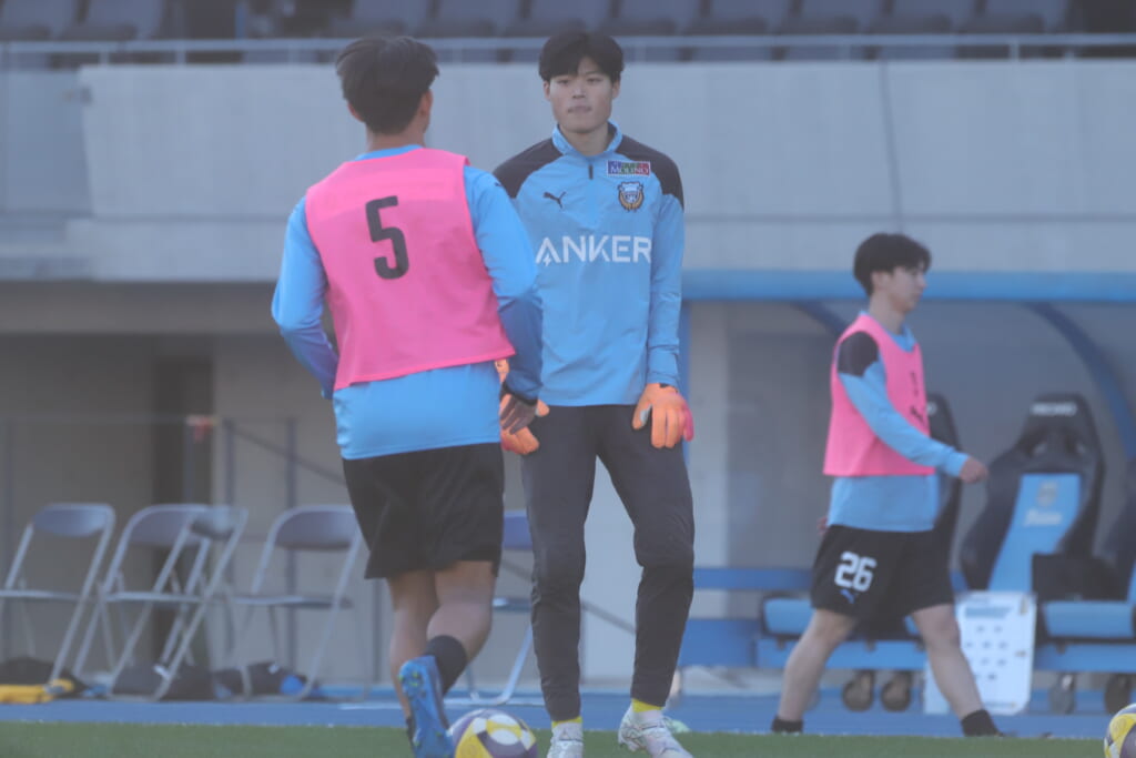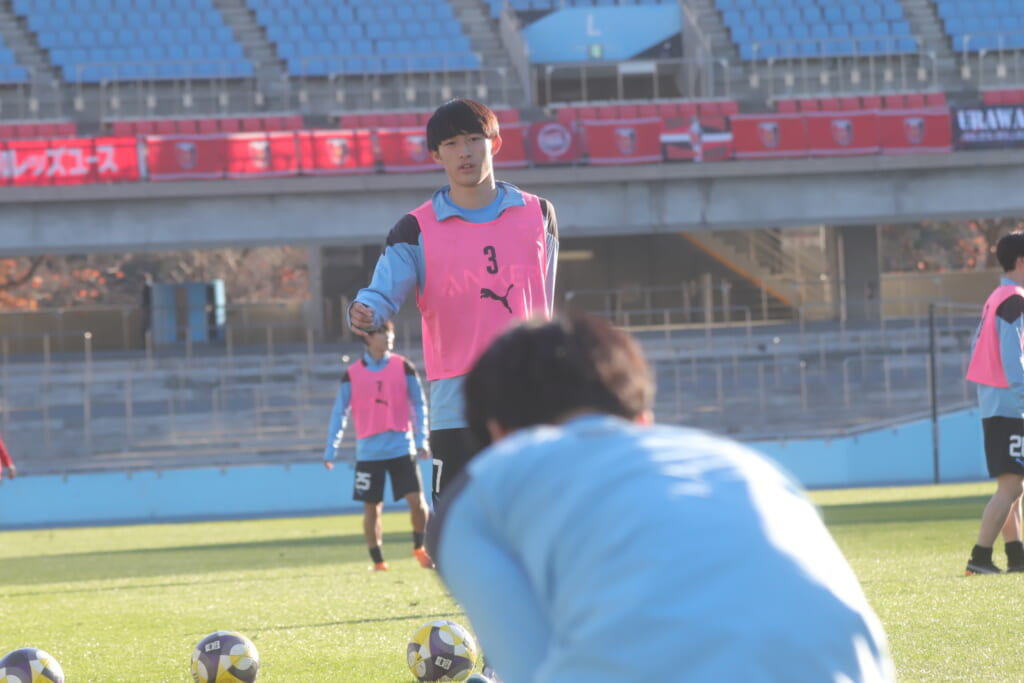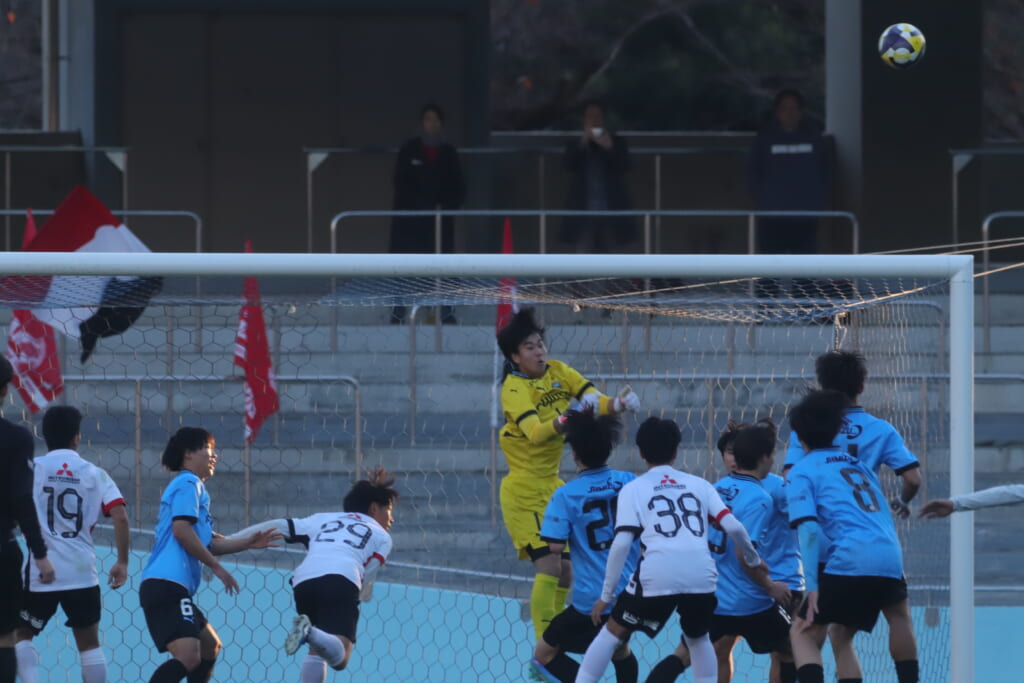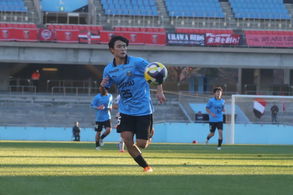 フリーキックを得たフロンターレ。新堀、平塚が立ち、遠いサイドに入れていくと楠田が折り返そうとしますが、浦和、木下侑也がカバー。