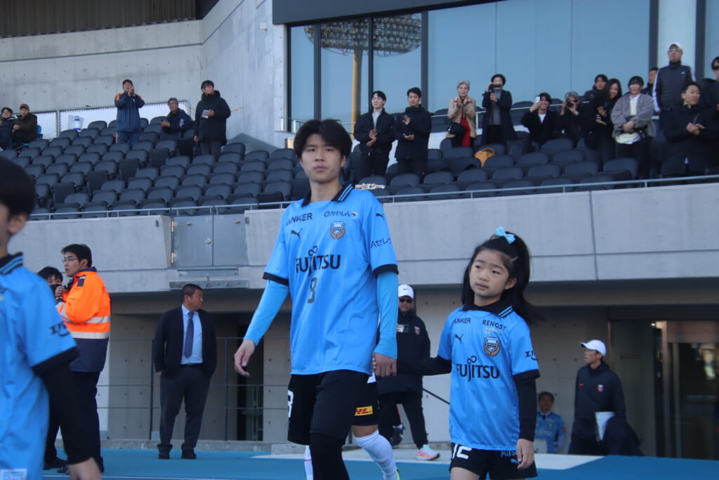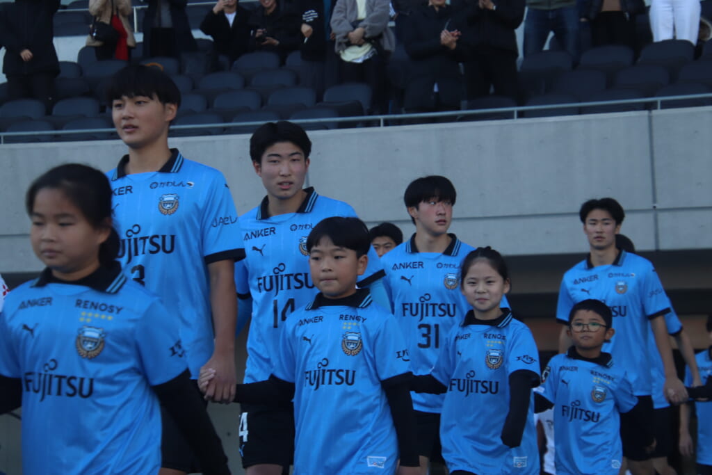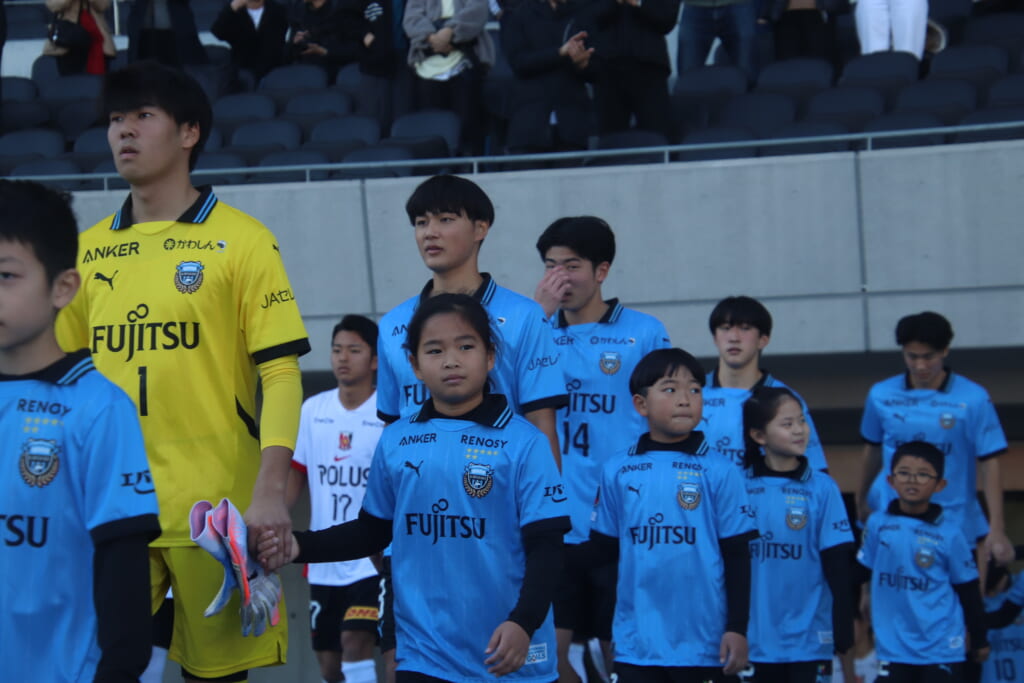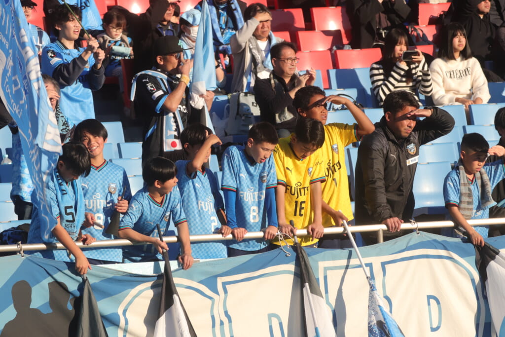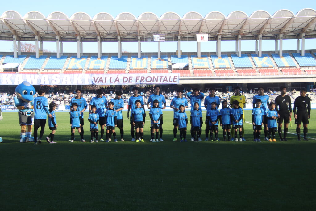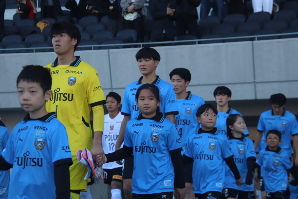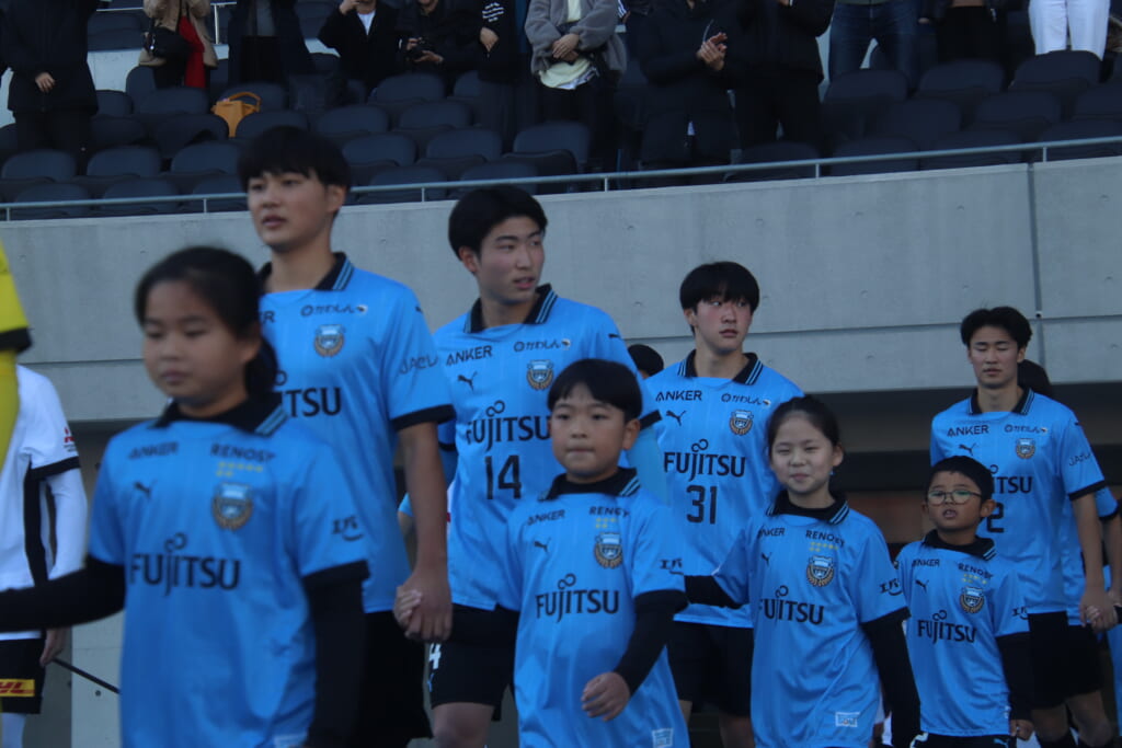 青空の広がった等々力。選手の家族らに加え、Gゾーンには多くのフロンターレサポーターやフロンターレU-12、フロンターレU-15生田の選手たちの姿も。さらにボールパーソンを務めるのは川崎フロンターレSSガールズの選手たち。