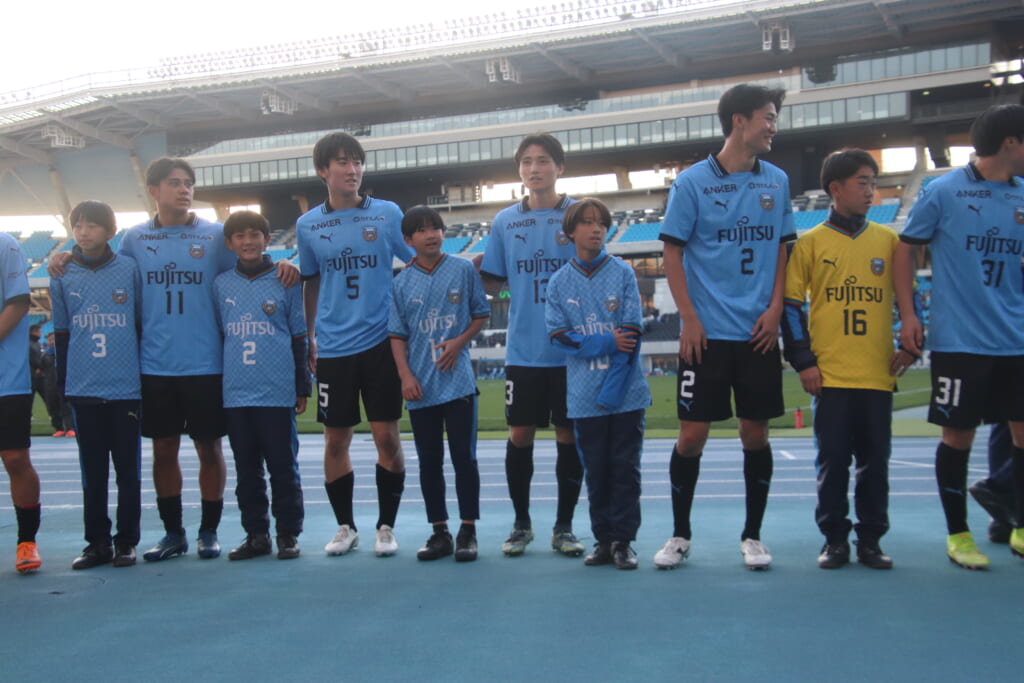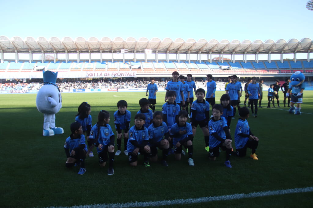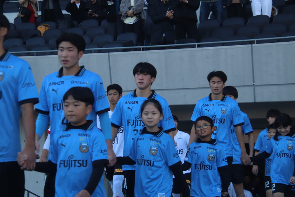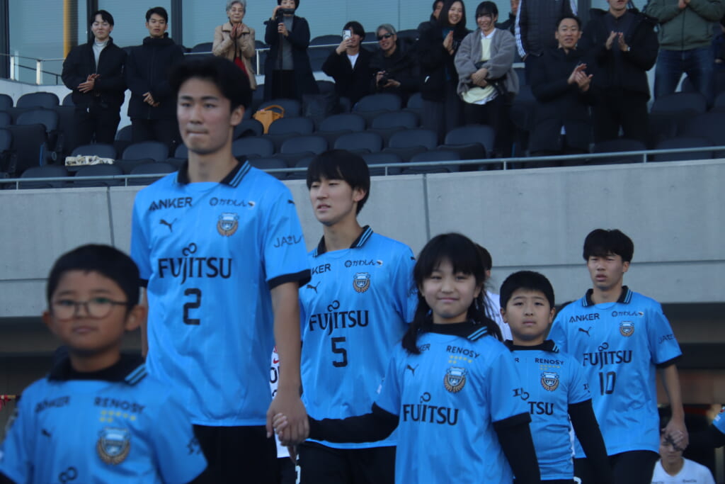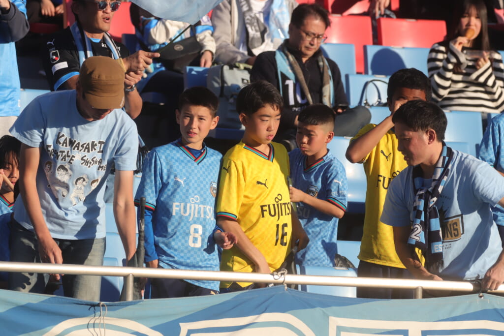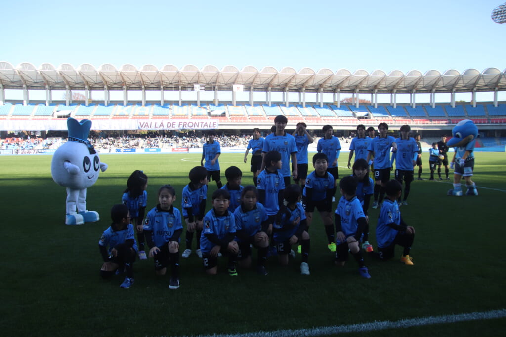 青空の広がった等々力。選手の家族らに加え、Gゾーンには多くのフロンターレサポーターやフロンターレU-12、フロンターレU-15生田の選手たちの姿も。さらにボールパーソンを務めるのは川崎フロンターレSSガールズの選手たち。