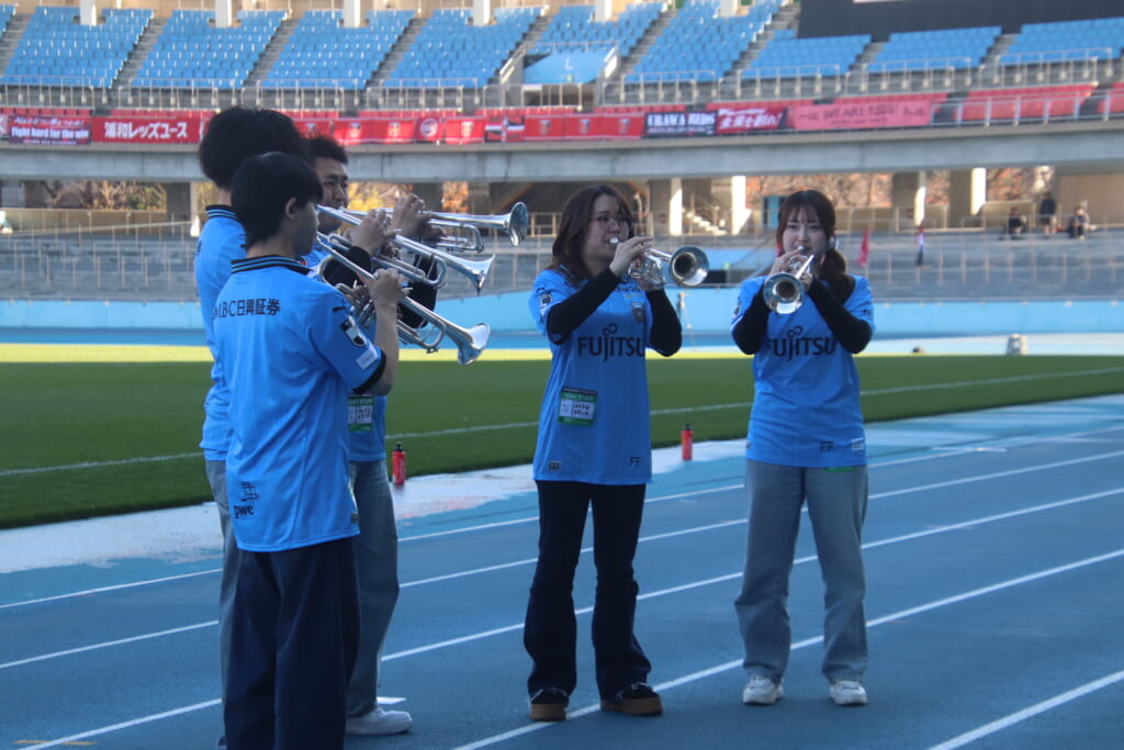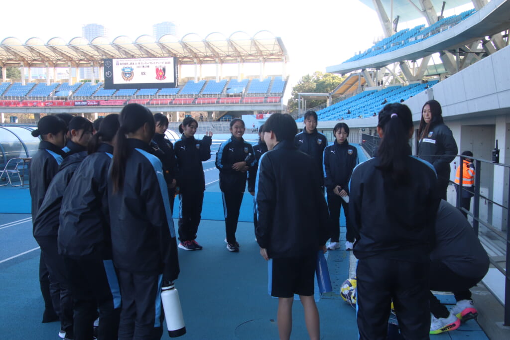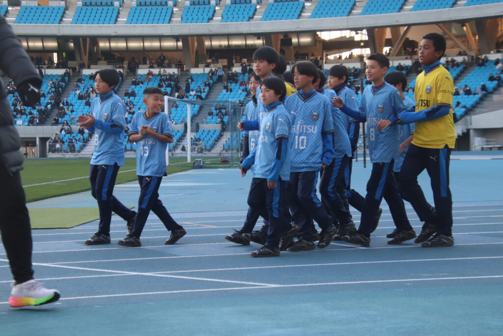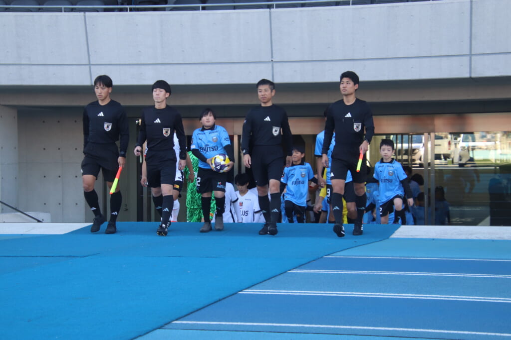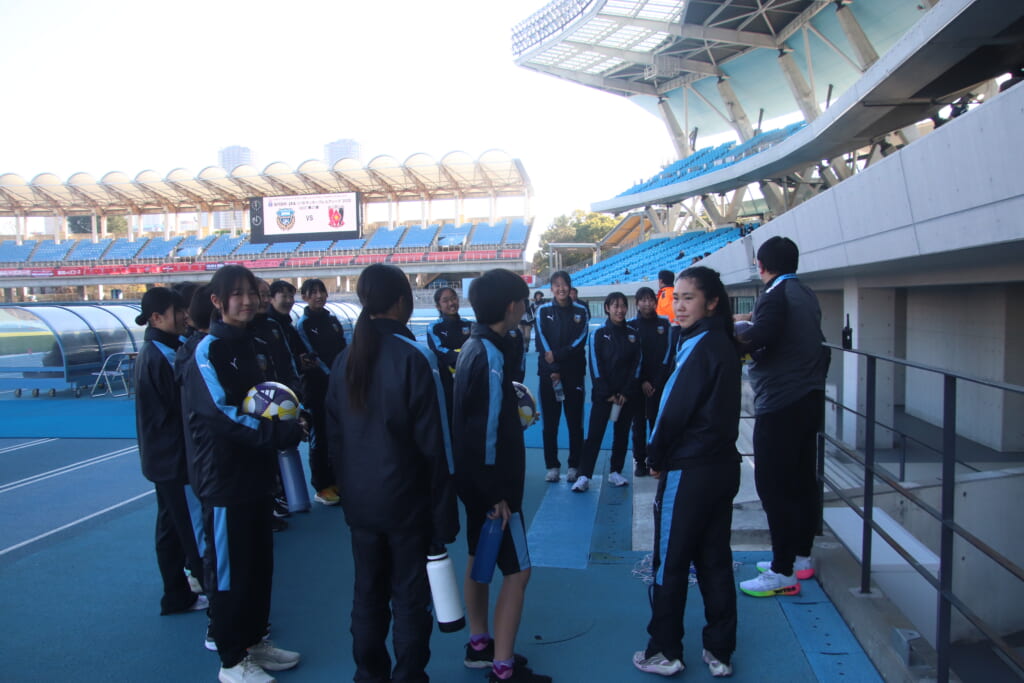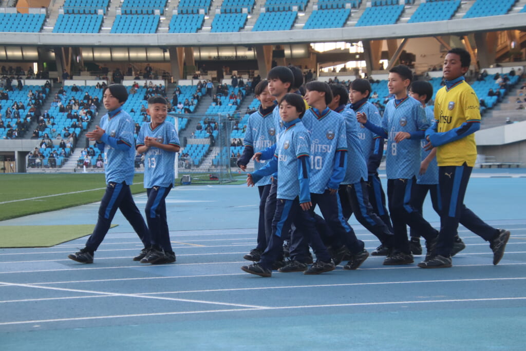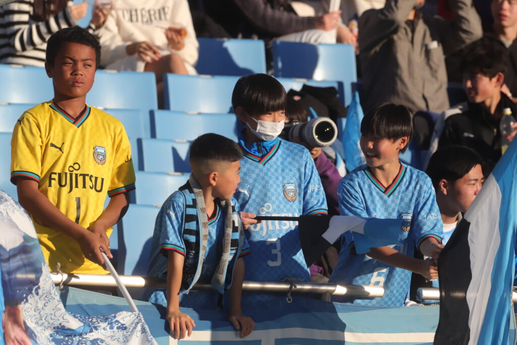 青空の広がった等々力。選手の家族らに加え、Gゾーンには多くのフロンターレサポーターやフロンターレU-12、フロンターレU-15生田の選手たちの姿も。さらにボールパーソンを務めるのは川崎フロンターレSSガールズの選手たち。