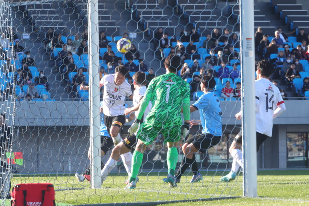 柏村の右クロスに、新堀がヘディングシュート。しかし、浦和の好守が阻み、惜しくもゴールとはならず。