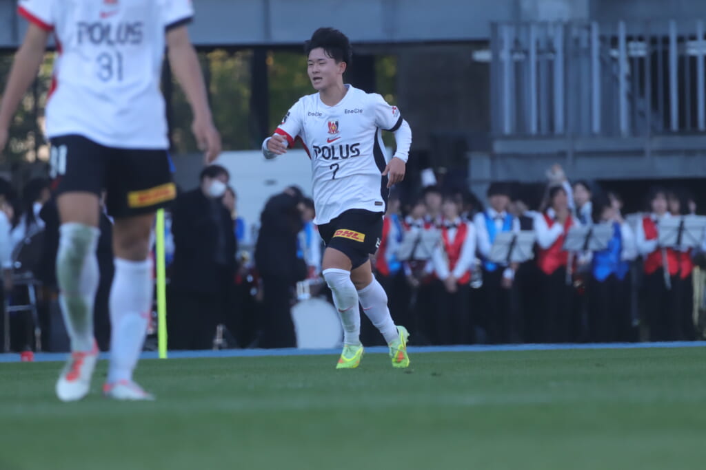 立ち上がり、前に出てくるのは浦和。フィードを入れ、左サイド、高い位置へ持ち込んでいきますが、藤田が対応。