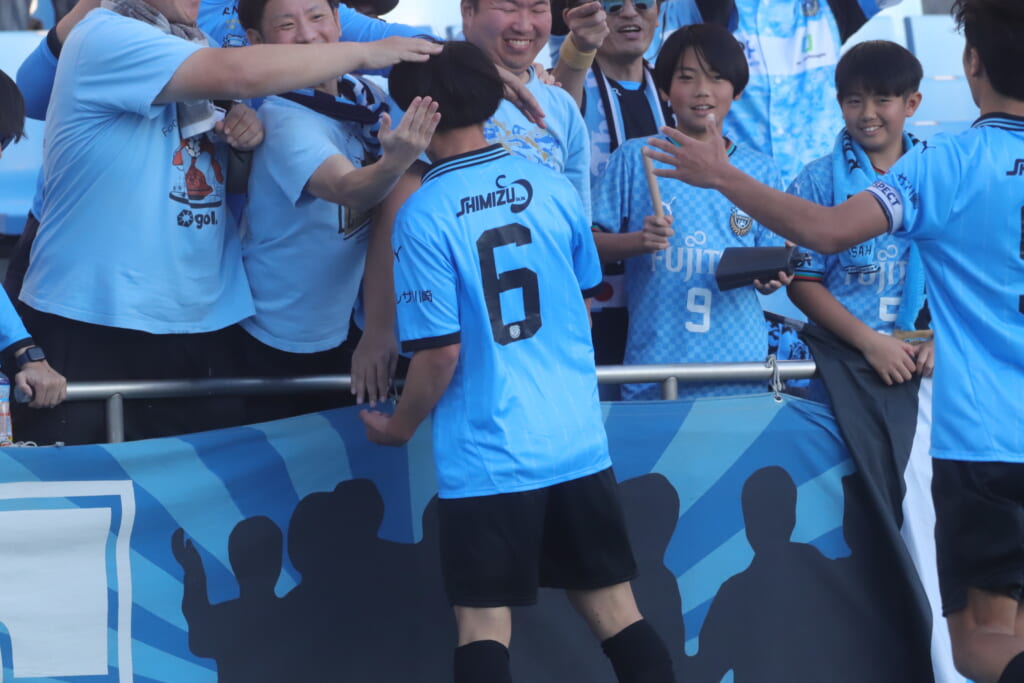 フロンターレらしい見事な連係からの勝ち越しのゴール。サポーターからは大きな拍手。そして“バスケットケース”。