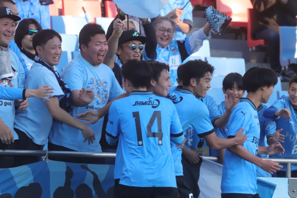 3-2。勝ち越しのゴールはフロンターレへ。タオルマフラーが振られ、“バスケットケース”の中、喜びを分かち合うフロンターレの選手たち。