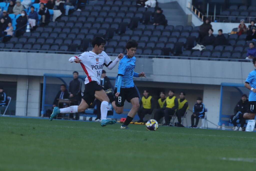 さらに浦和が細かくボールを動かし、フロンターレの陣内でプレーする時間をつくっていきますが、フロンターレは小川尋斗がカットするなど、再びマイボールに。