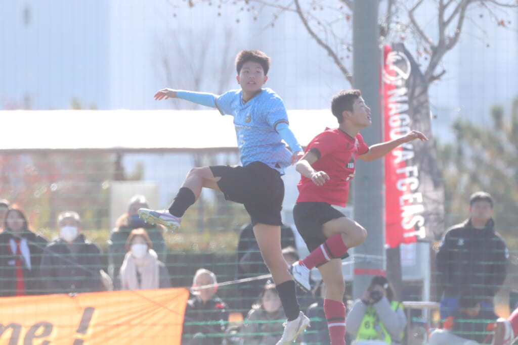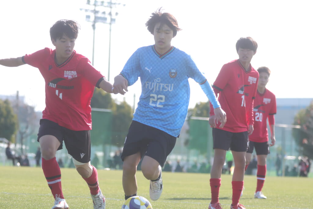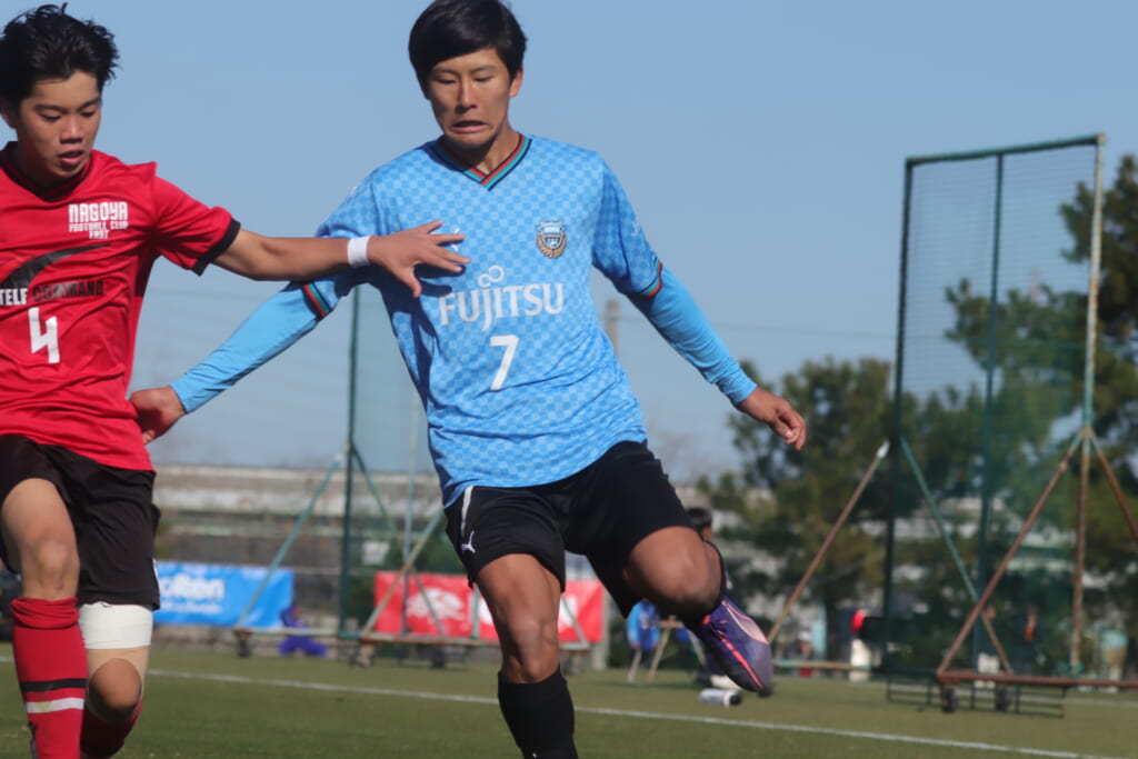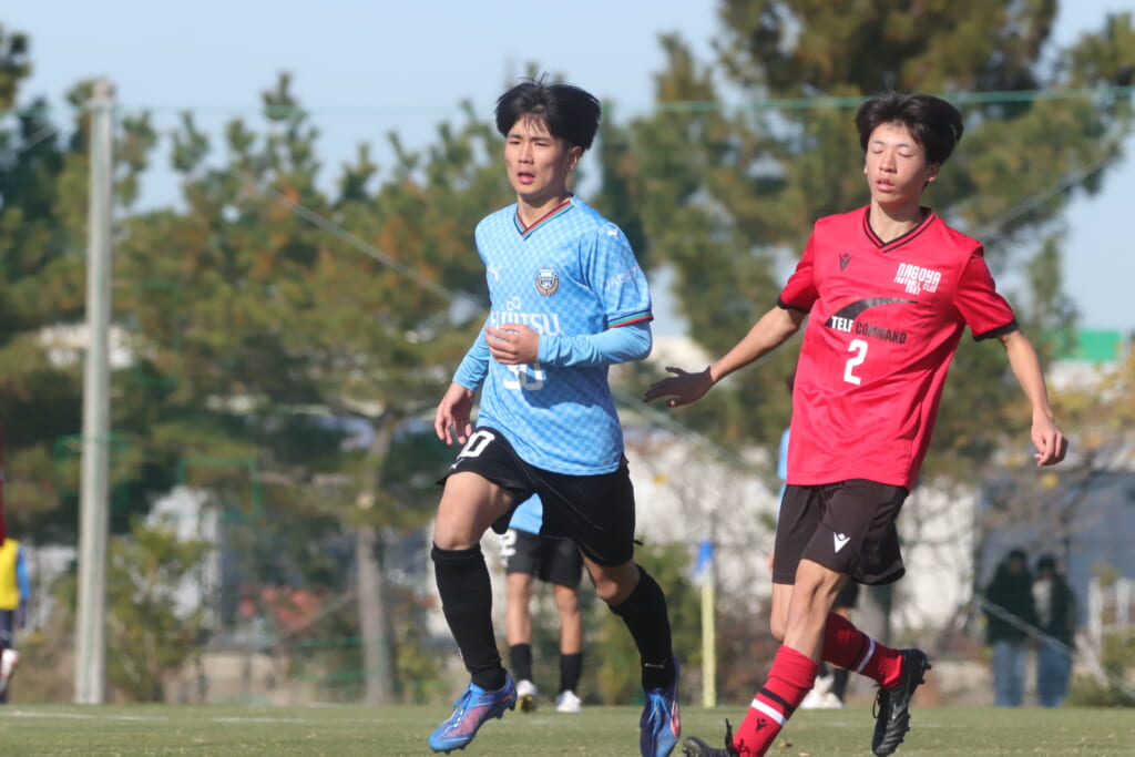 左コーナーキックを得たフロンターレ生田、戸澤が入れると、セカンドボールを拾い、中野が正面へ。しかし、名古屋FC・EASTの体を張った対応に遭い、右コーナーキックに。