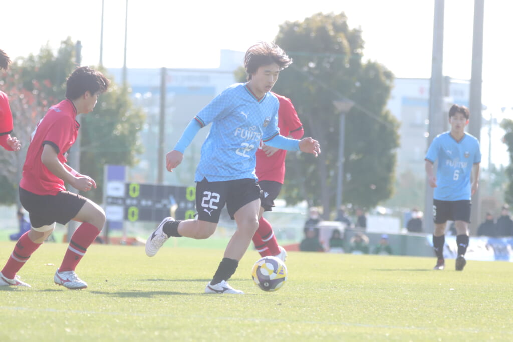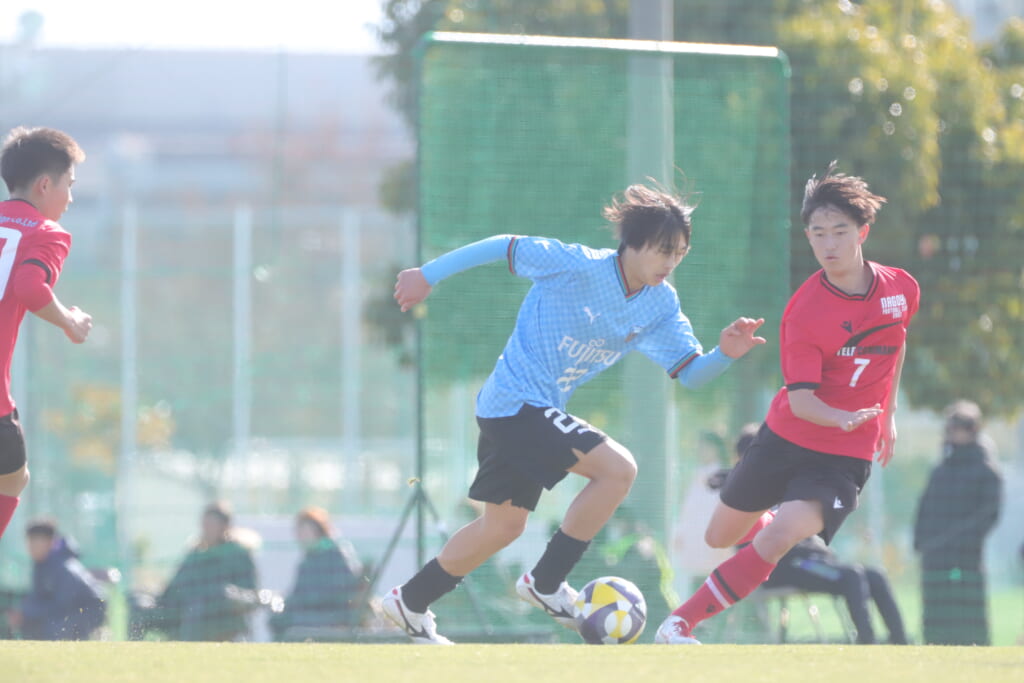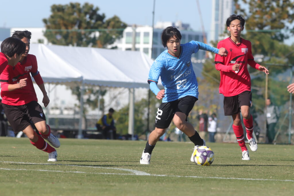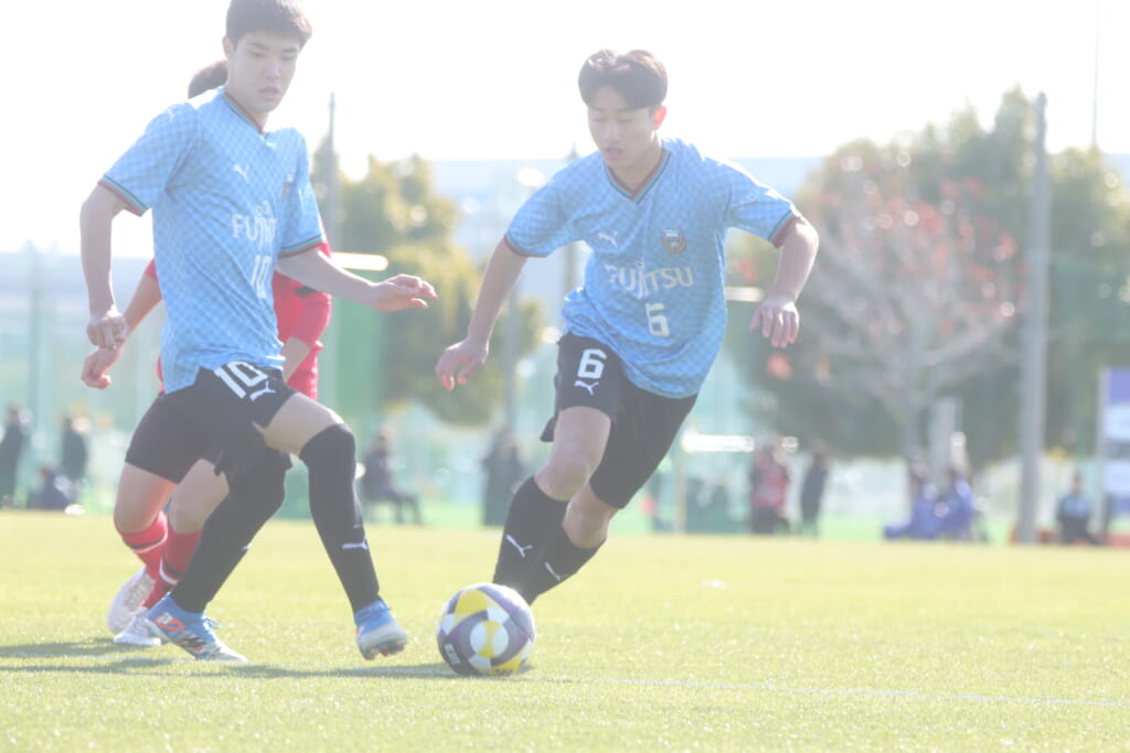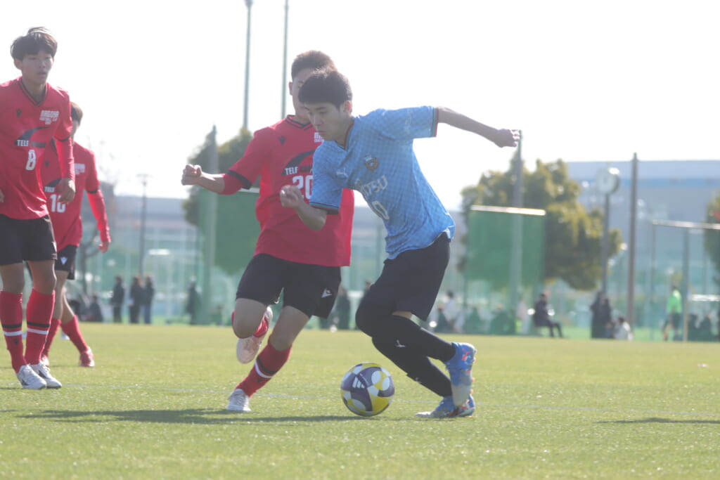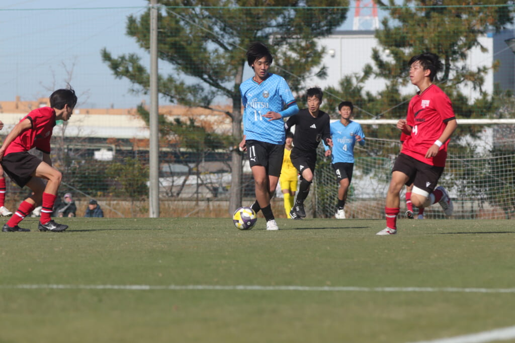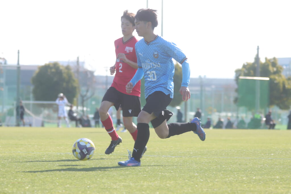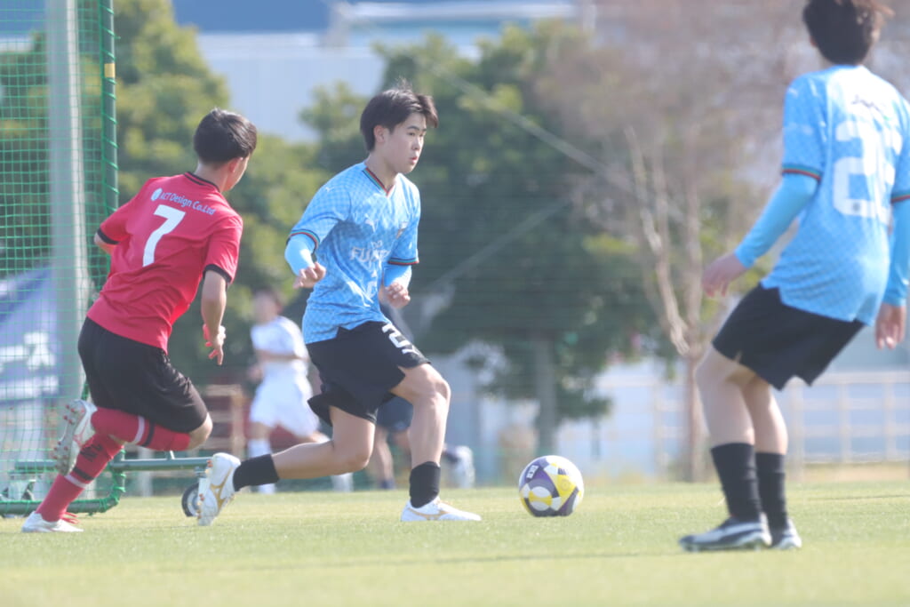 ボールを動かし、對馬の縦パスに吉澤が正面へ、相手の寄せをかわすように仕掛けるなどしていくフロンターレ生田。