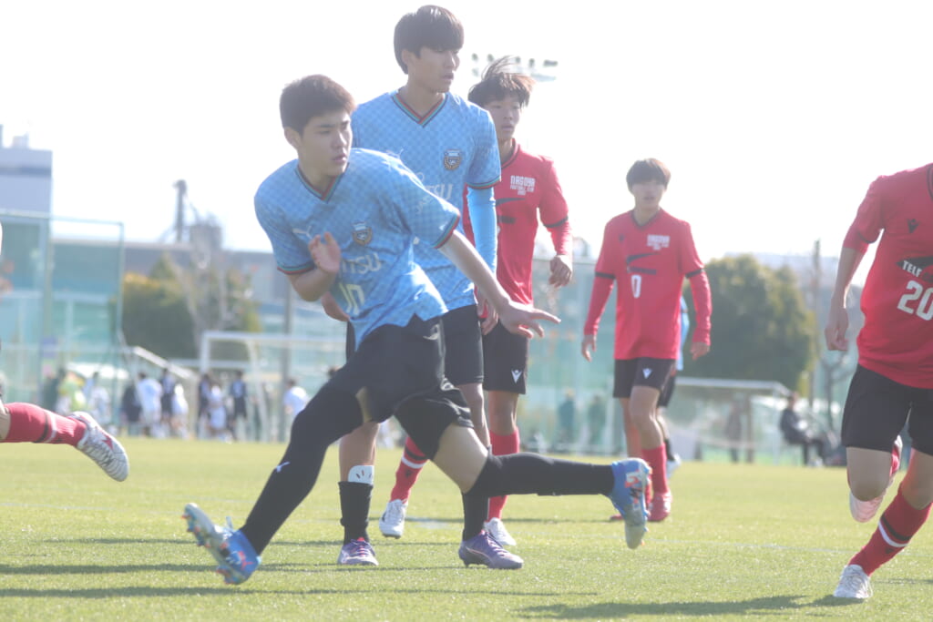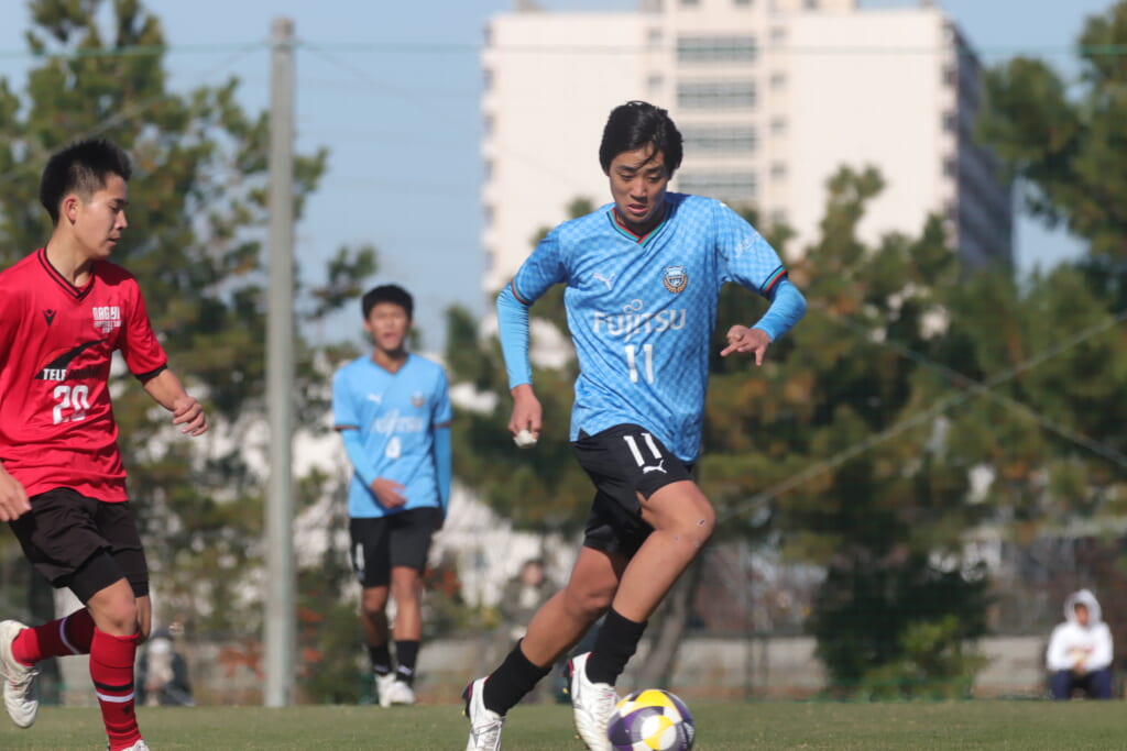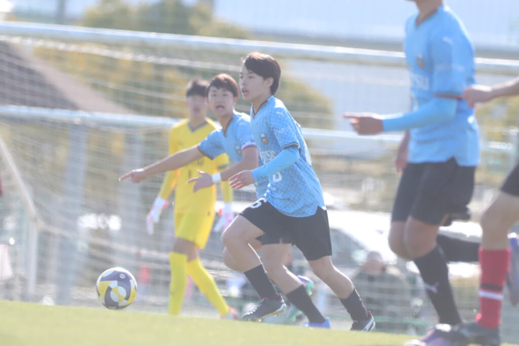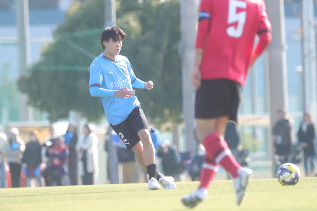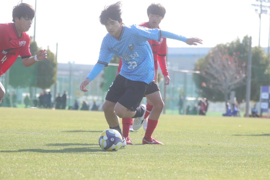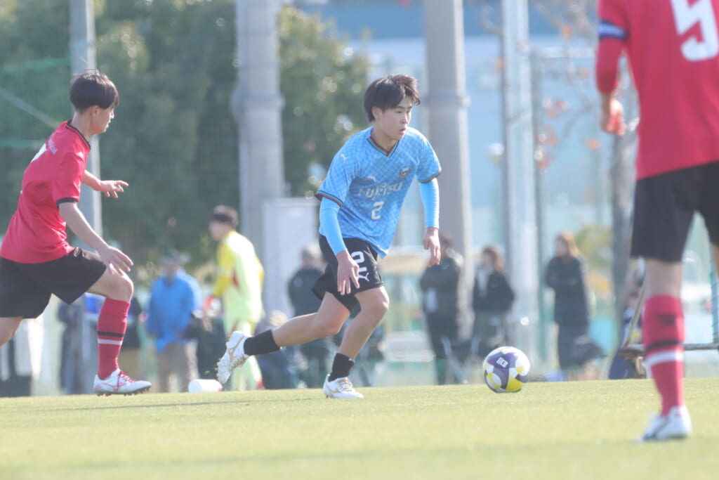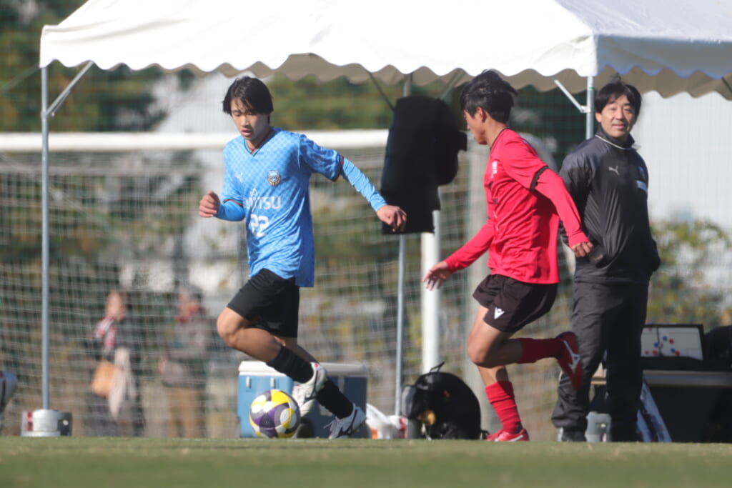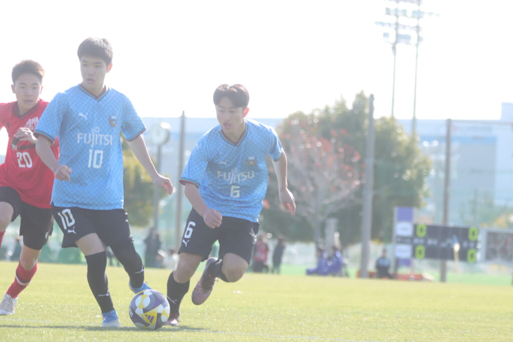 ボールを動かし、對馬の縦パスに吉澤が正面へ、相手の寄せをかわすように仕掛けるなどしていくフロンターレ生田。