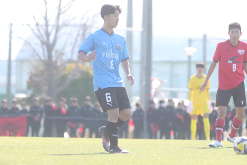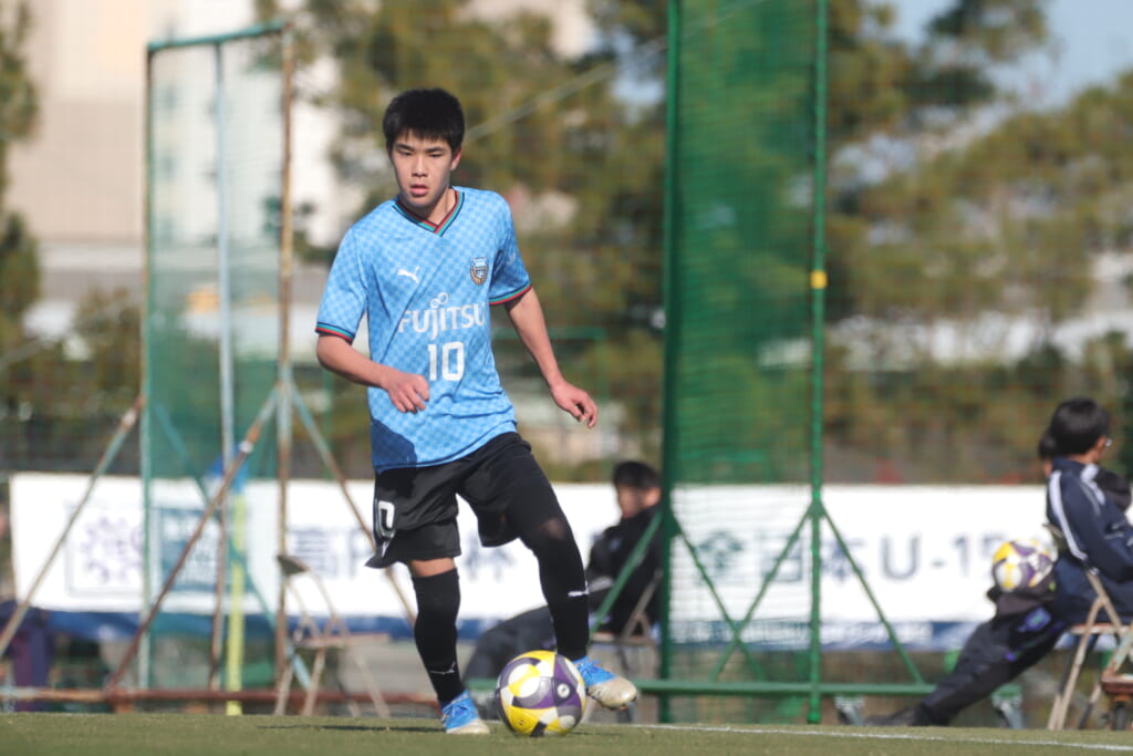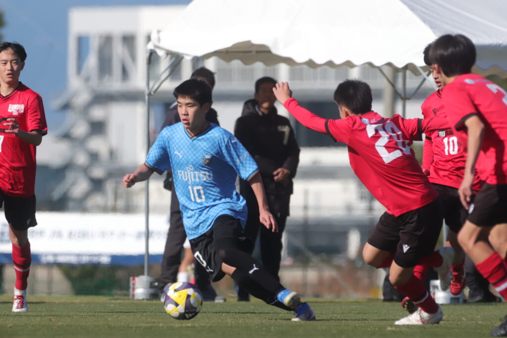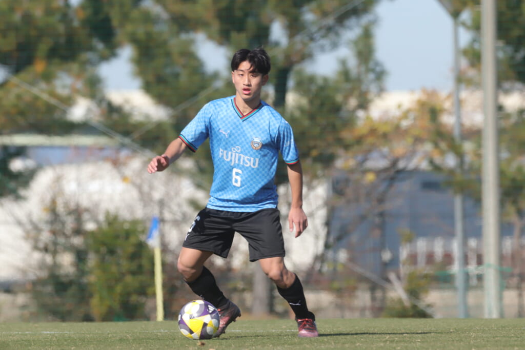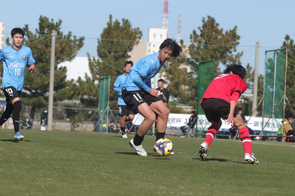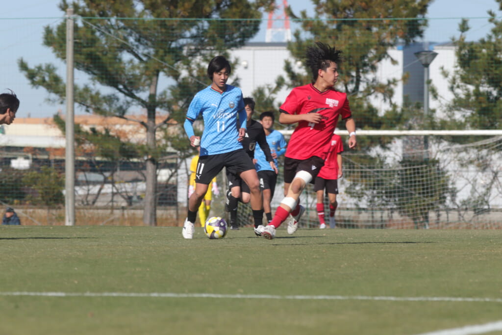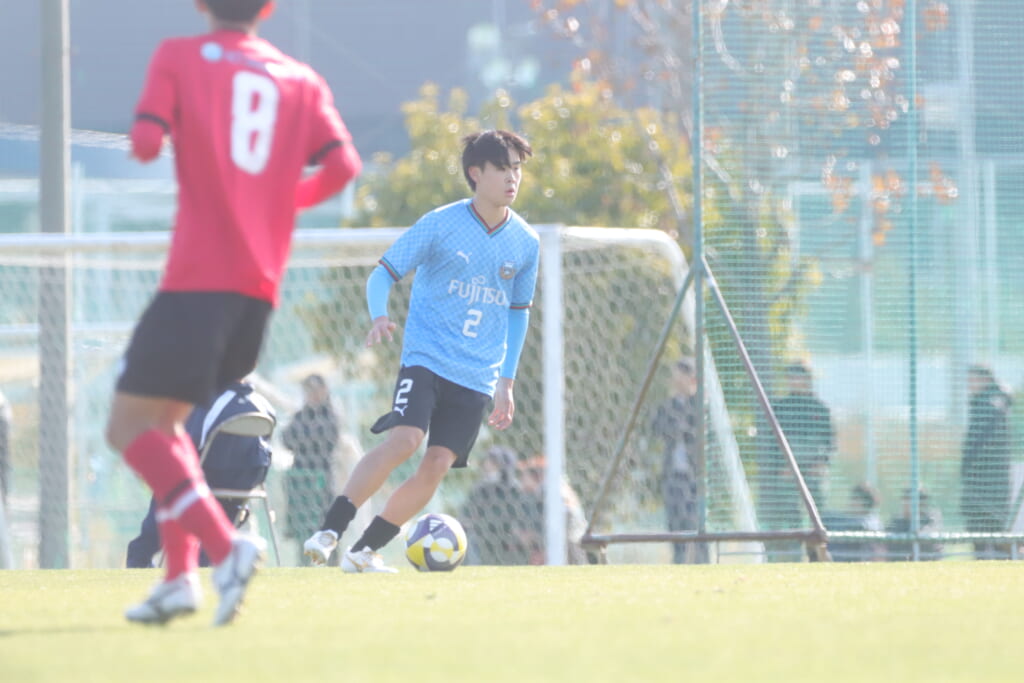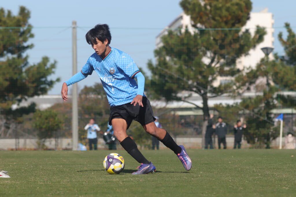 ボールを動かし、對馬の縦パスに吉澤が正面へ、相手の寄せをかわすように仕掛けるなどしていくフロンターレ生田。