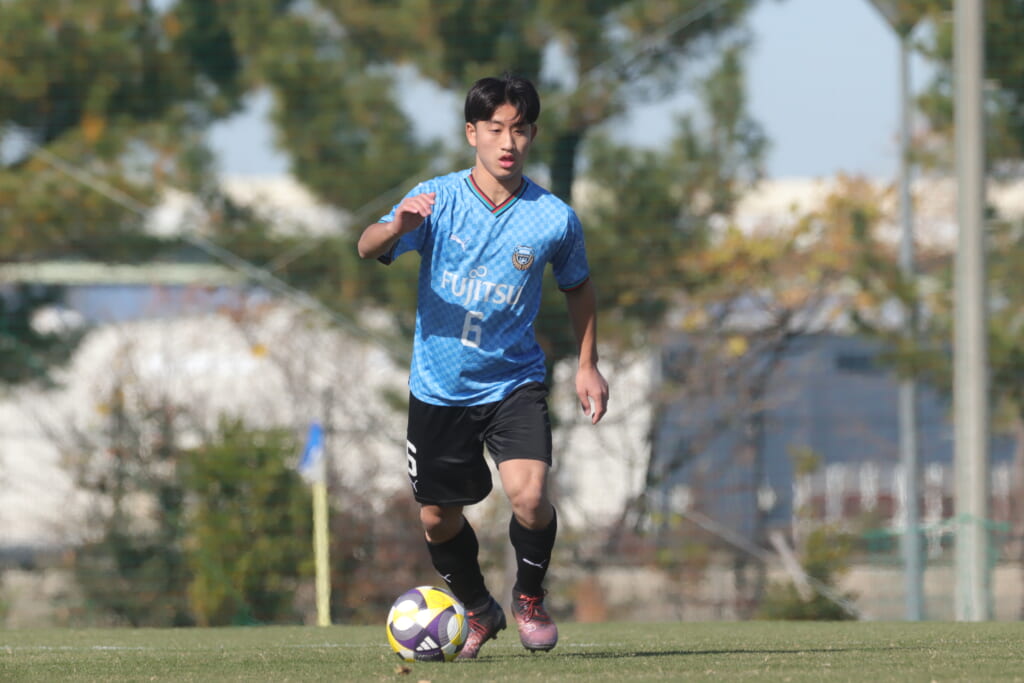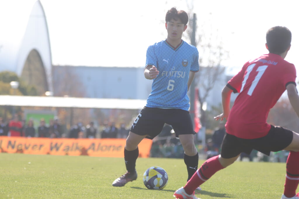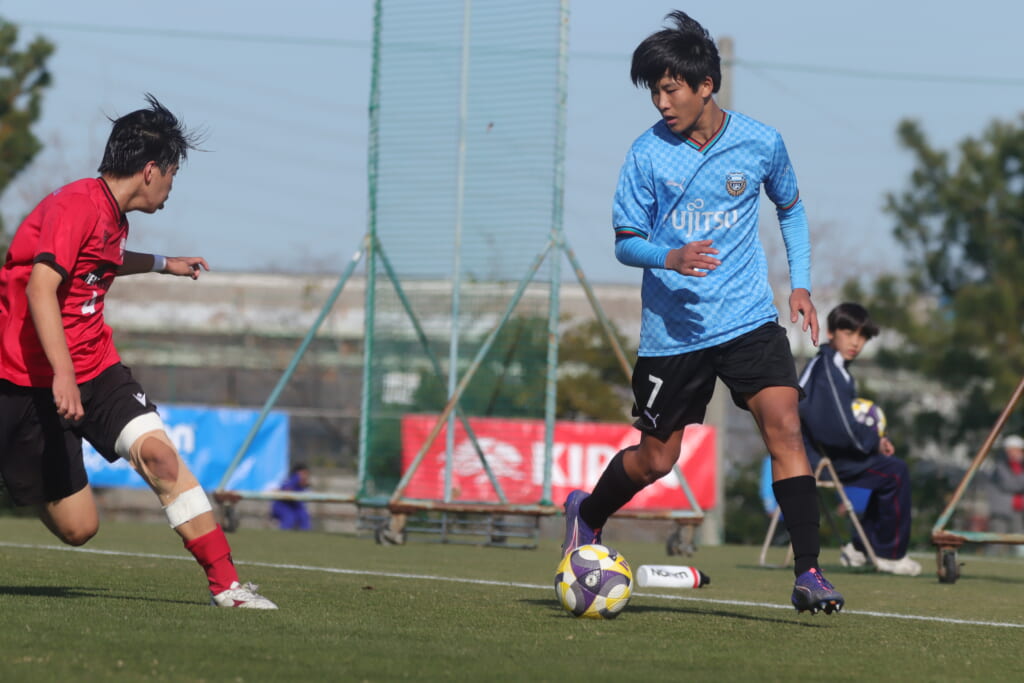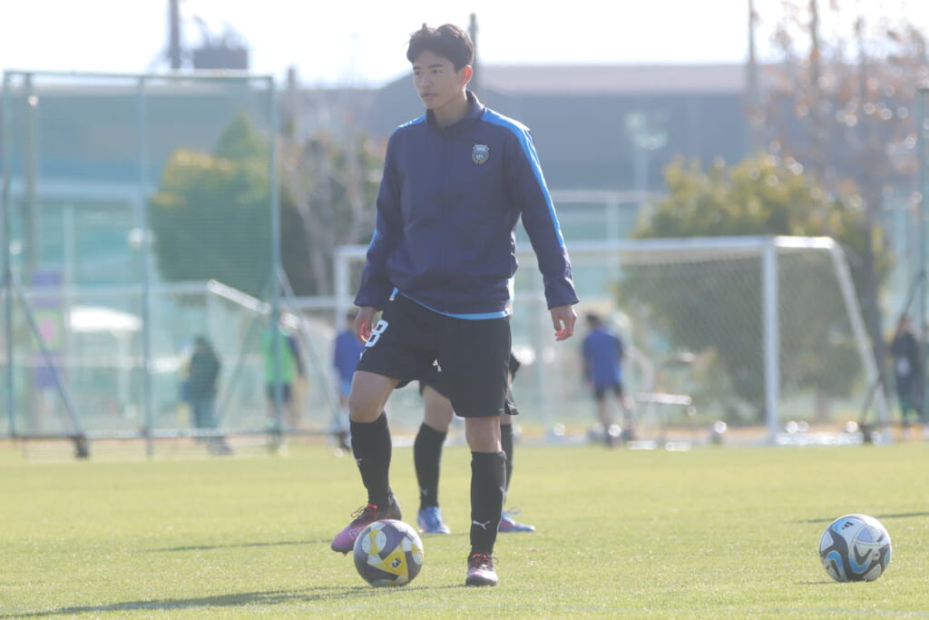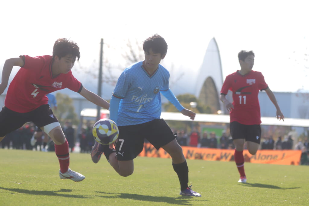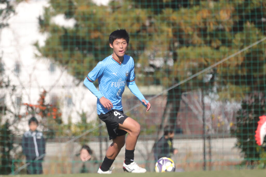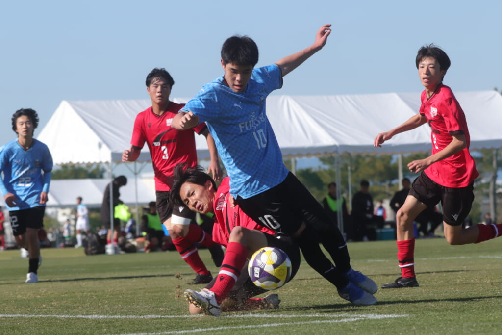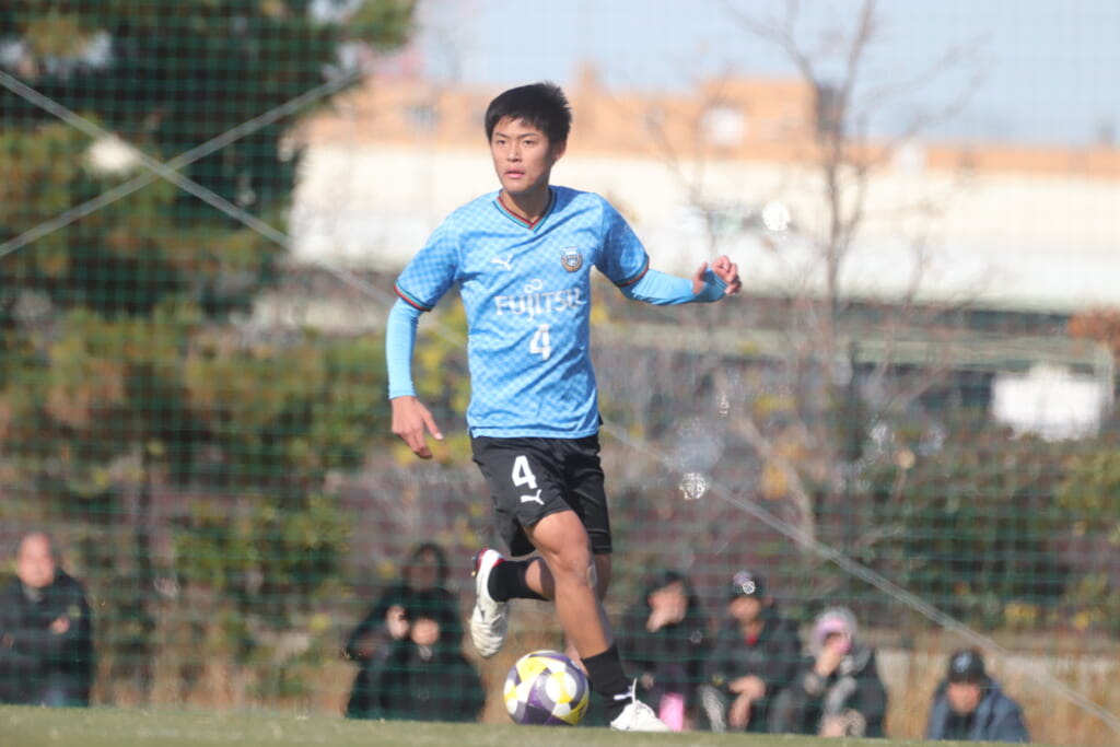 ボールを動かし、對馬の縦パスに吉澤が正面へ、相手の寄せをかわすように仕掛けるなどしていくフロンターレ生田。