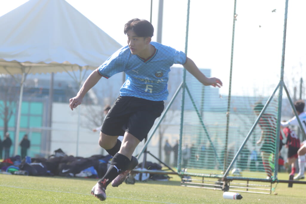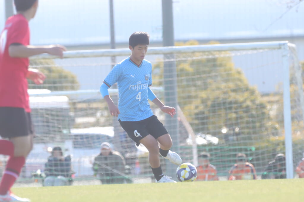 中央間で望月が受け、そのパスに出口が右サイド、高い位置をうかがい、名古屋FC・EASTが縦につけようとするところでは對馬が出足よくカット。自分たちのボールにしていくフロンターレ生田。
