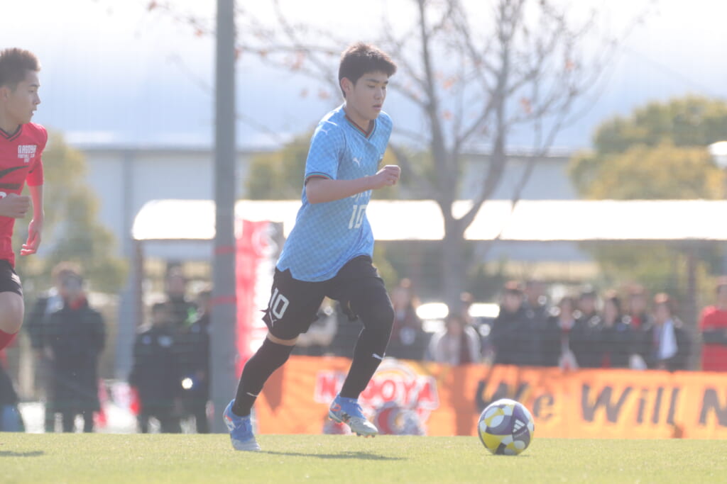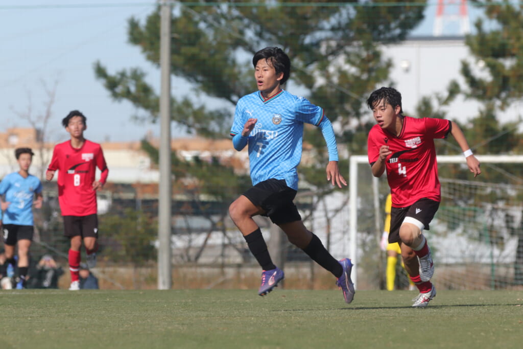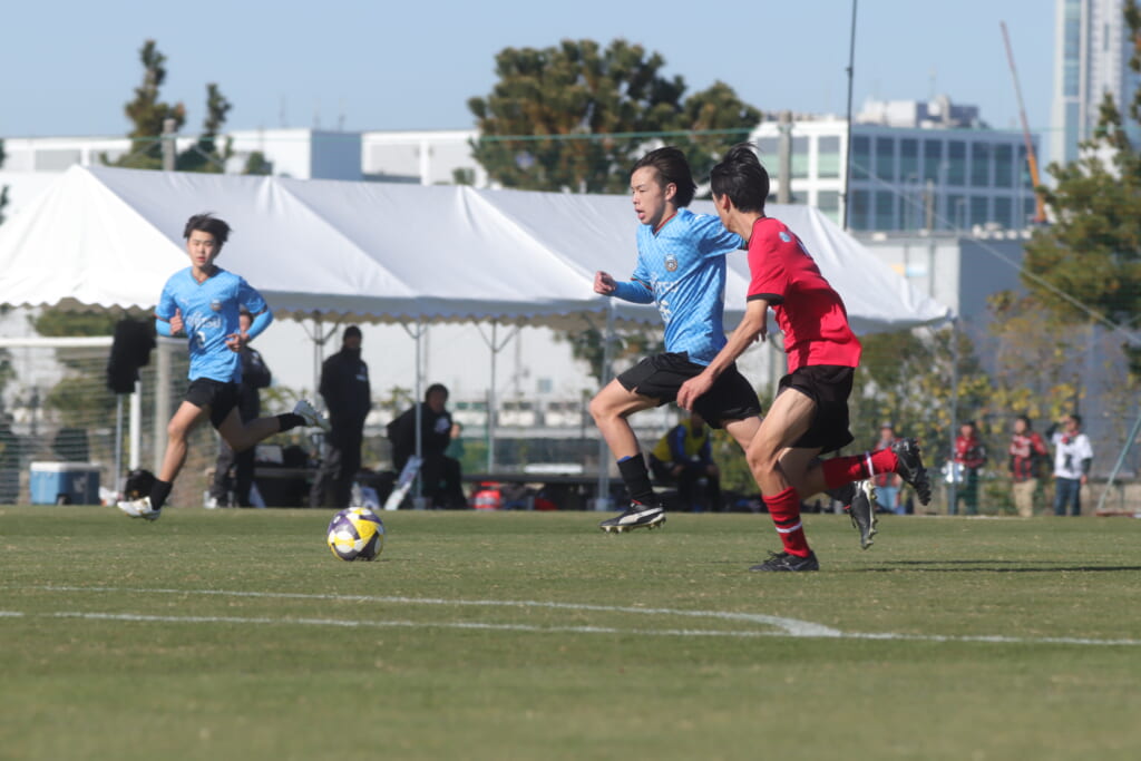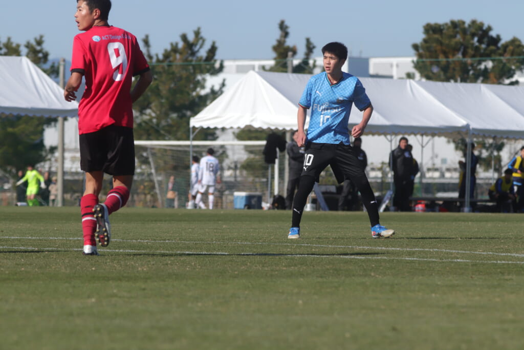 一方の名古屋FC・EASTも中央、本坊のパスに、河内が高い位置へ。しかし、對馬がカット。對馬から中央へつないだフロンターレ生田は、右サイドへ展開。