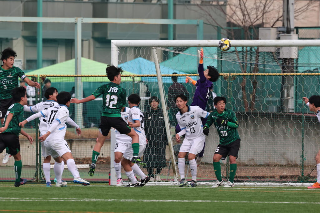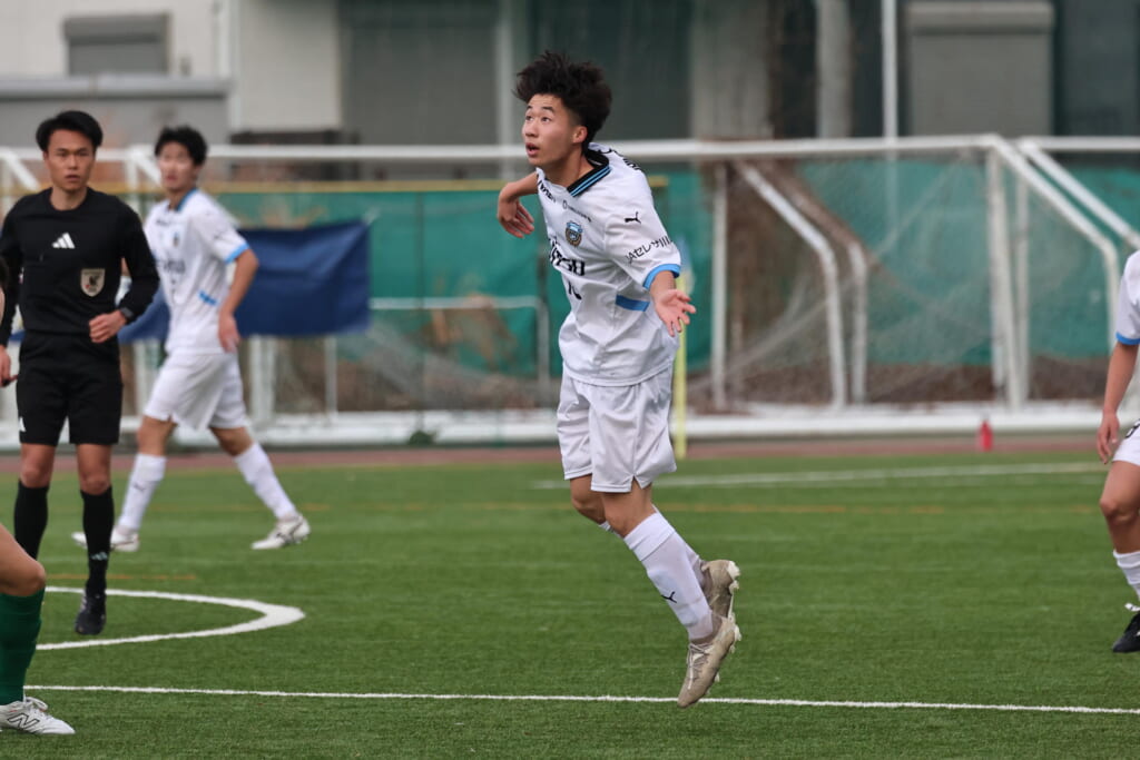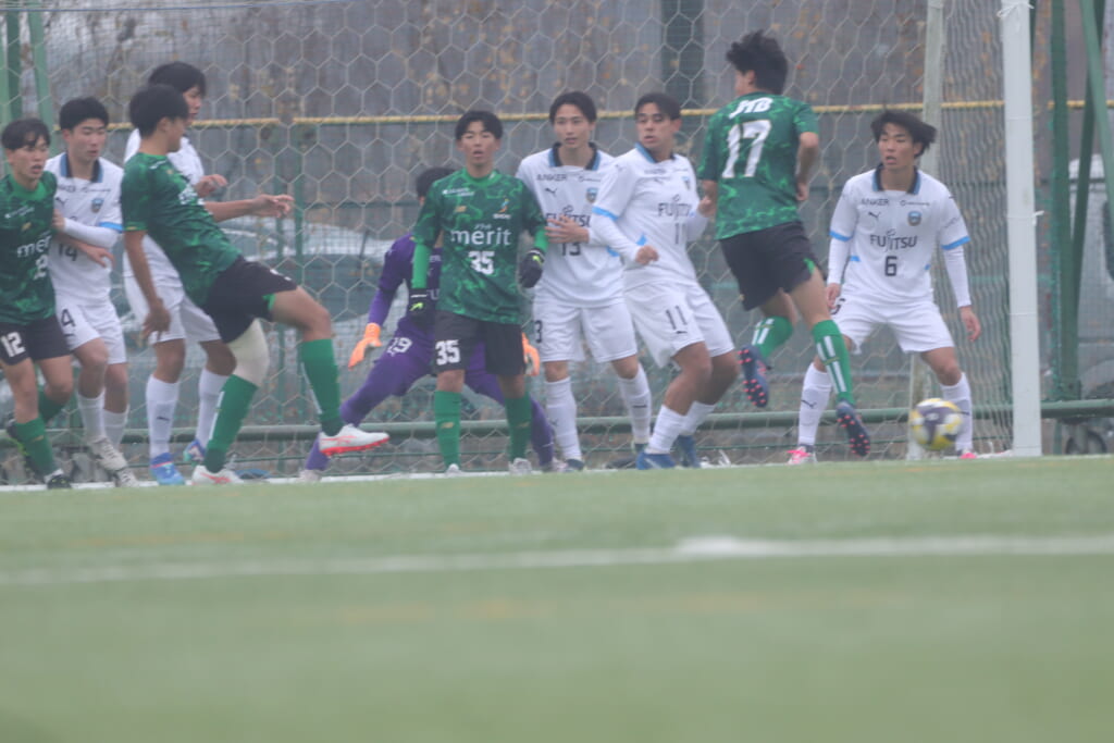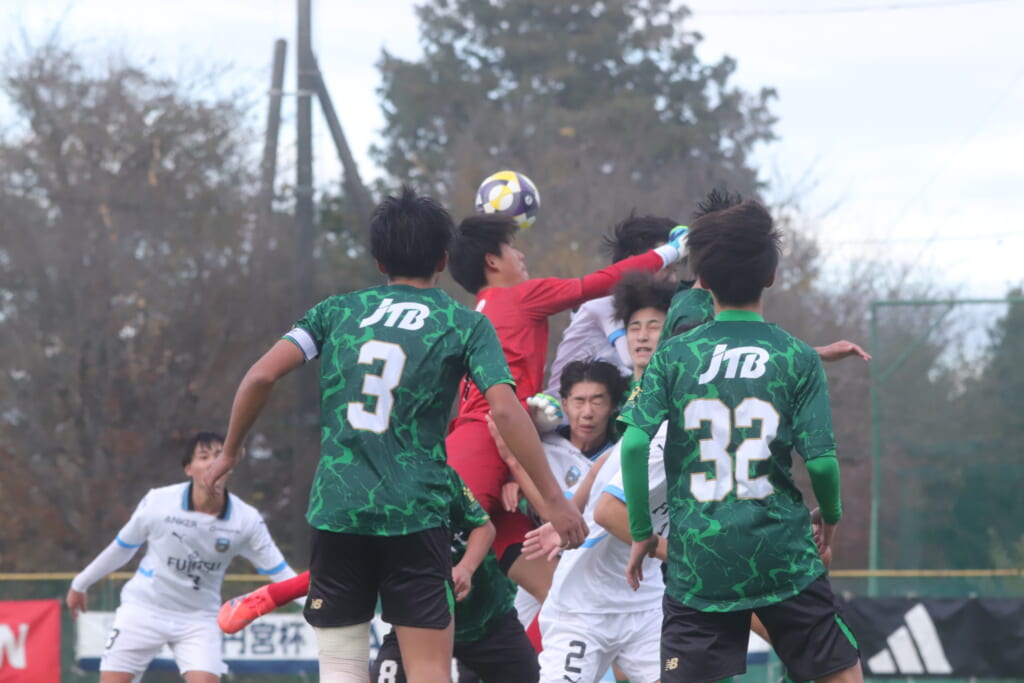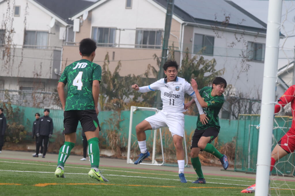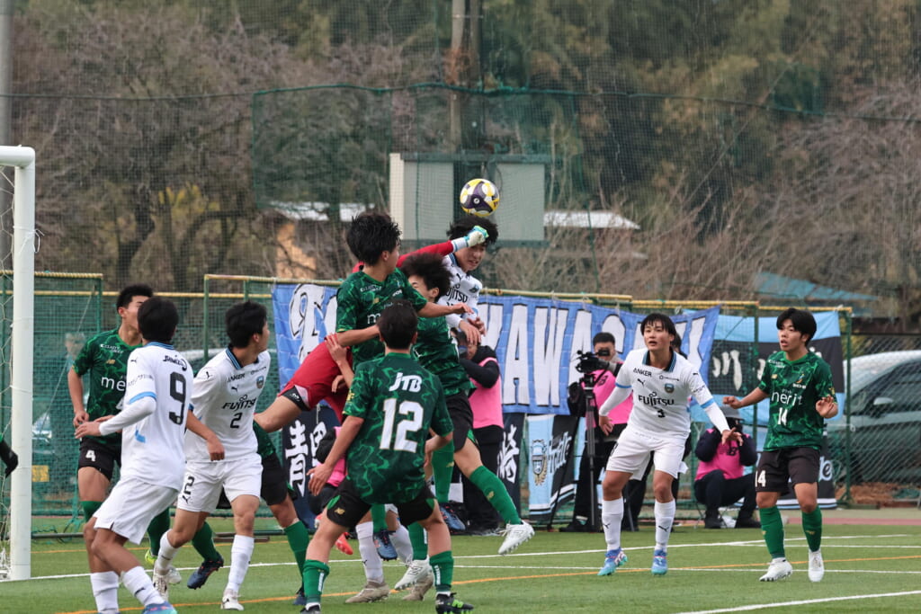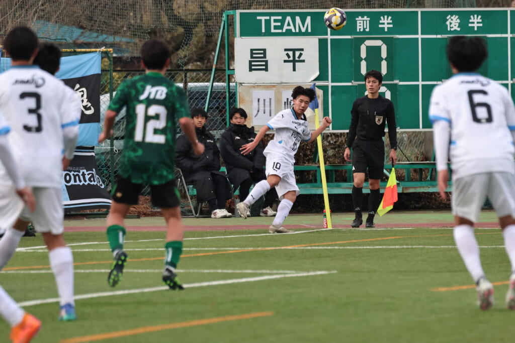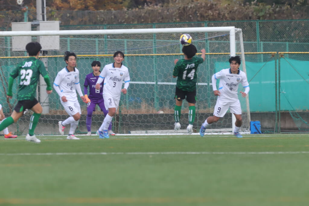 昌平高校の右コーナーキックとなり、山口が左足で入れていきますが、それをしのいだフロンターレ、