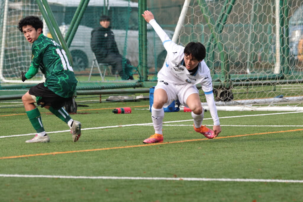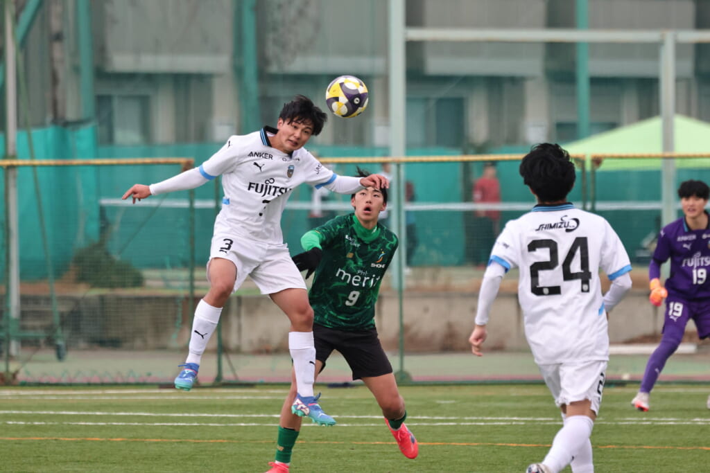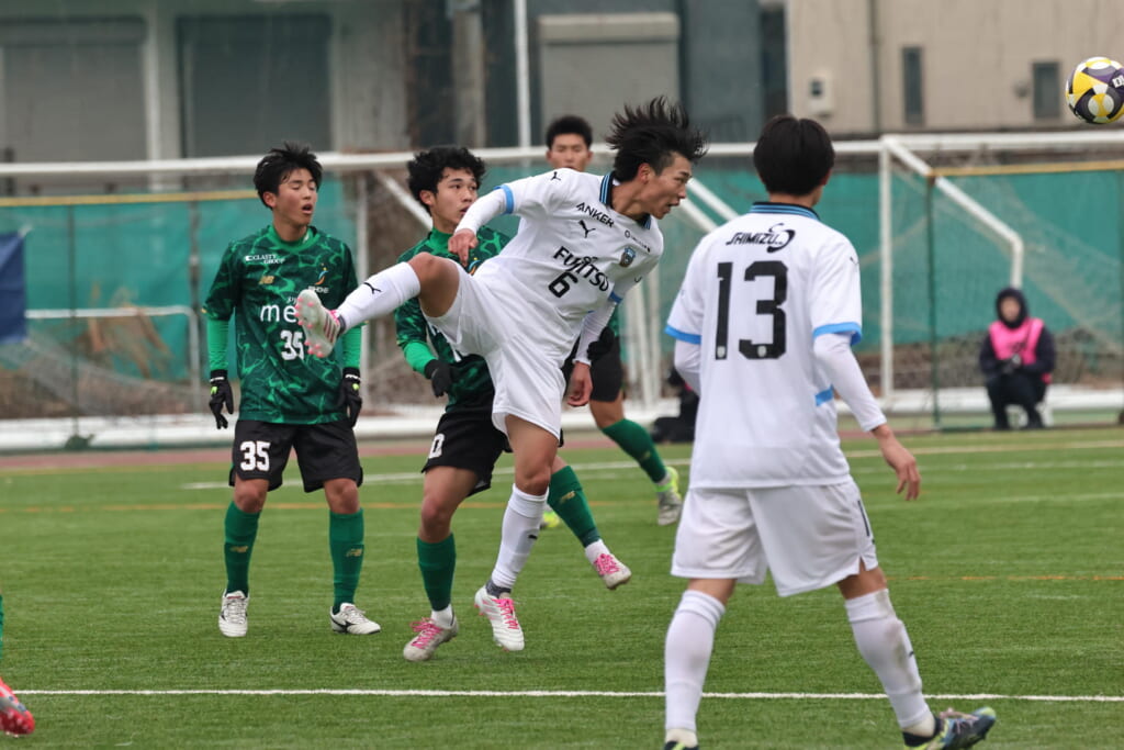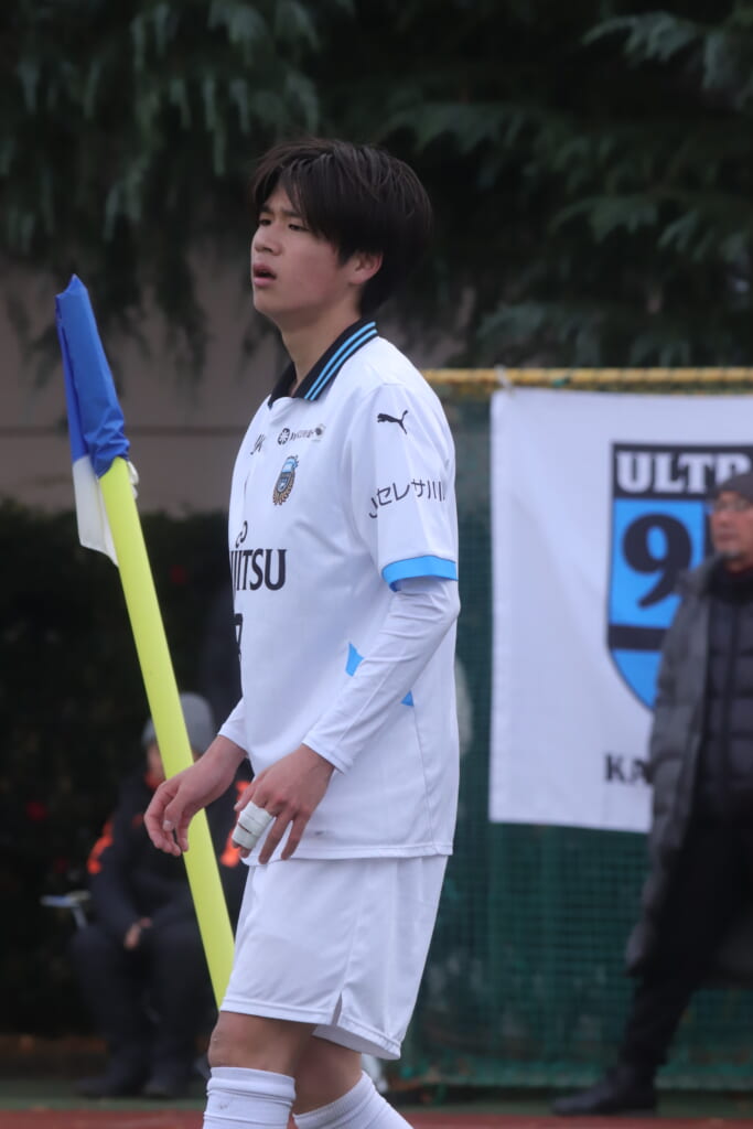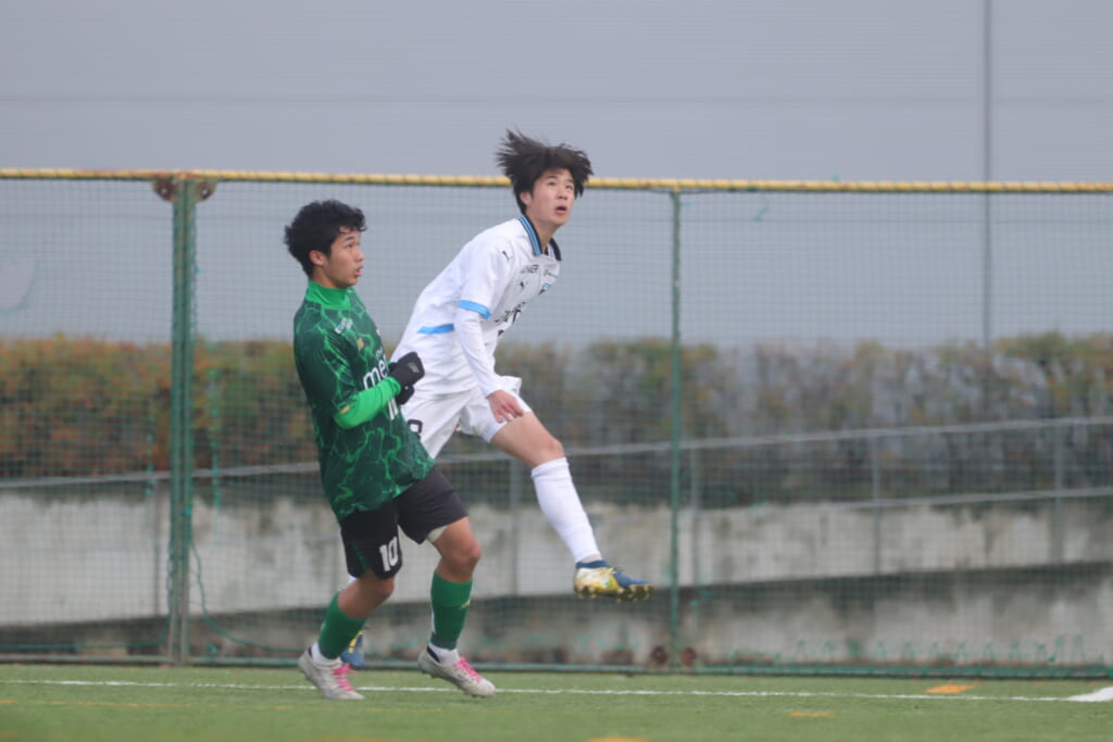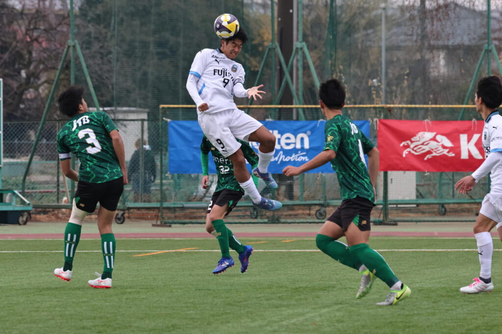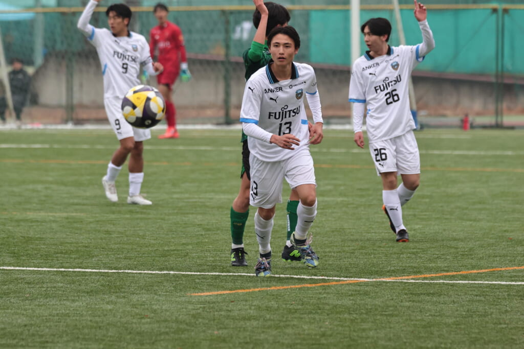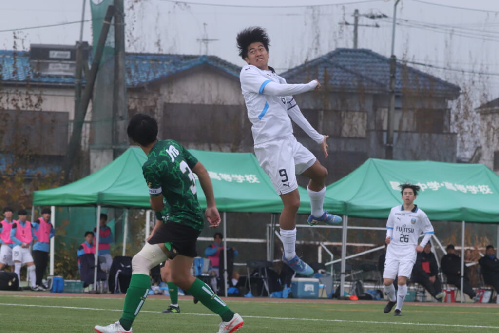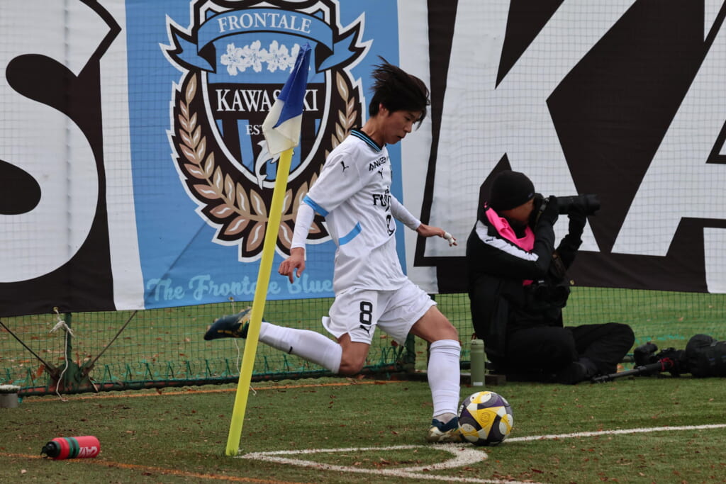 昌平高校の右コーナーキックとなり、山口が左足で入れていきますが、それをしのいだフロンターレ、