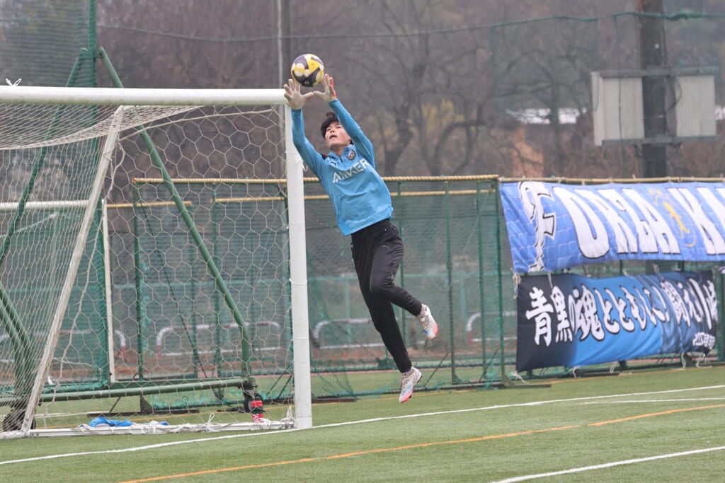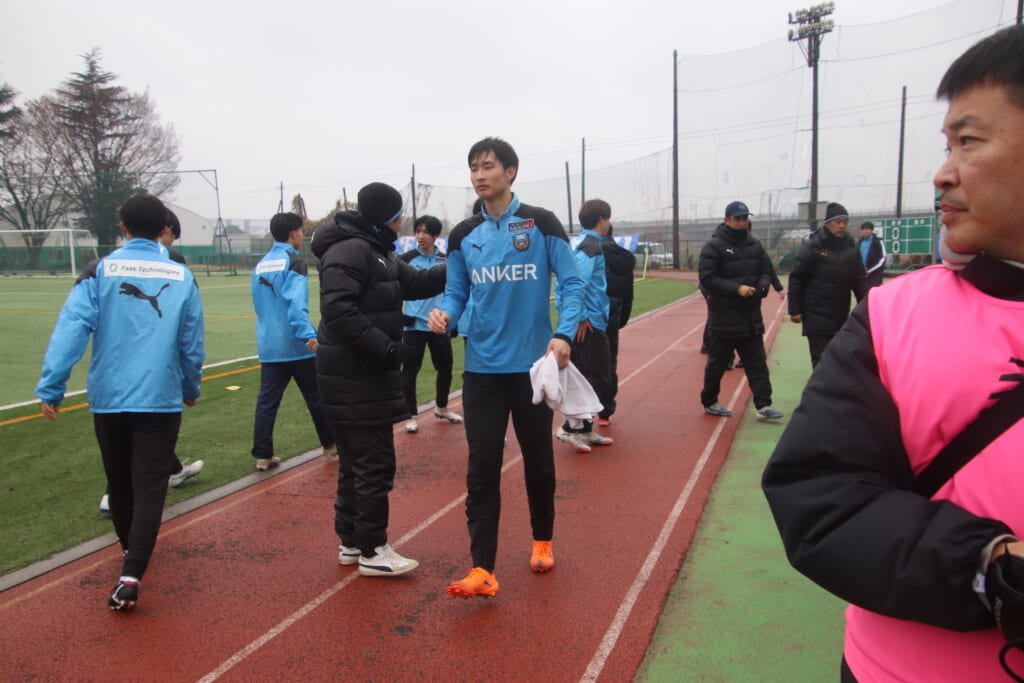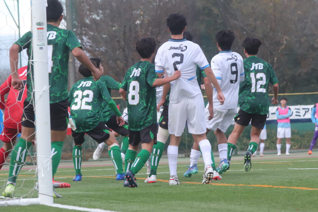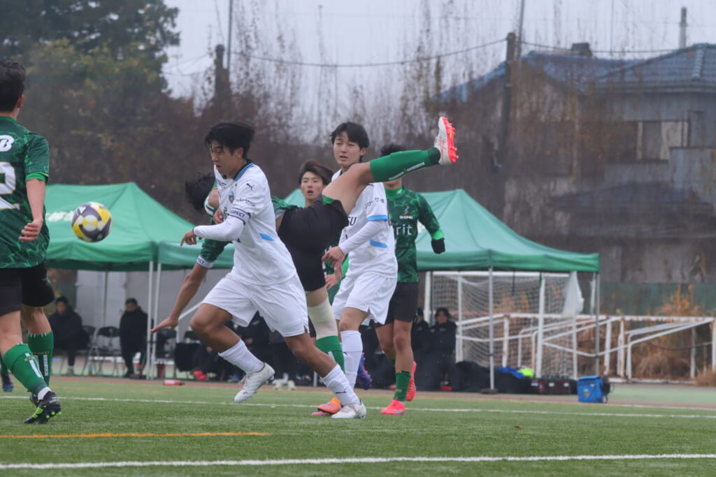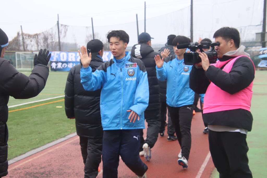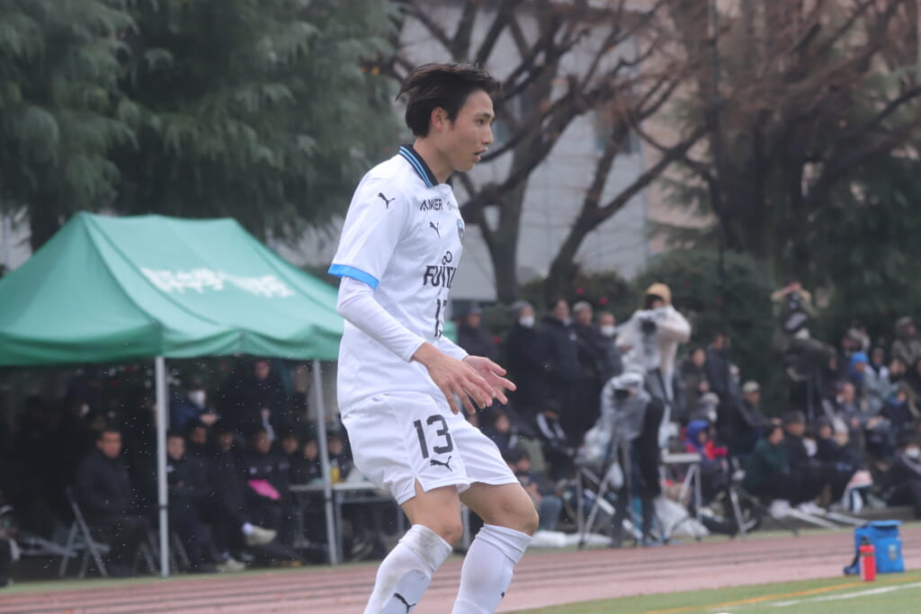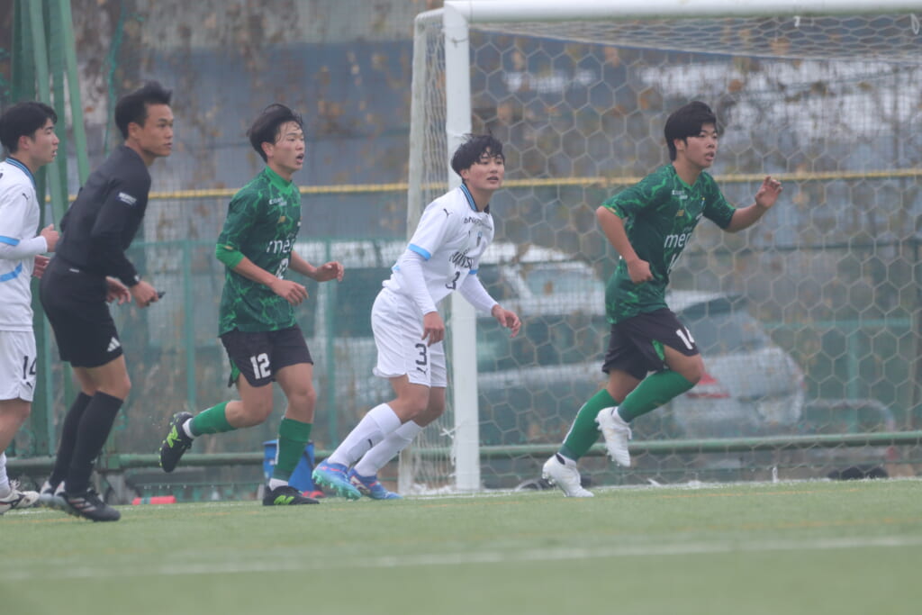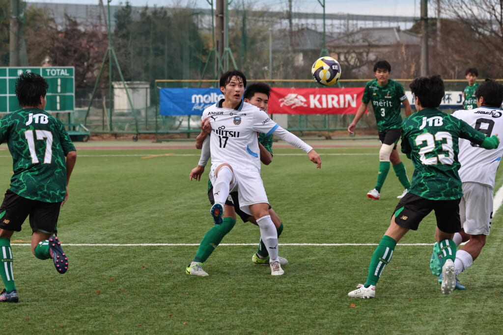昌平高校の右コーナーキックとなり、山口が左足で入れていきますが、それをしのいだフロンターレ、