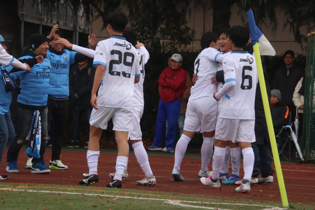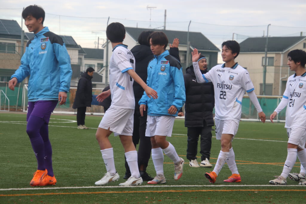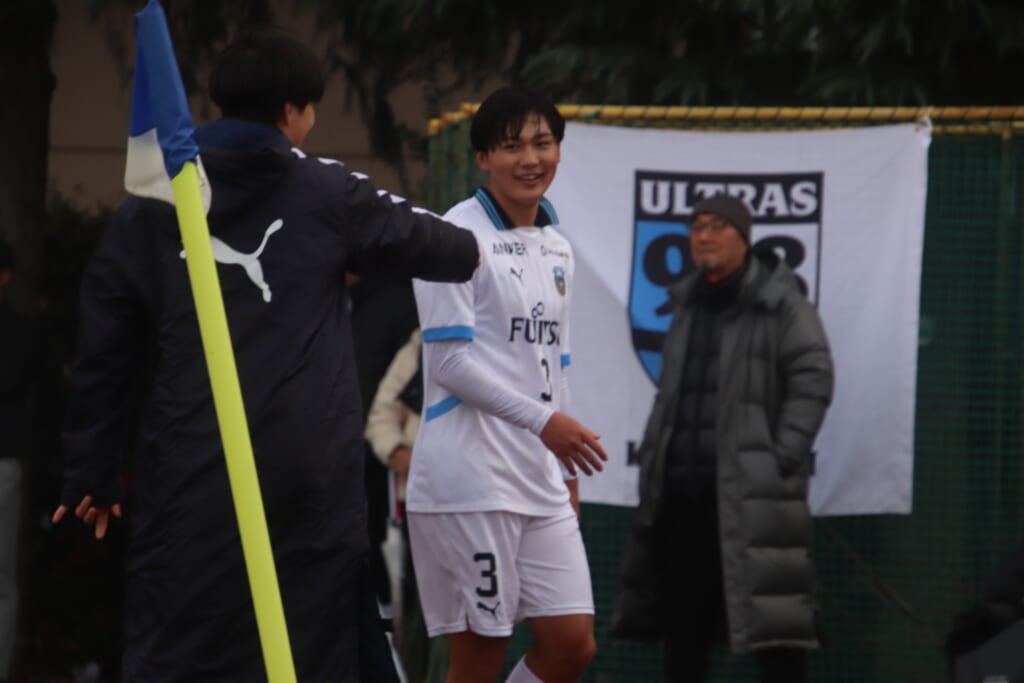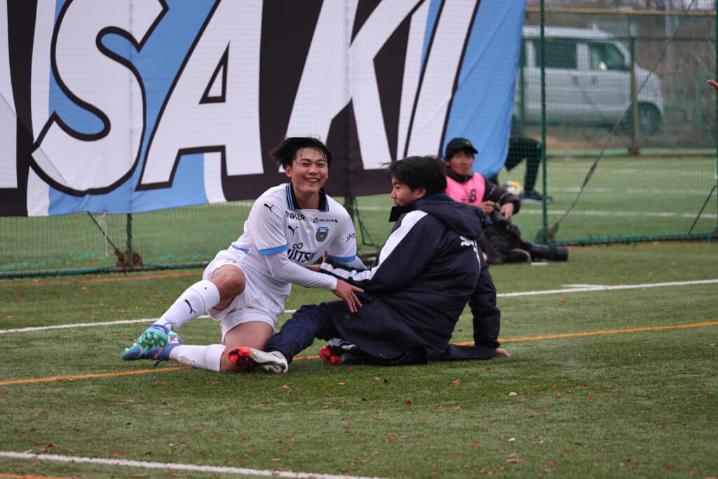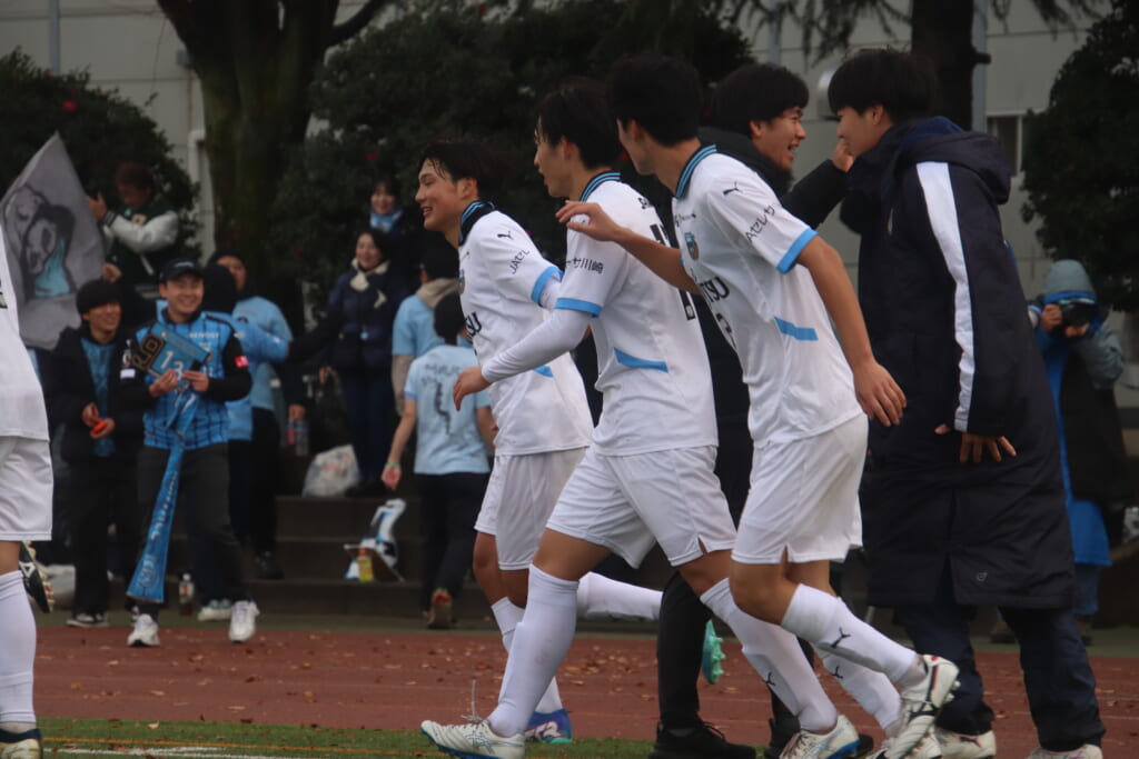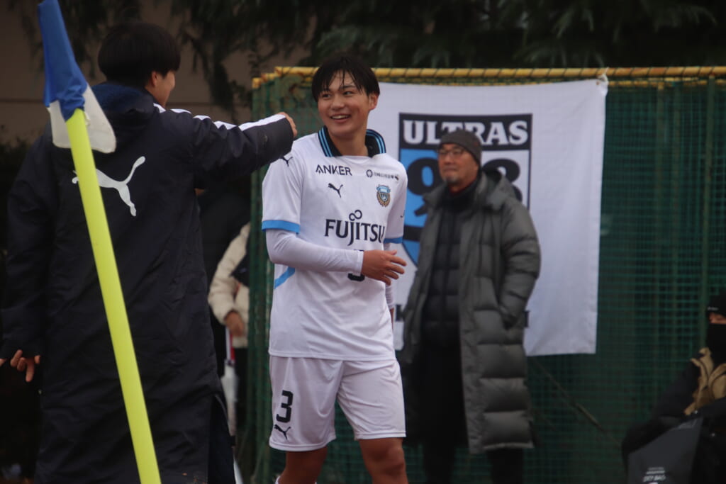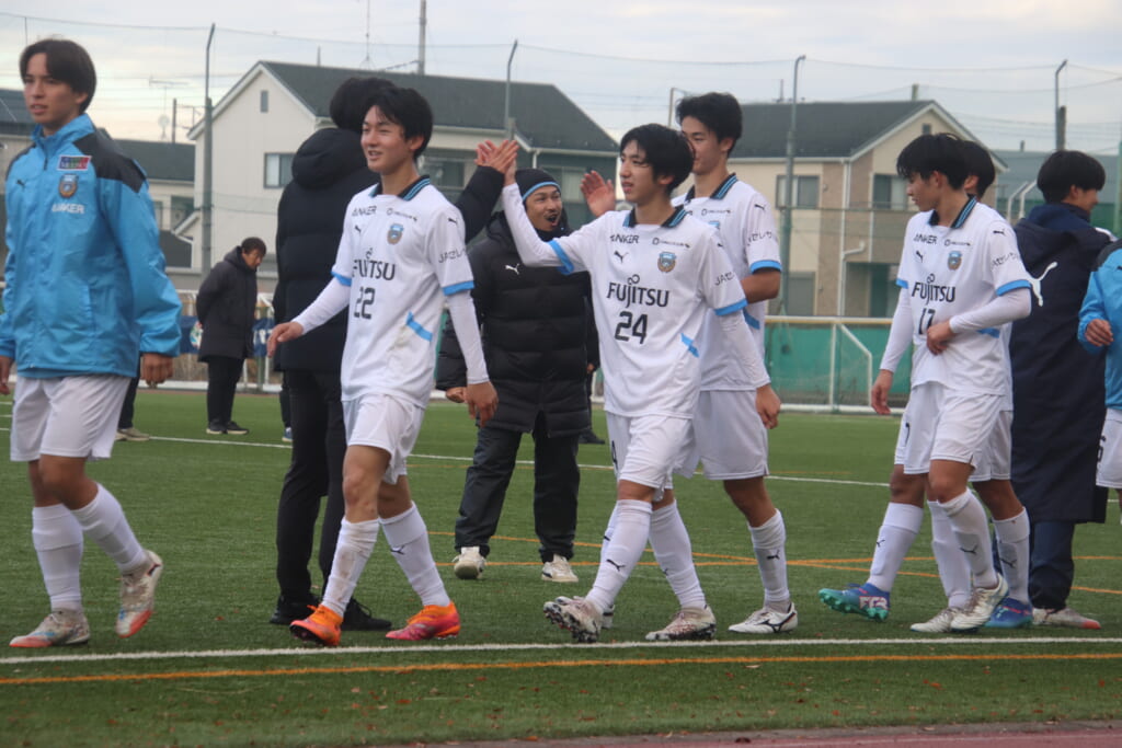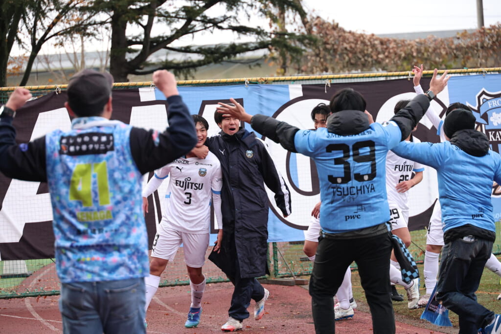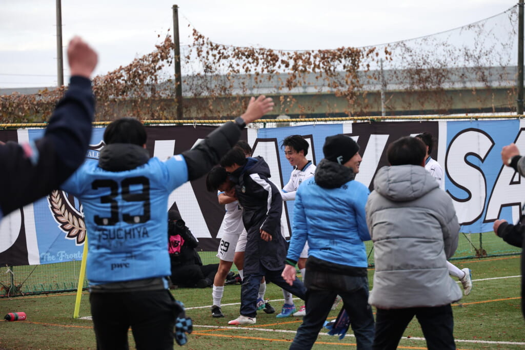 シュートを打つとこれが決まり、2-1。藤田は2年目でプレミアリーグ初ゴール。横で見守っていた家族やサポーター、この日はメンバー外でチームのサポートに徹していた林駿佑や松澤成音のもとへ駆けていくフロンターレの選手たち。