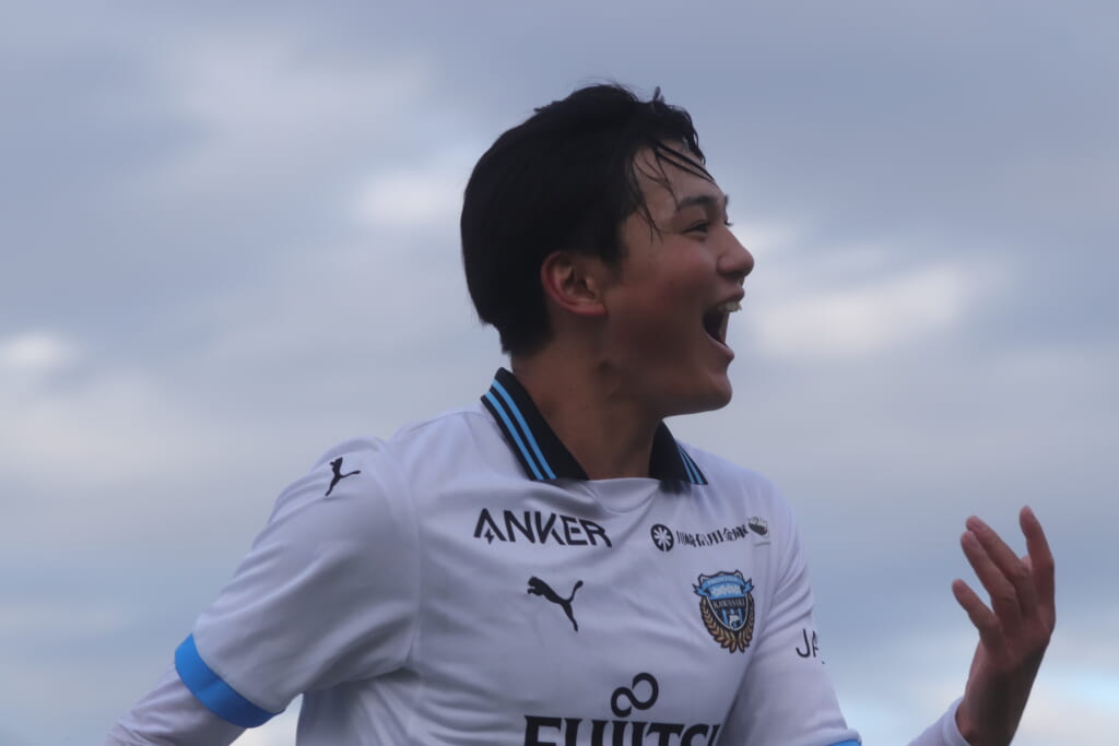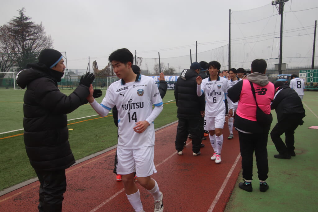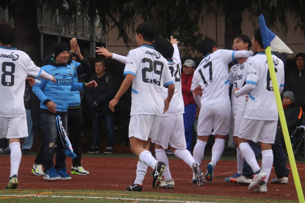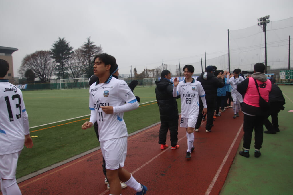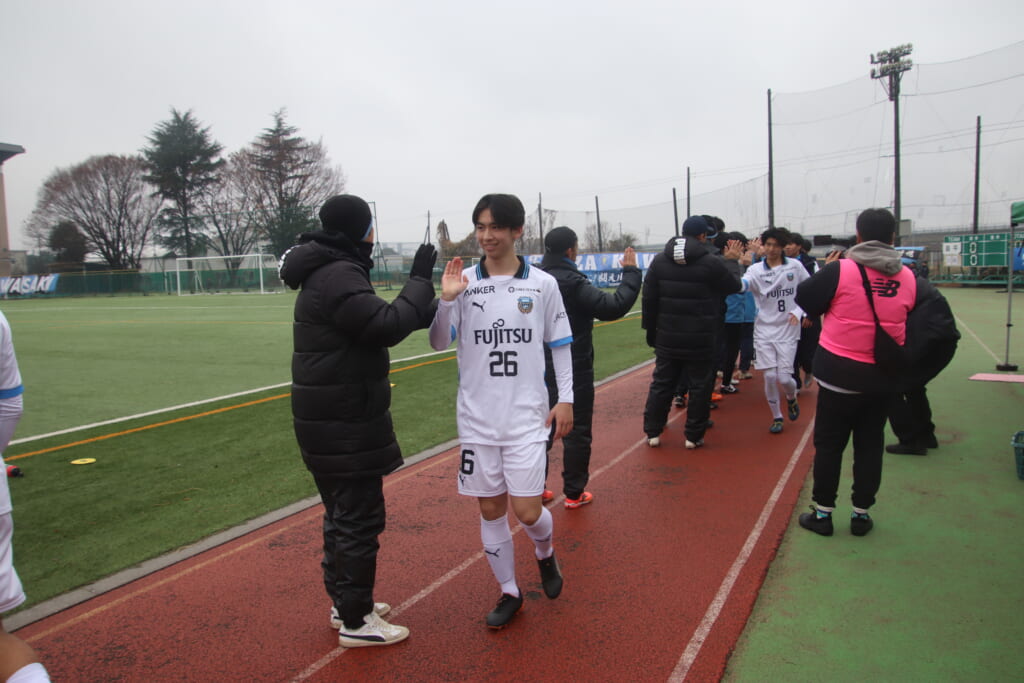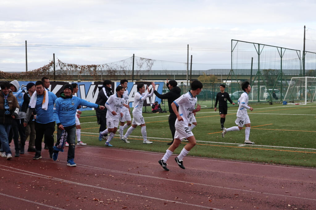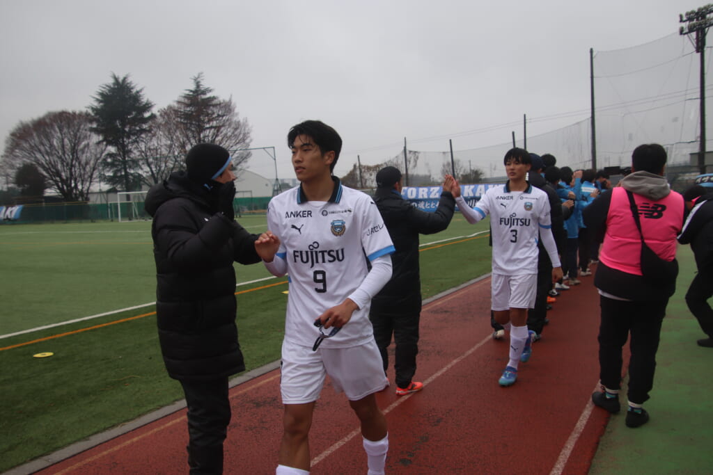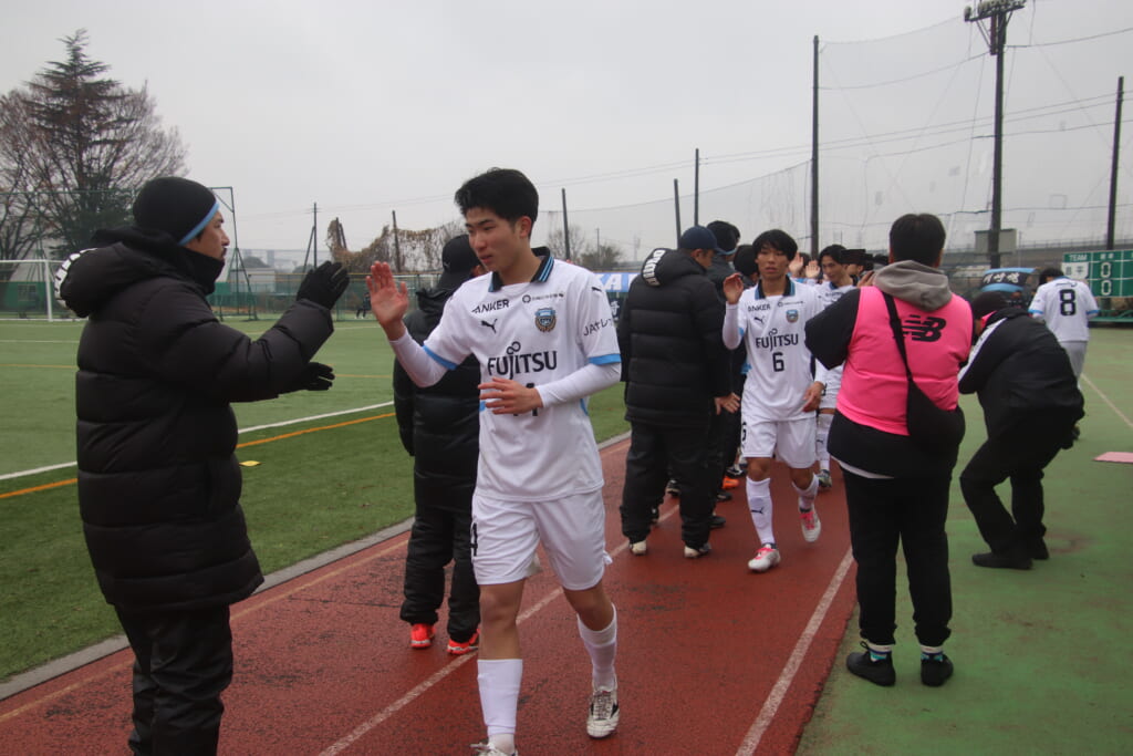 シュートを打つとこれが決まり、2-1。藤田は2年目でプレミアリーグ初ゴール。横で見守っていた家族やサポーター、この日はメンバー外でチームのサポートに徹していた林駿佑や松澤成音のもとへ駆けていくフロンターレの選手たち。