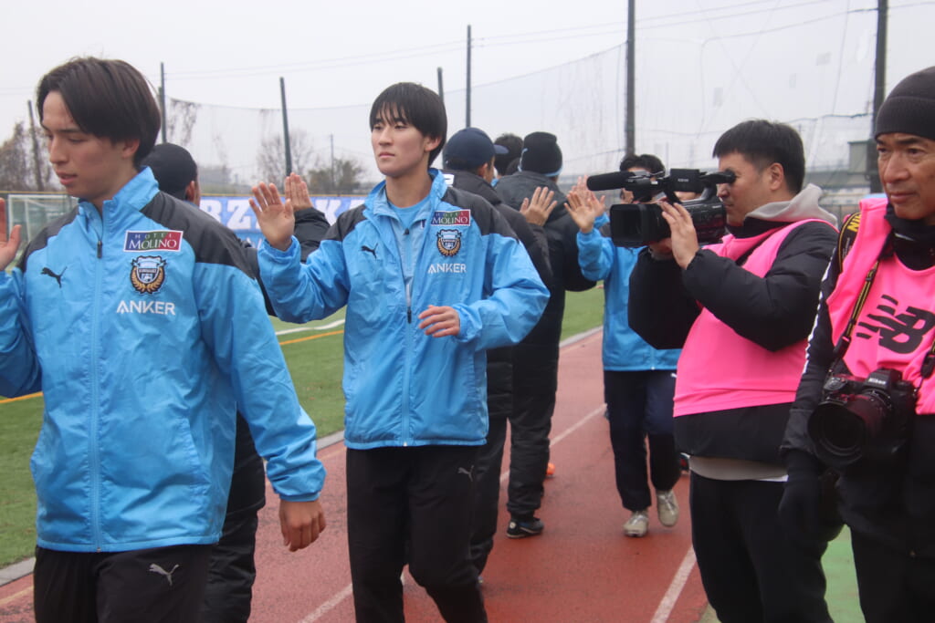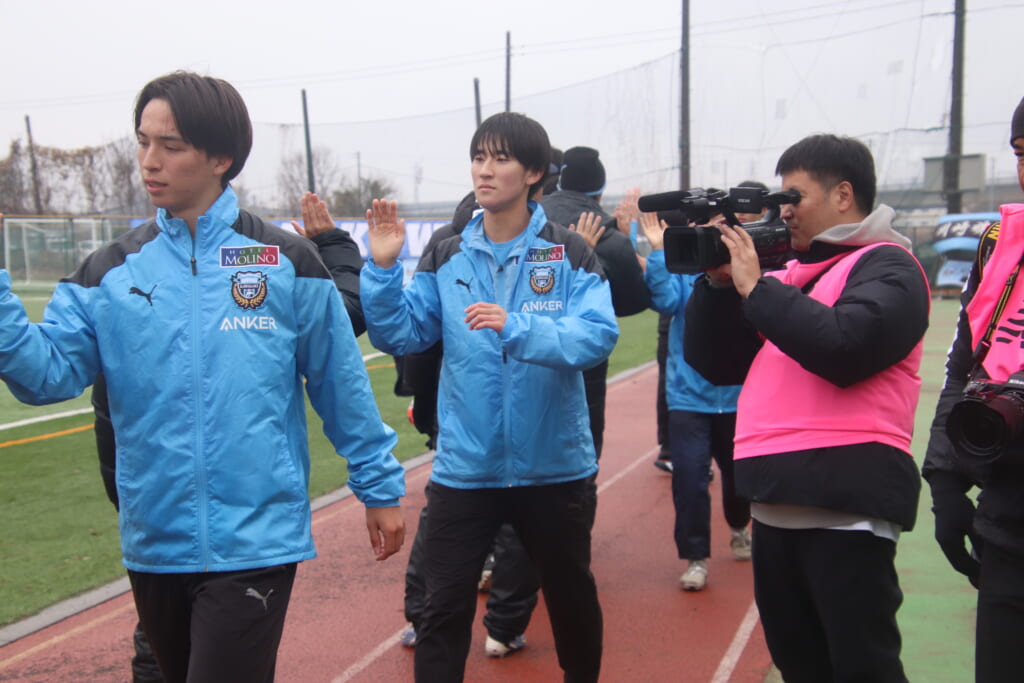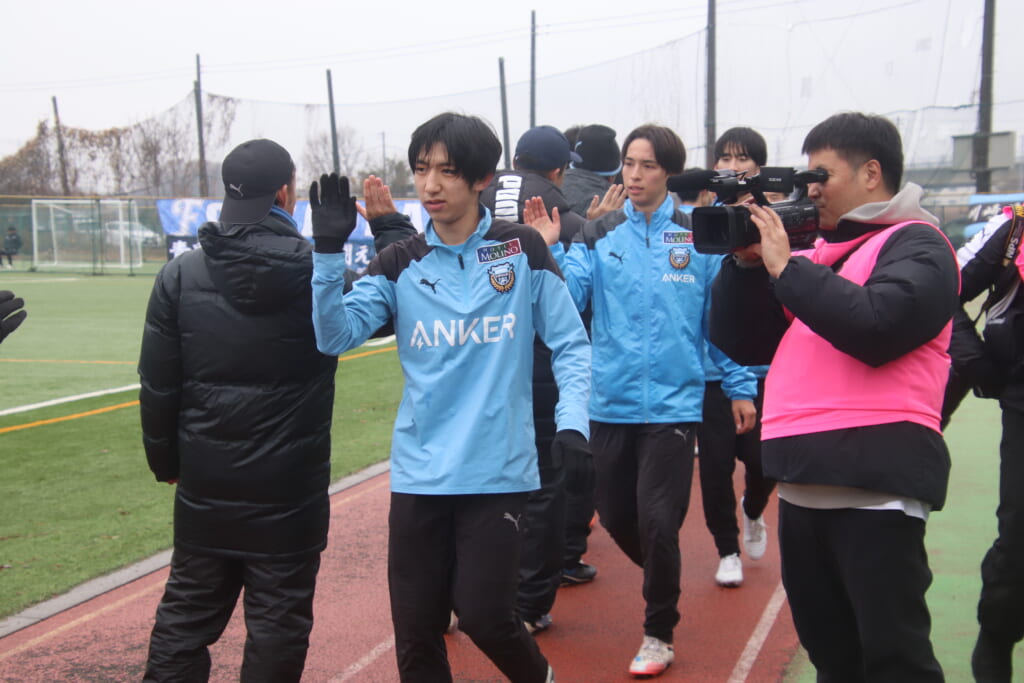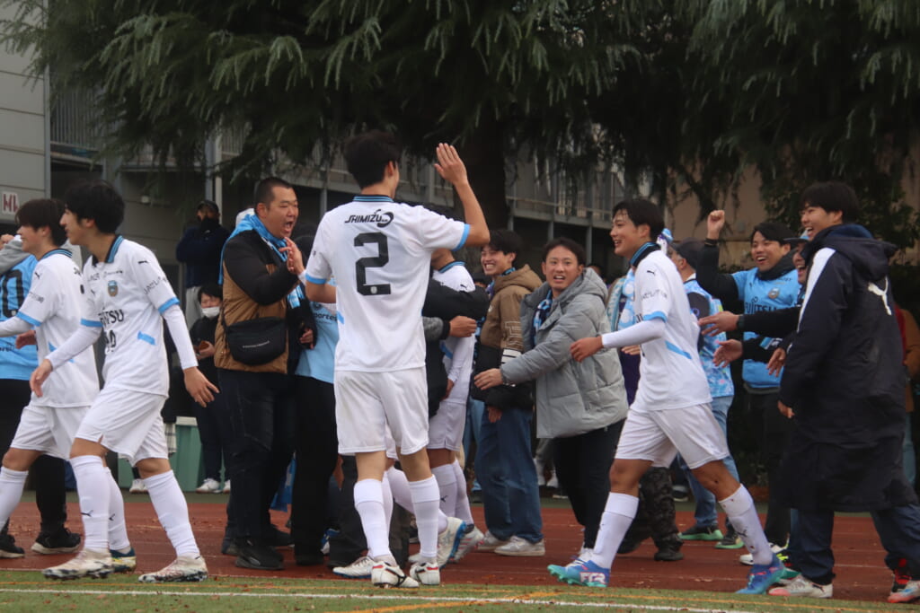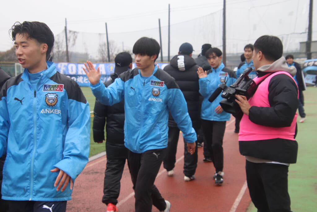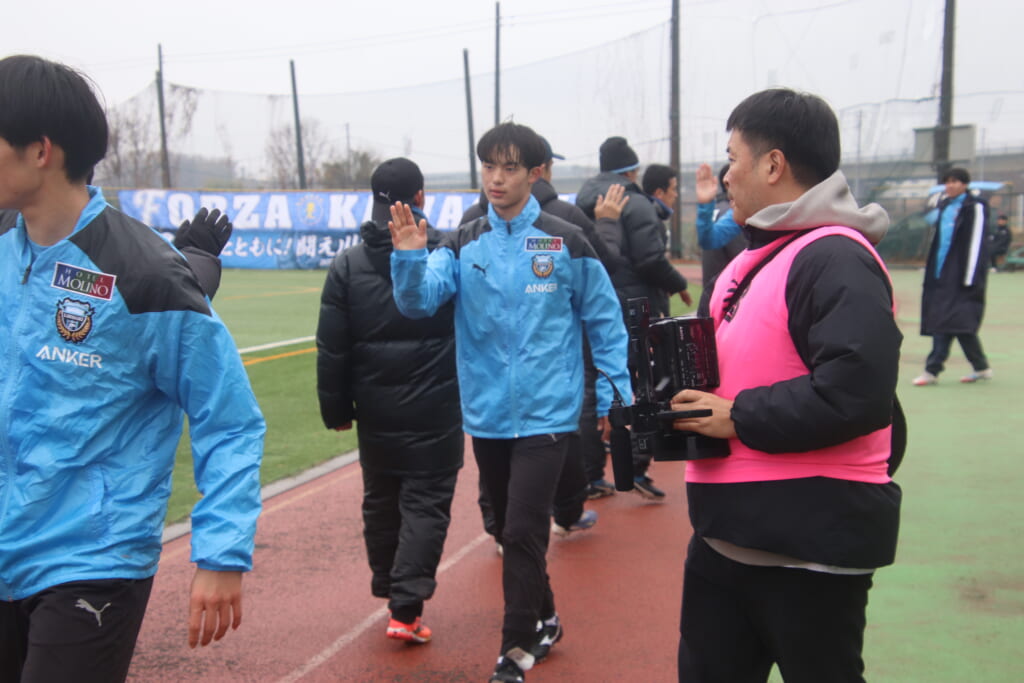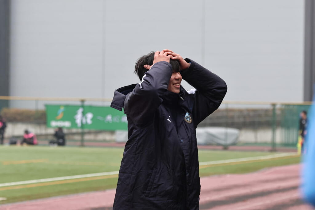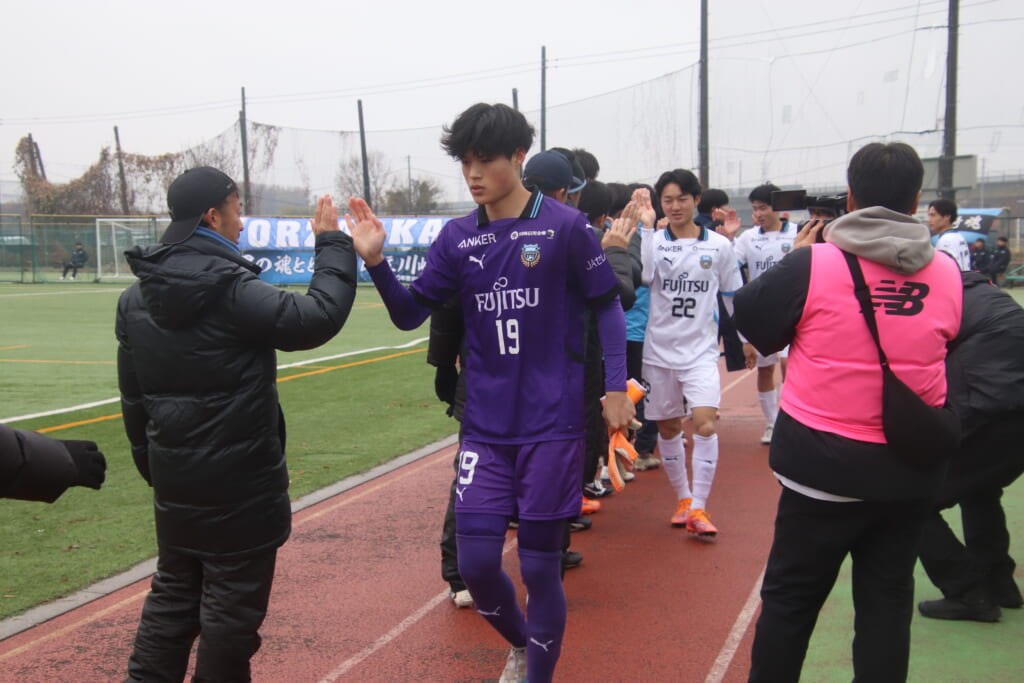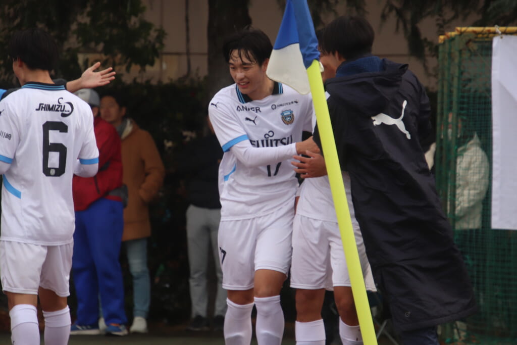 シュートを打つとこれが決まり、2-1。藤田は2年目でプレミアリーグ初ゴール。横で見守っていた家族やサポーター、この日はメンバー外でチームのサポートに徹していた林駿佑や松澤成音のもとへ駆けていくフロンターレの選手たち。