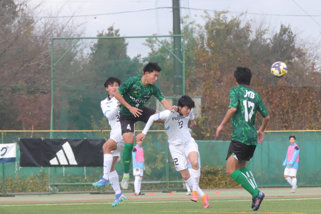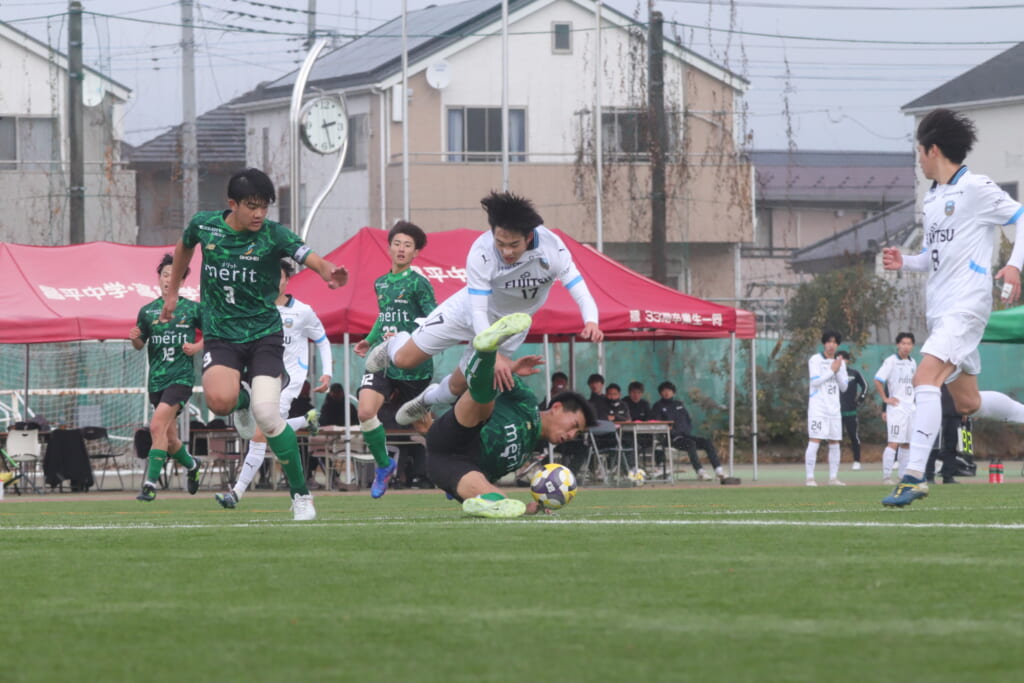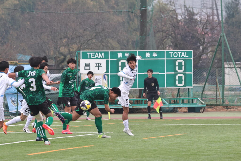 セカンドボールを拾ったフロンターレは、柏村が右クロス。遠いサイドにステンパーが飛び込みますが、ここでも昌平高校は体を張り、ブロック。