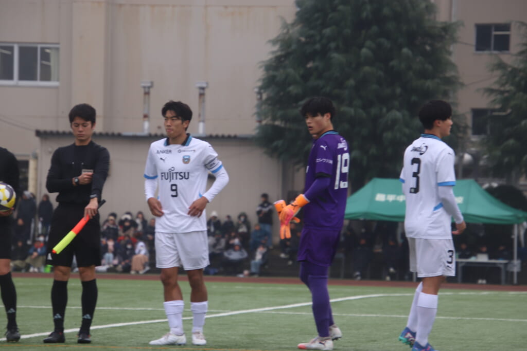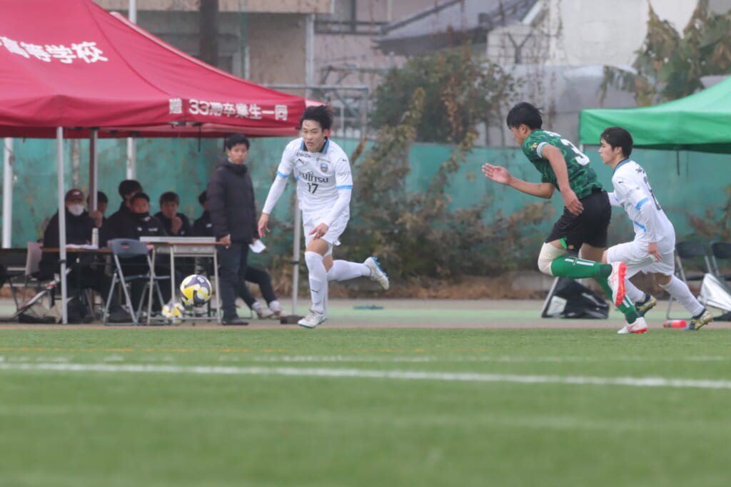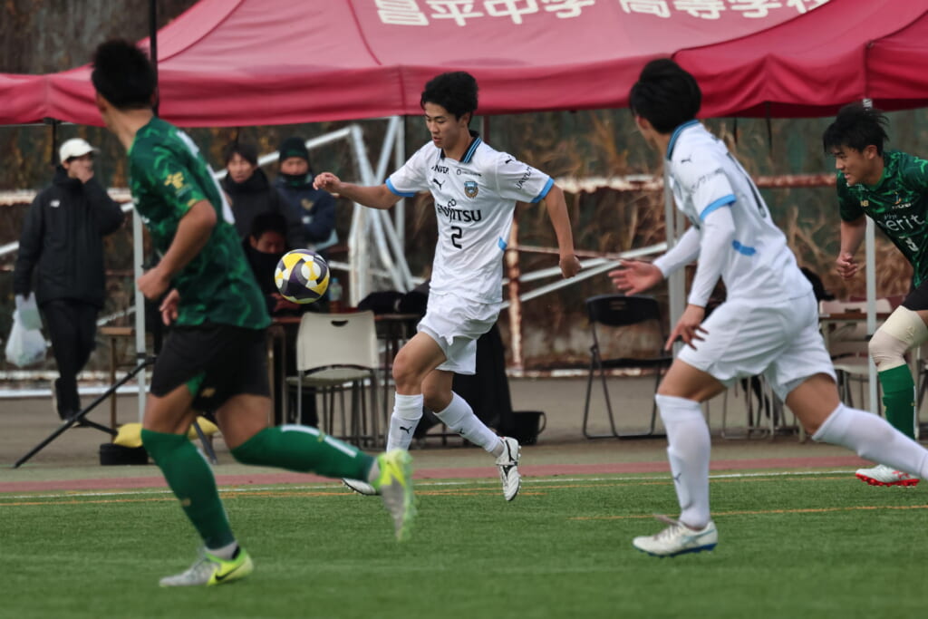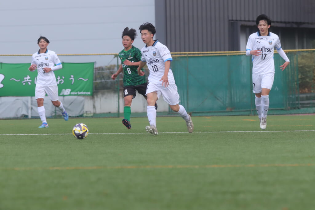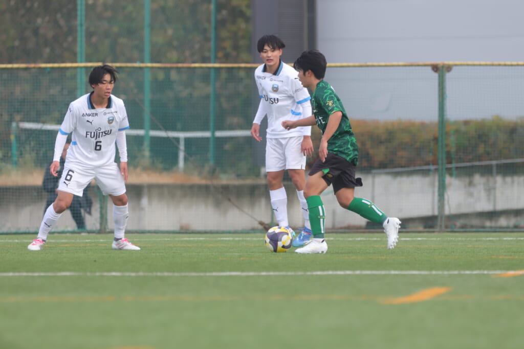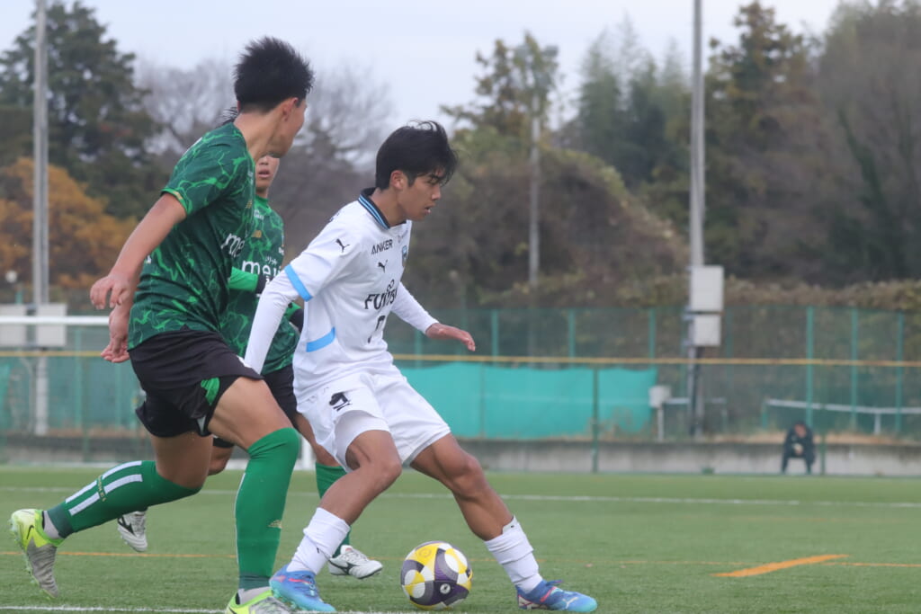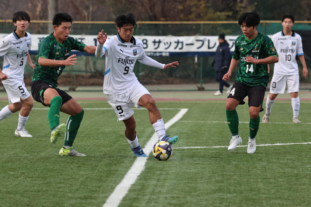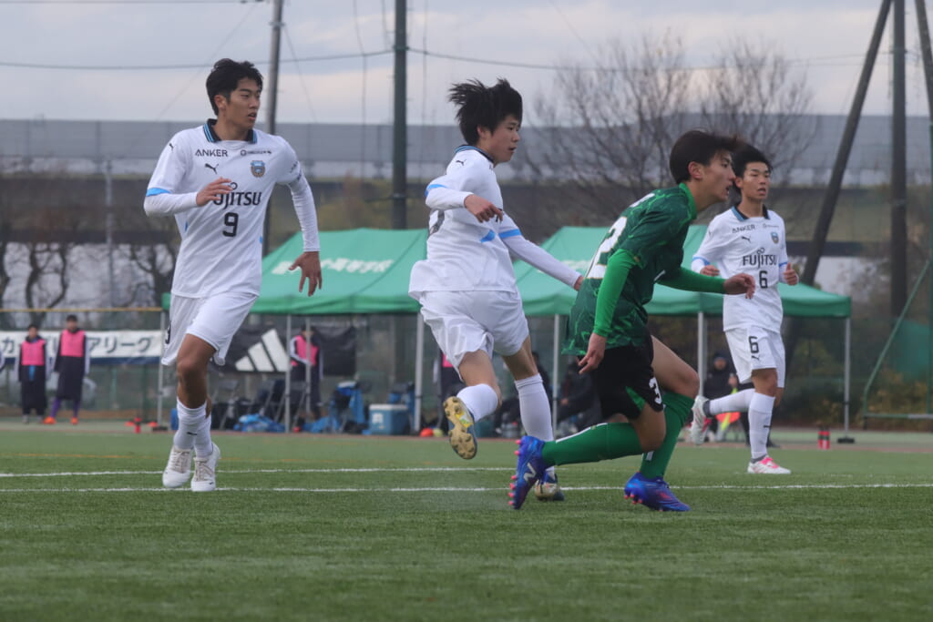 同点のゴールを狙い、前に出てくる昌平高校に対し、関が対応。前に行かせず、再び自分たちのボールにしていくフロンターレ。