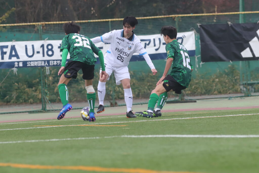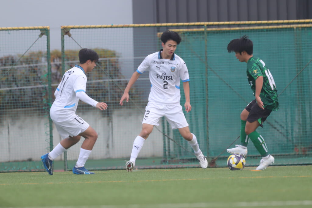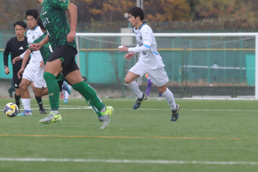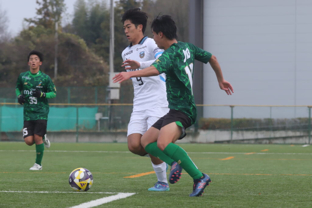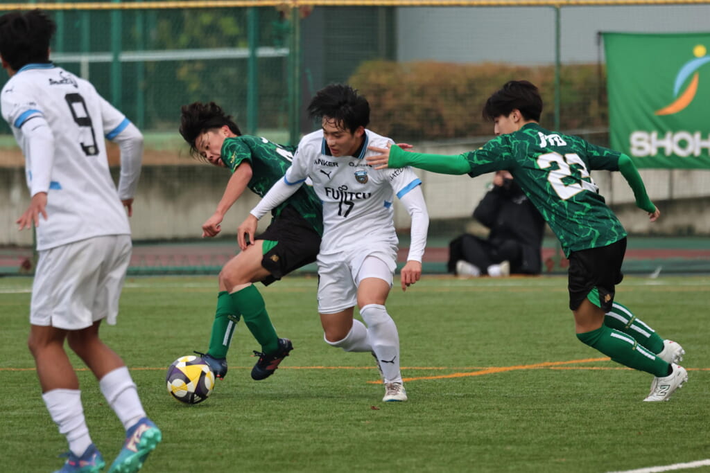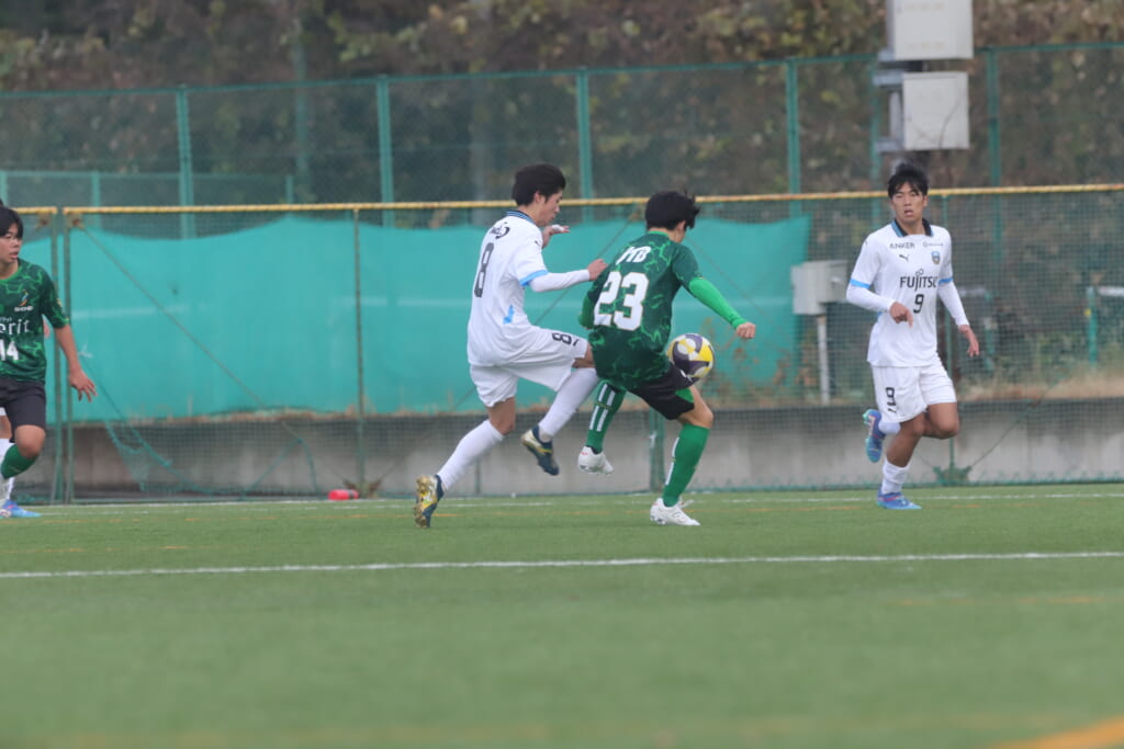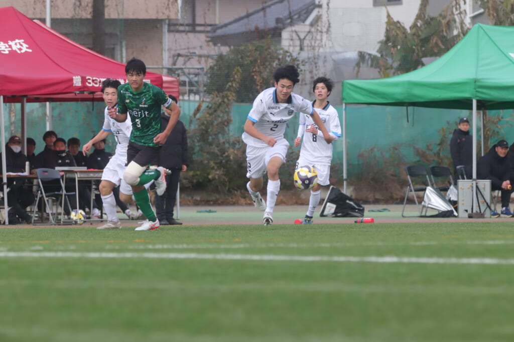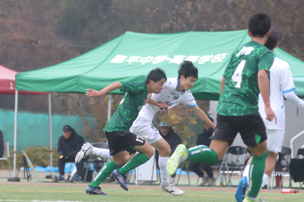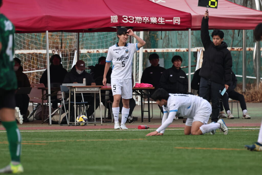 同点のゴールを狙い、前に出てくる昌平高校に対し、関が対応。前に行かせず、再び自分たちのボールにしていくフロンターレ。