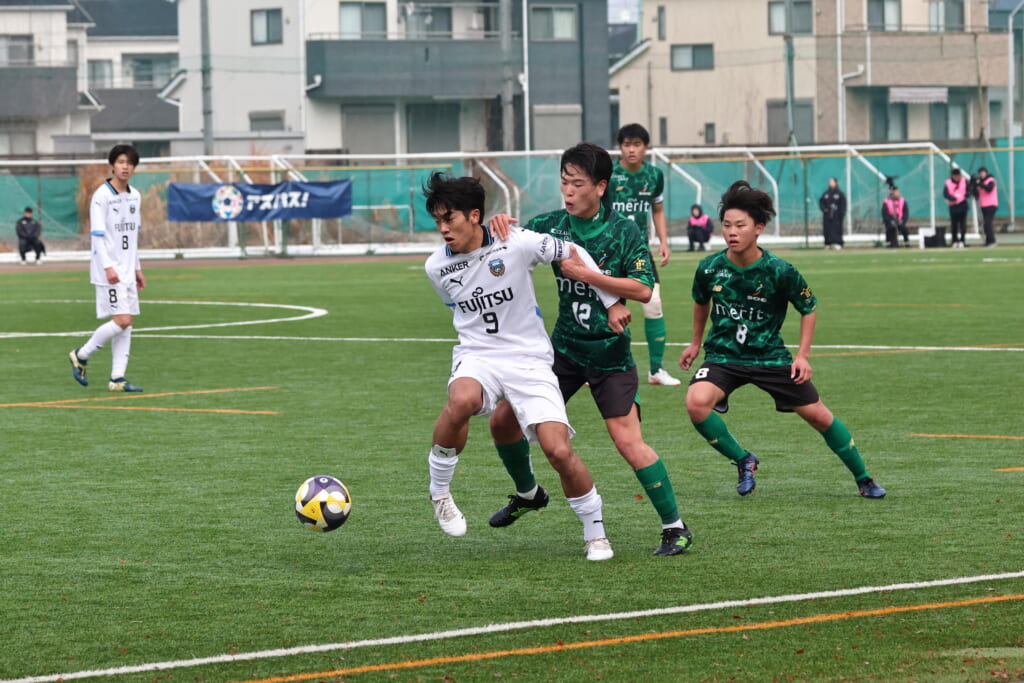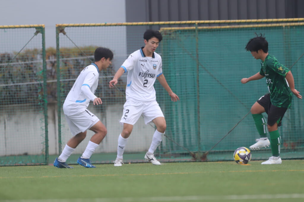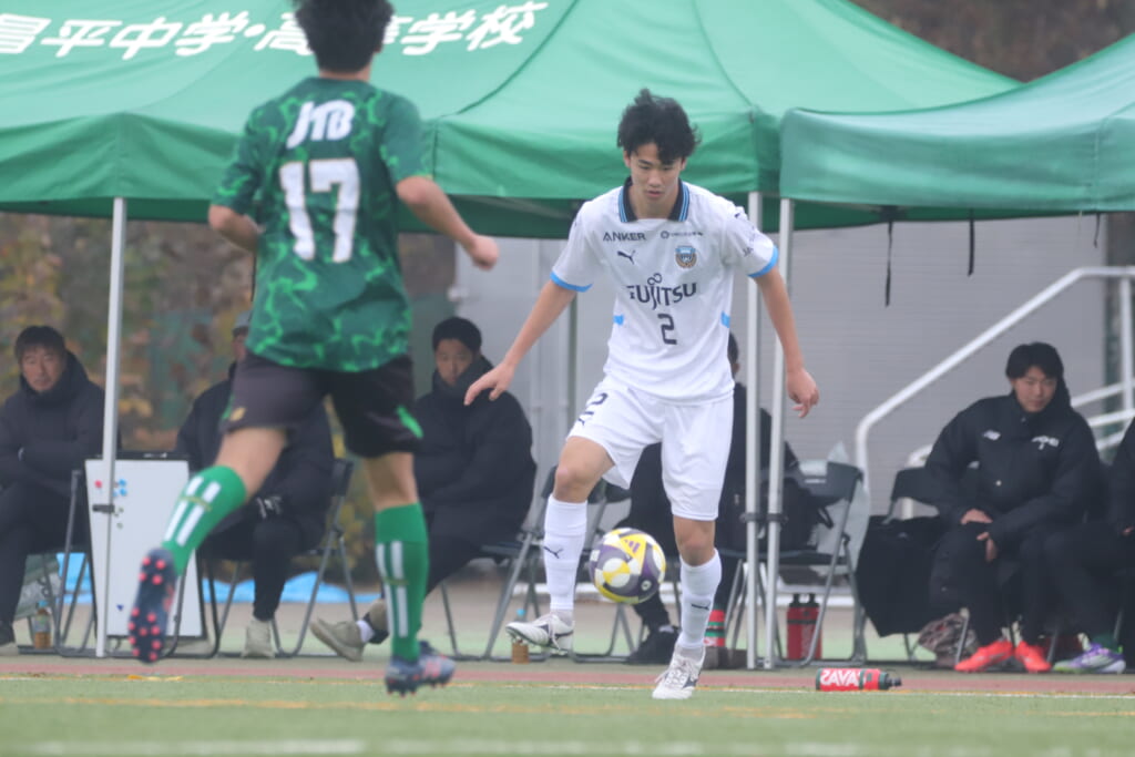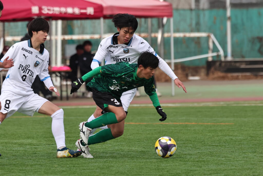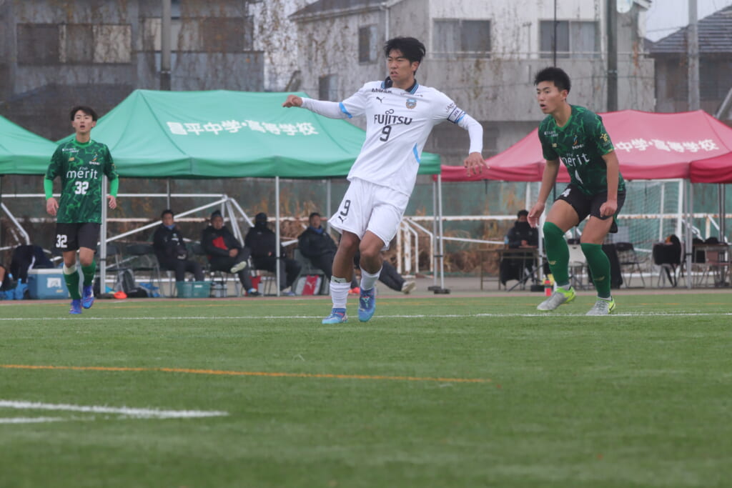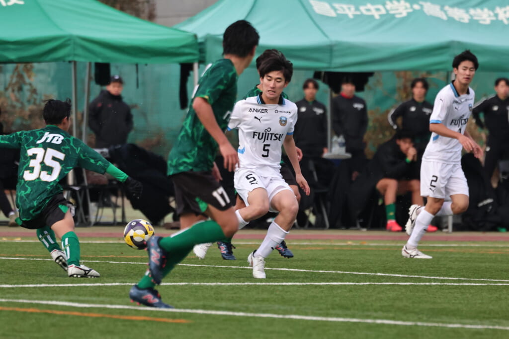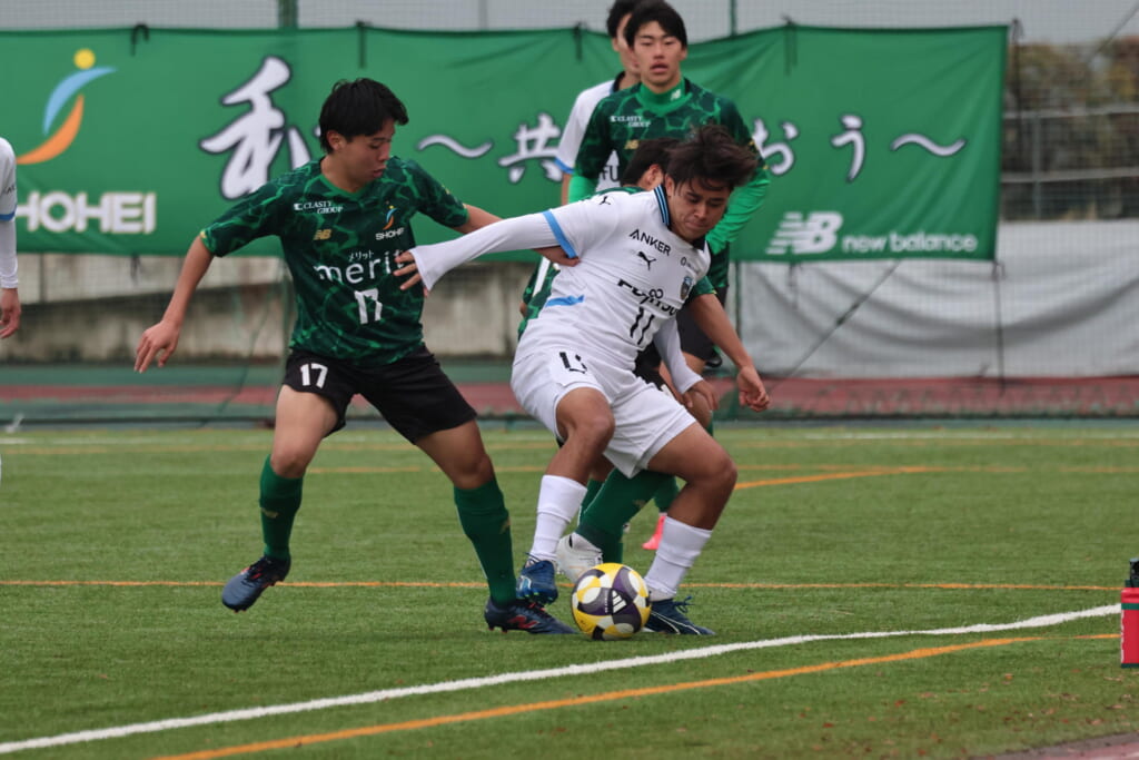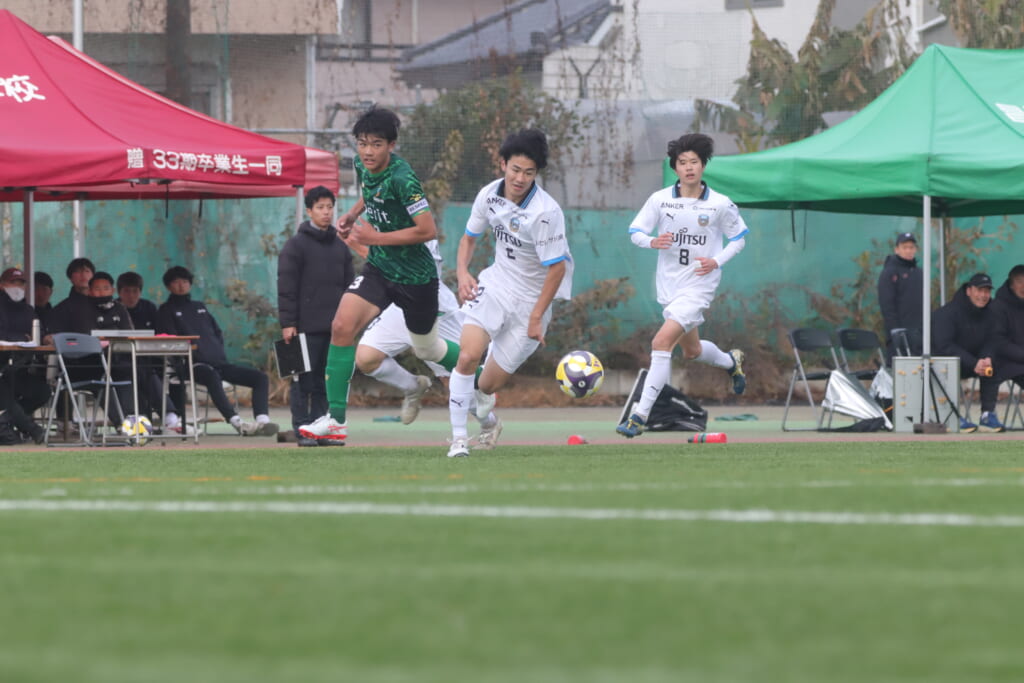 同点のゴールを狙い、前に出てくる昌平高校に対し、関が対応。前に行かせず、再び自分たちのボールにしていくフロンターレ。