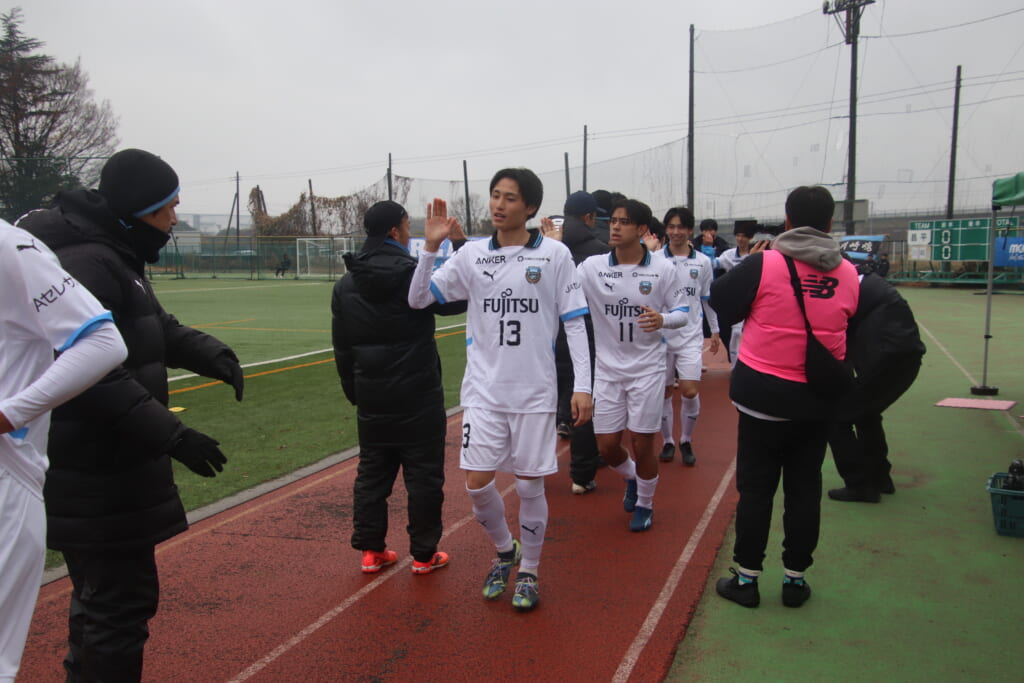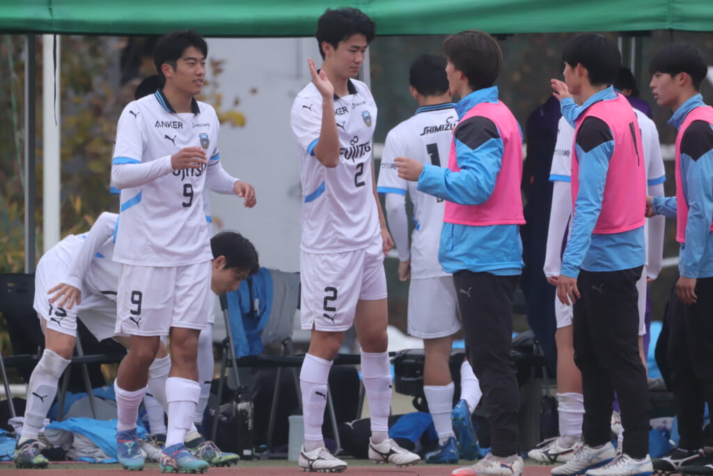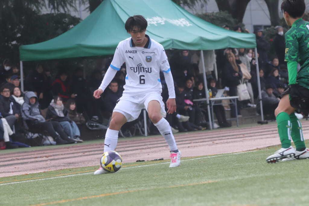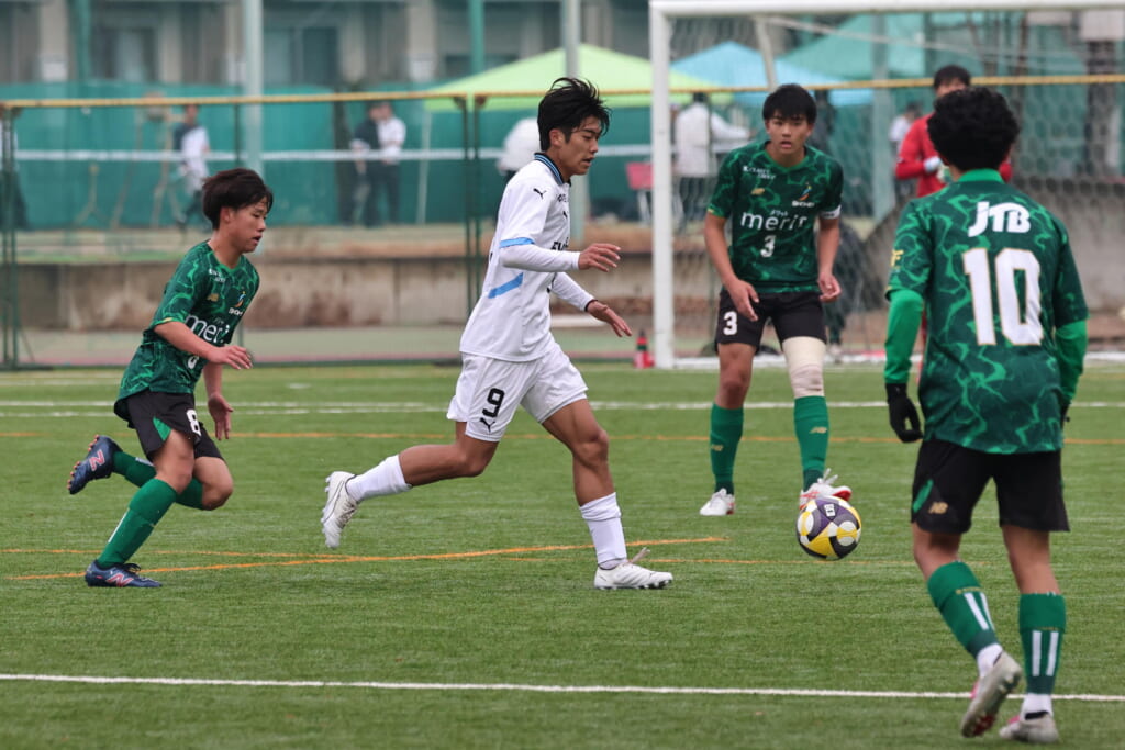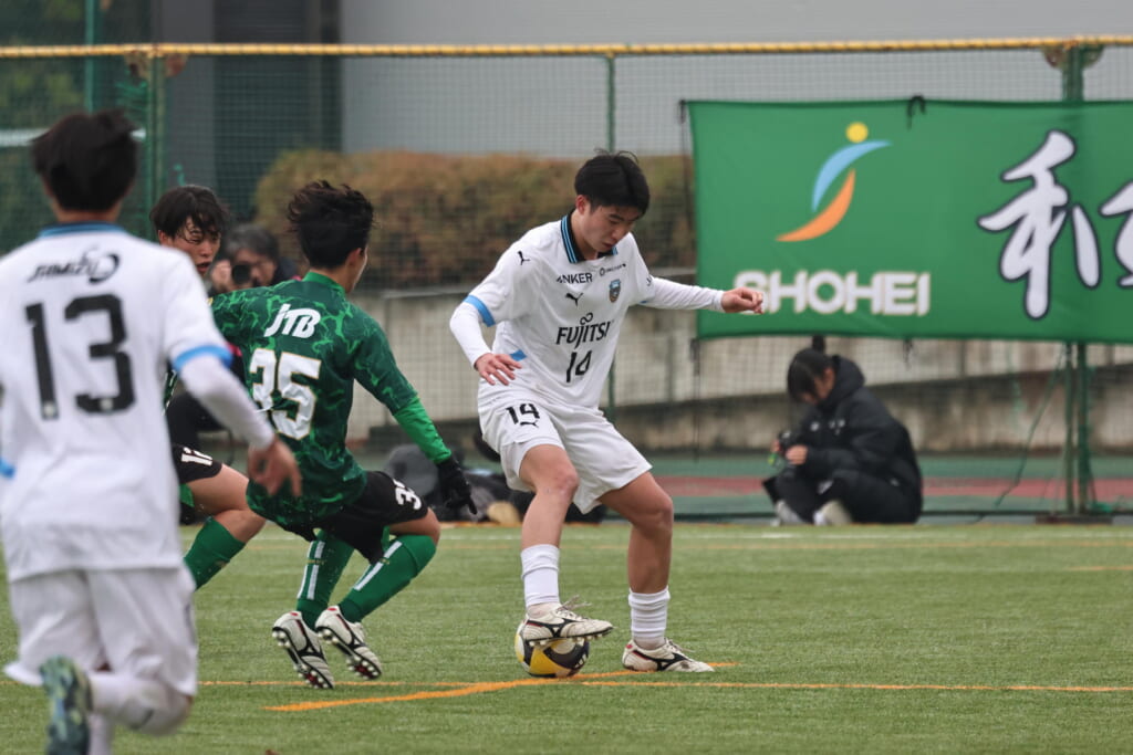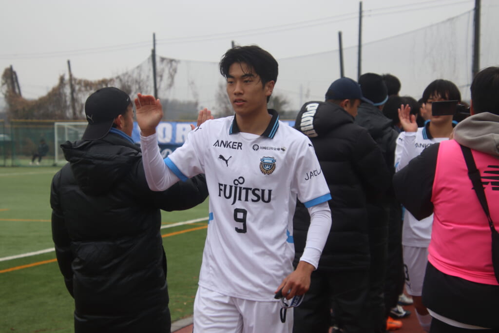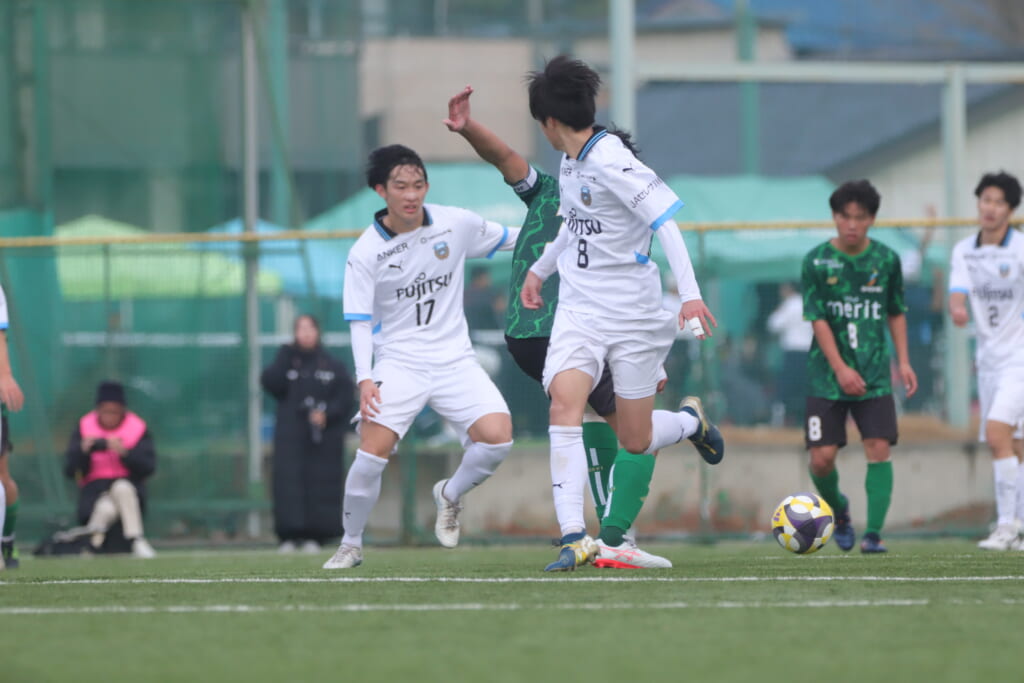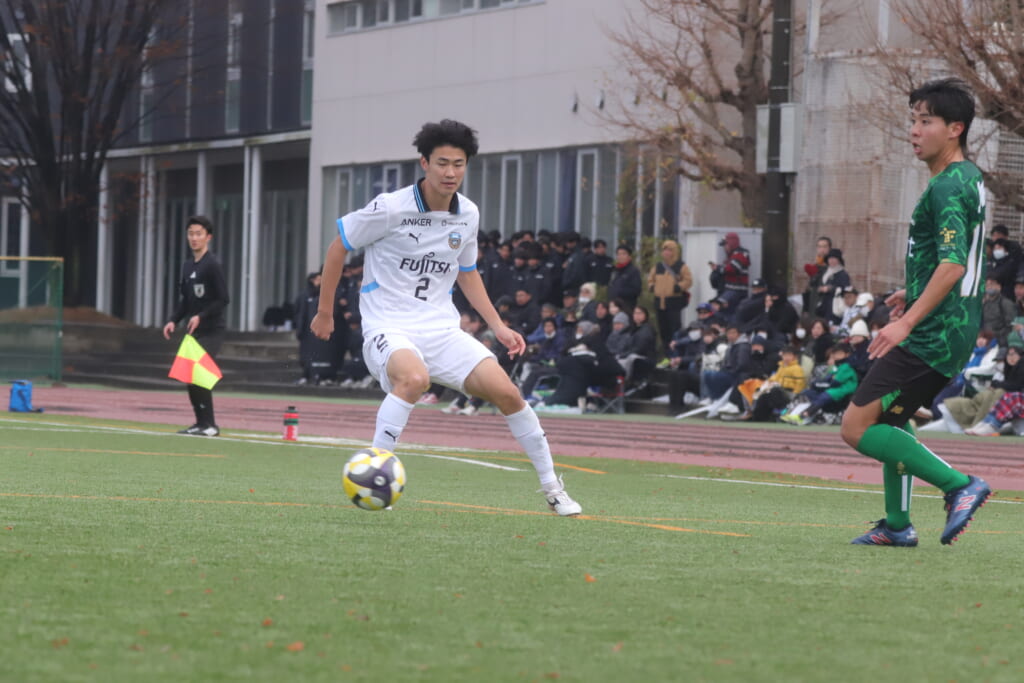 同点のゴールを狙い、前に出てくる昌平高校に対し、関が対応。前に行かせず、再び自分たちのボールにしていくフロンターレ。