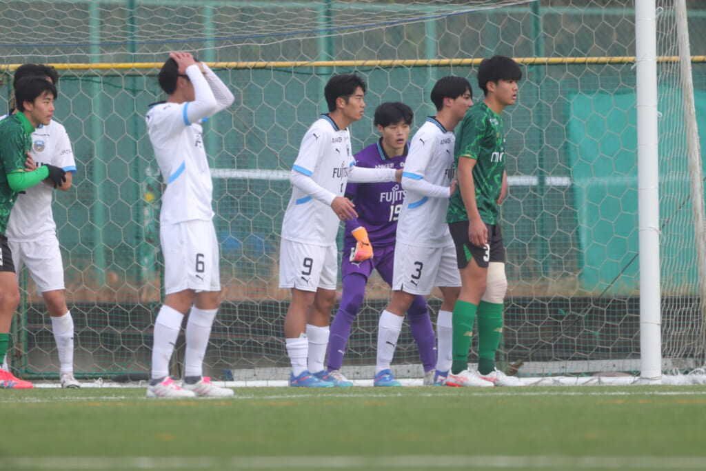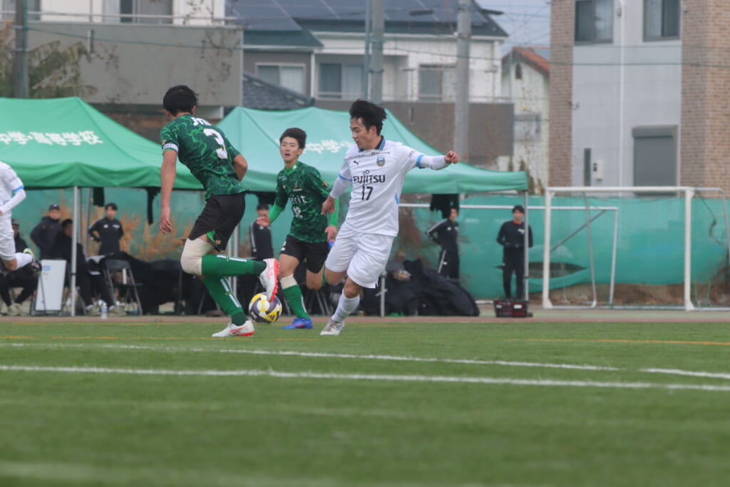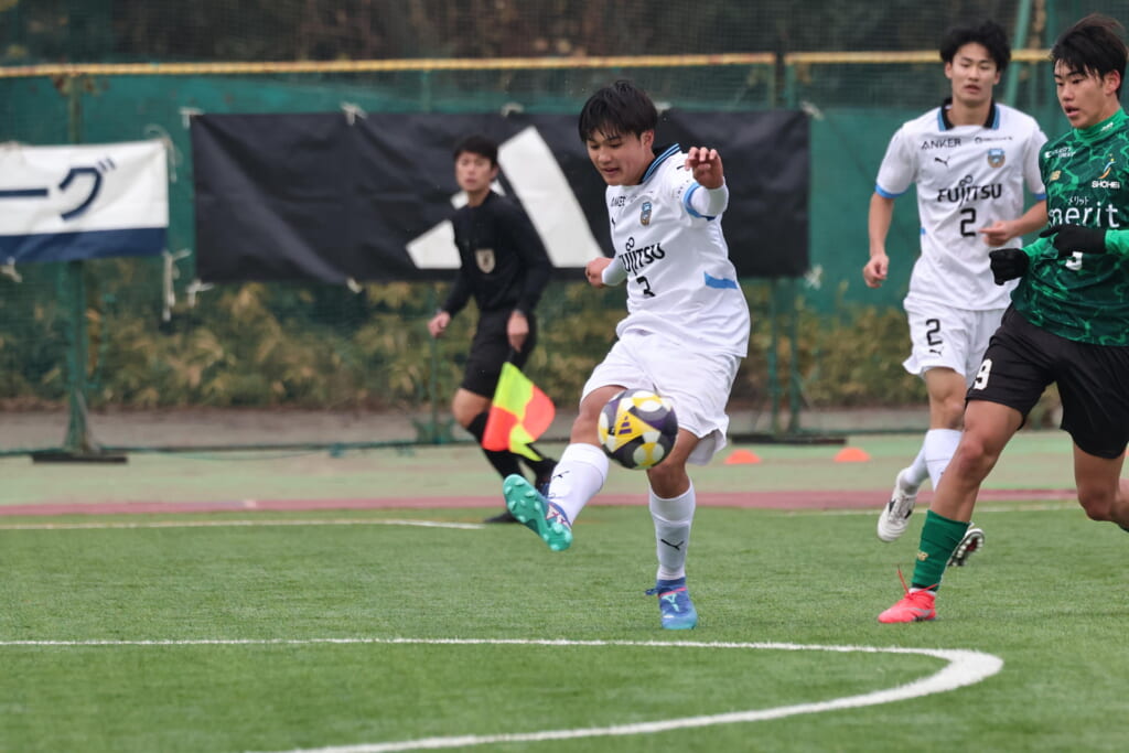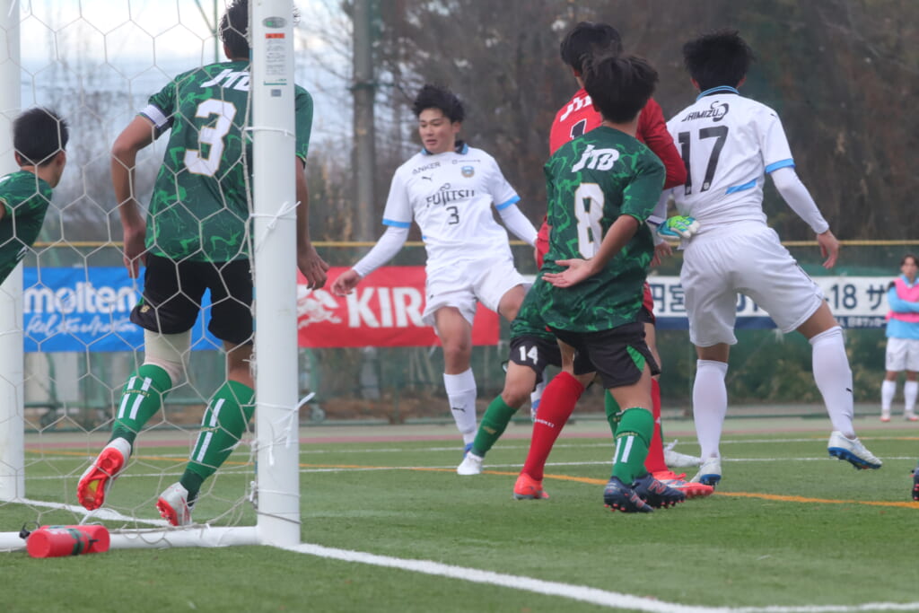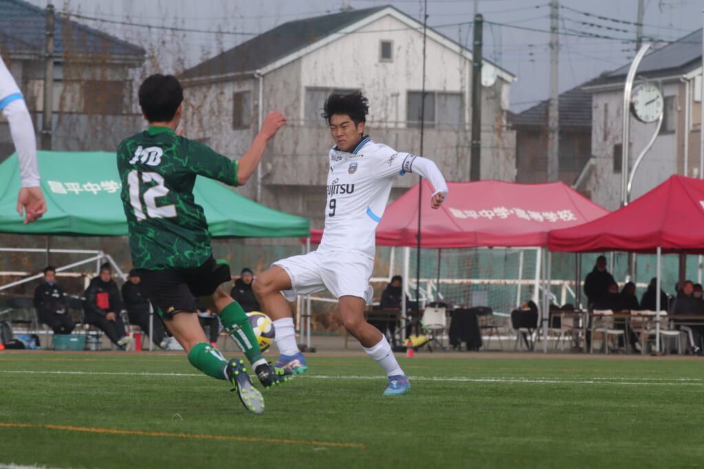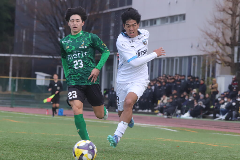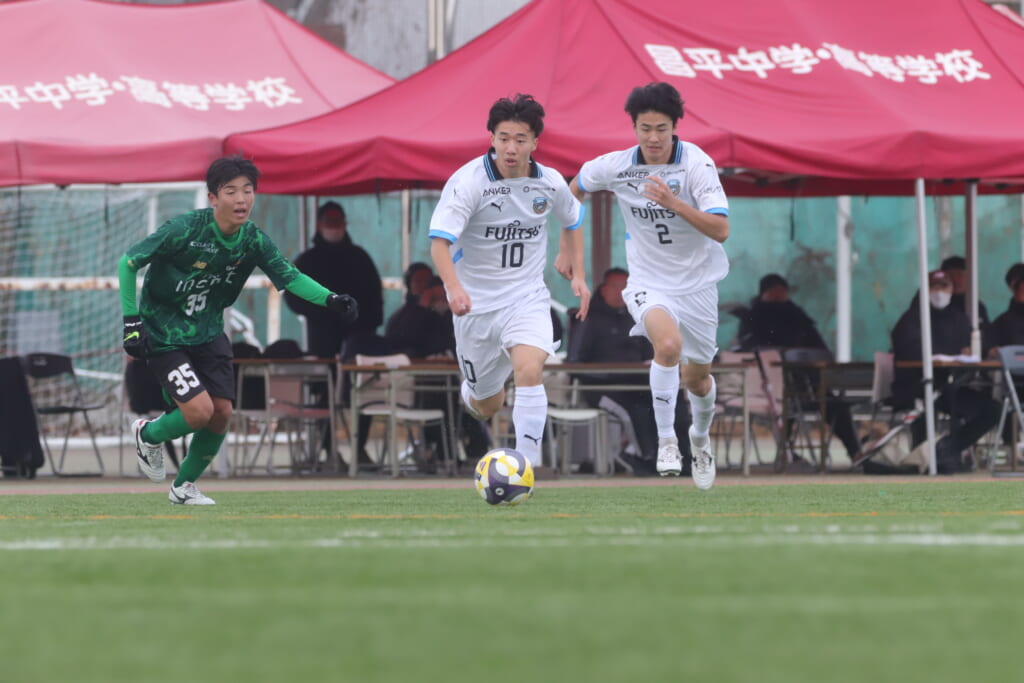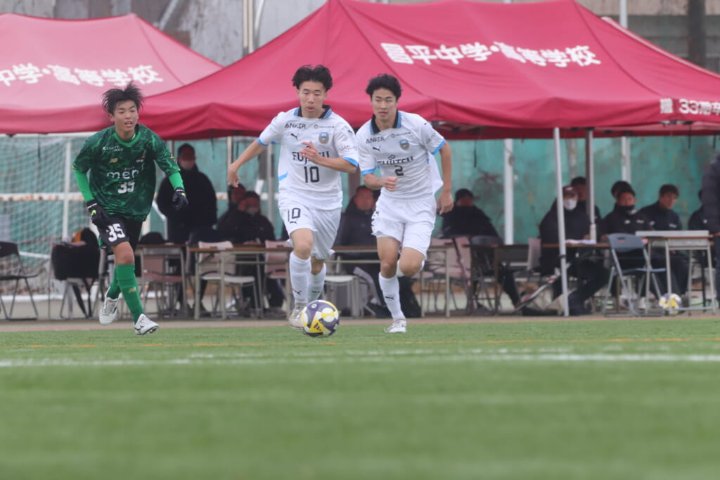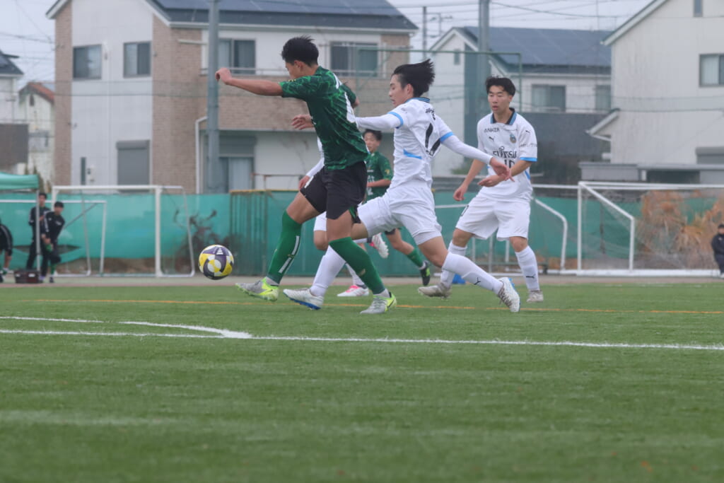 勝ち越しのゴールを狙うフロンターレ。直後には新堀のパスに、恩田が正面へ。しかし、昌平高校はブロック。