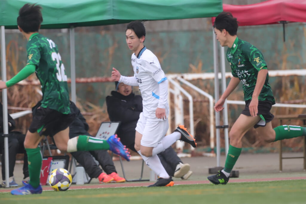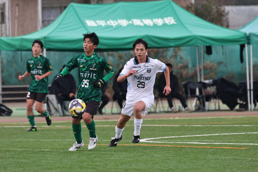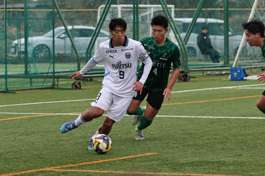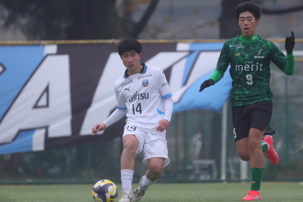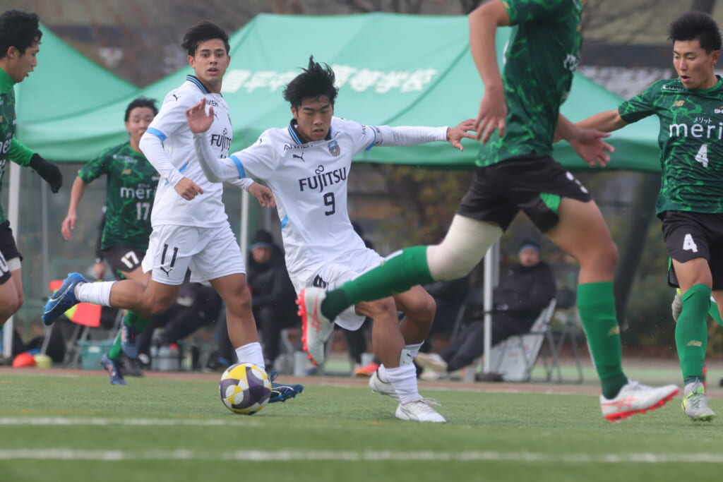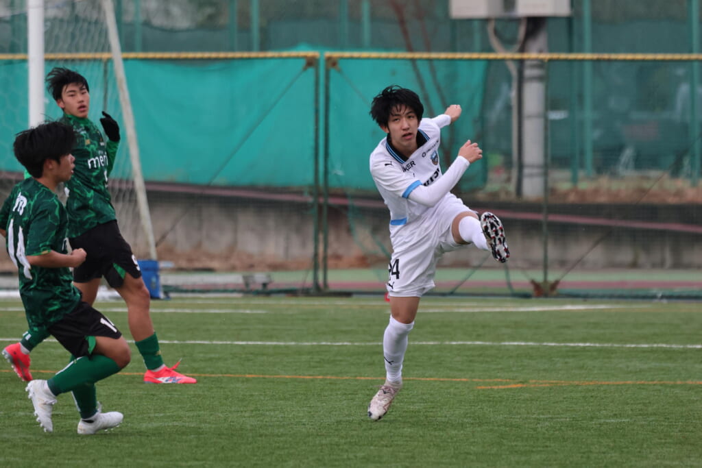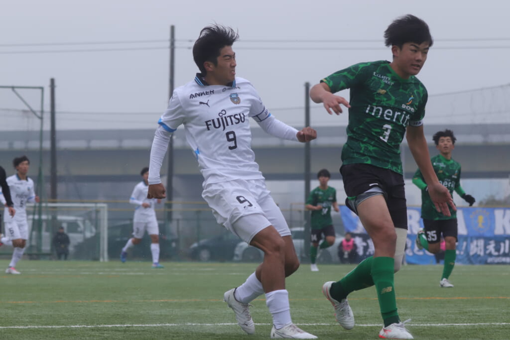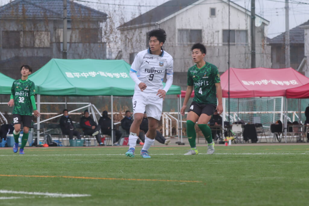 勝ち越しのゴールを狙うフロンターレ。直後には新堀のパスに、恩田が正面へ。しかし、昌平高校はブロック。