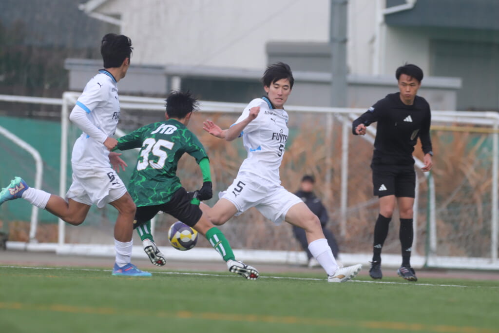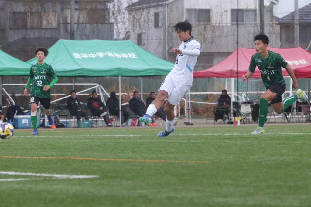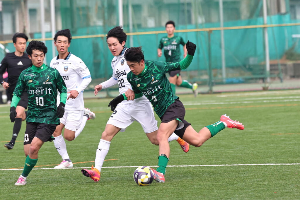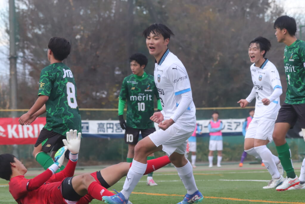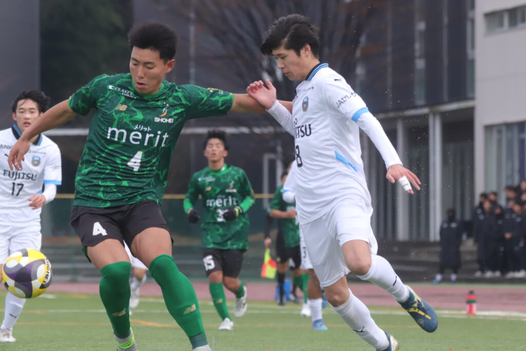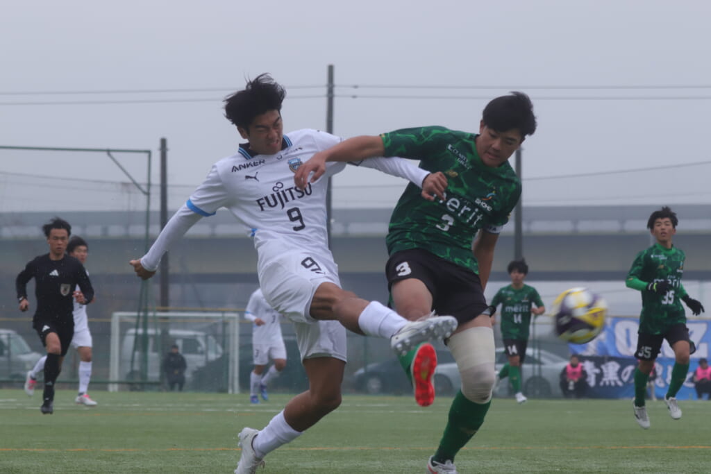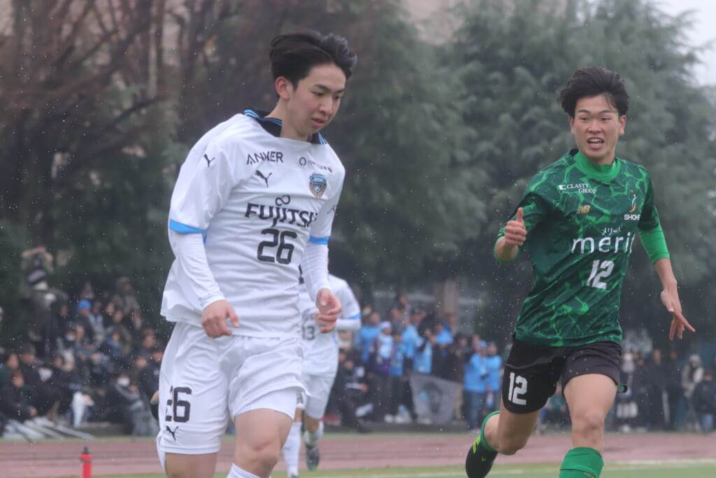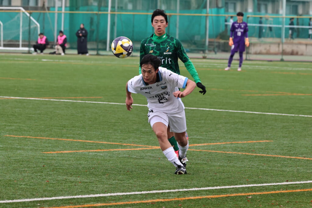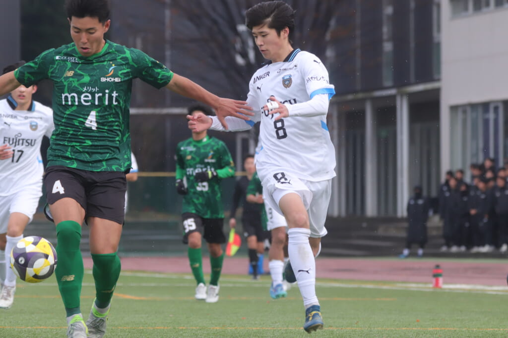 勝ち越しのゴールを狙うフロンターレ。直後には新堀のパスに、恩田が正面へ。しかし、昌平高校はブロック。