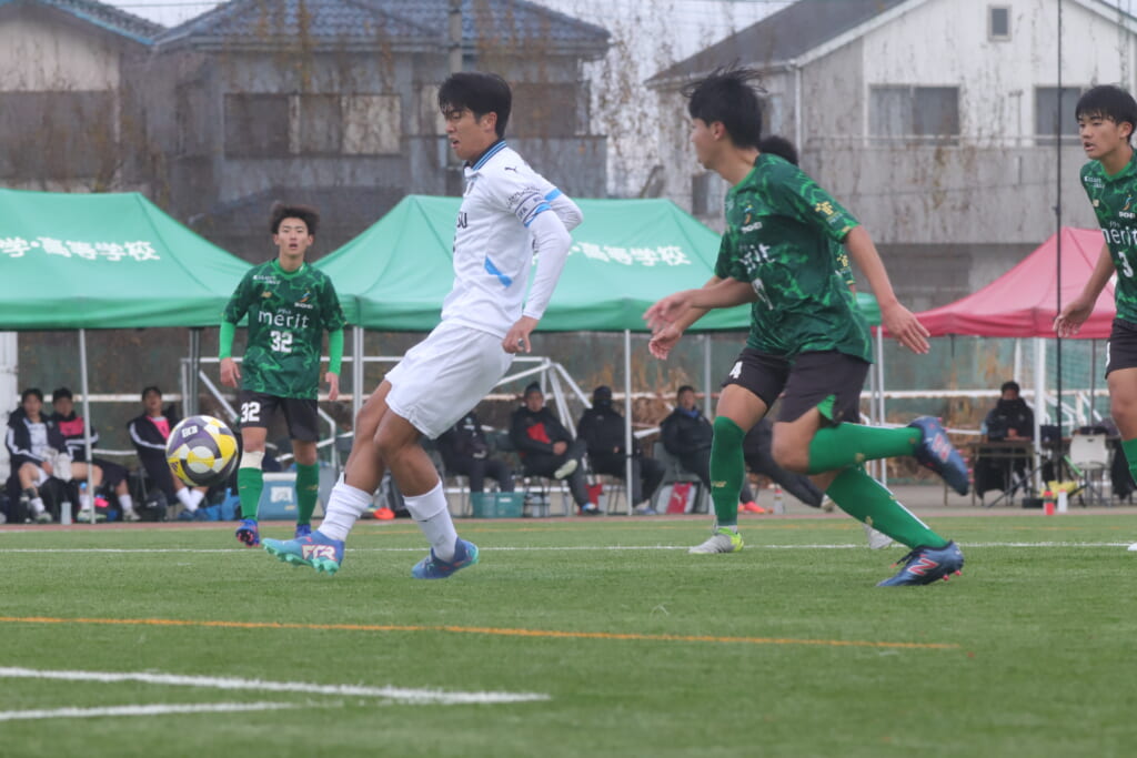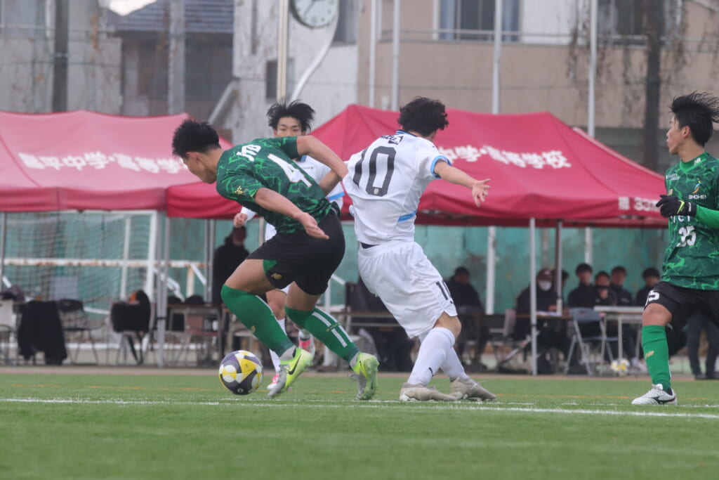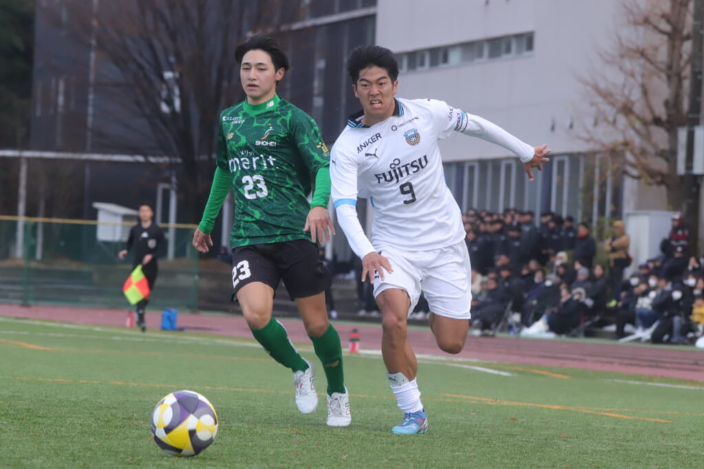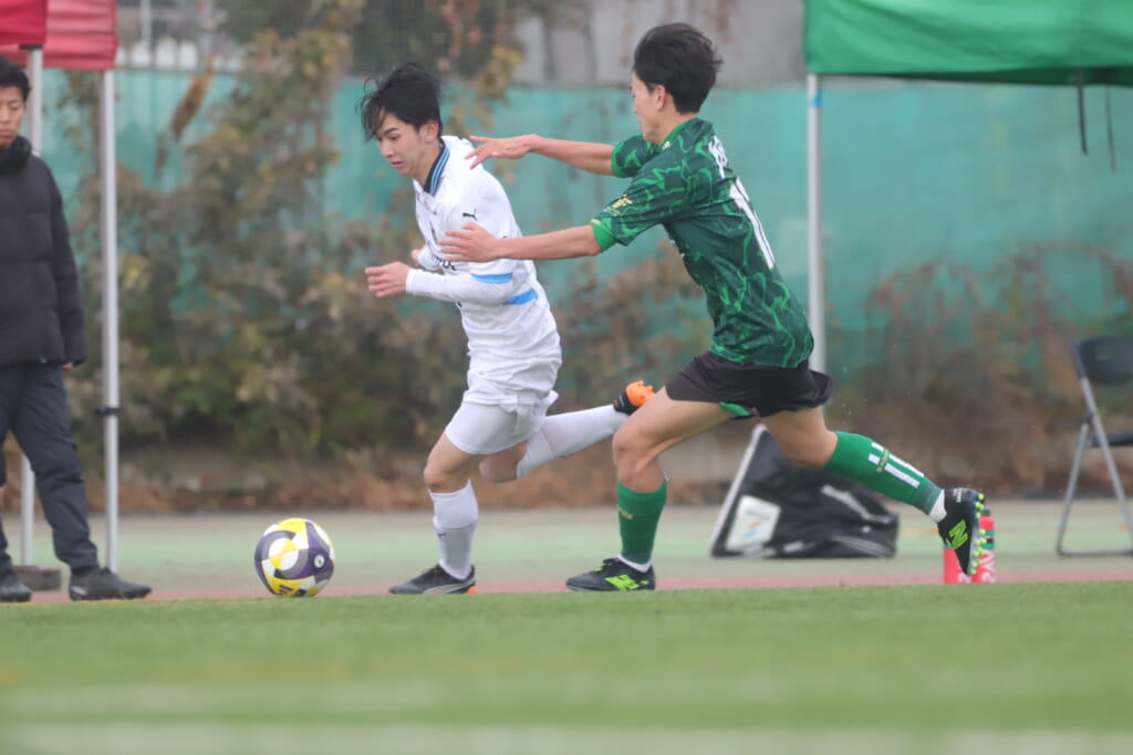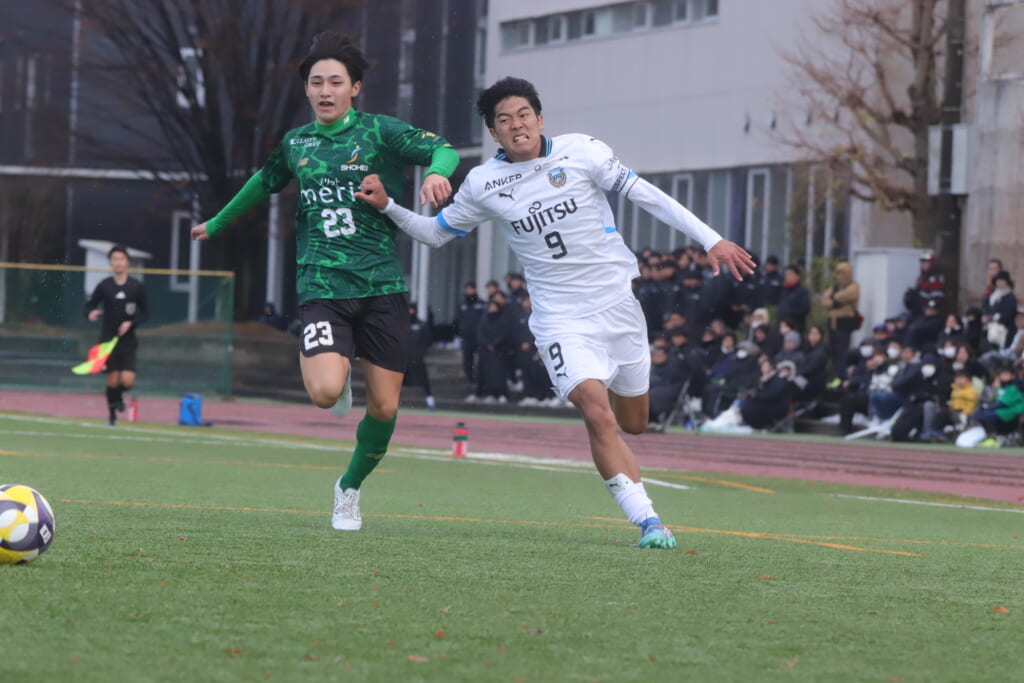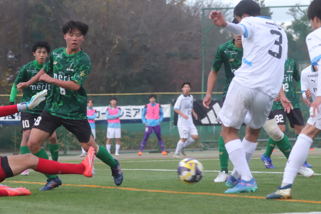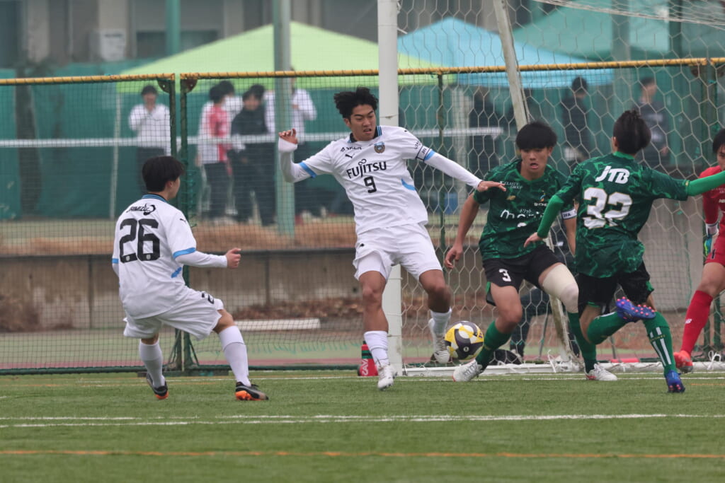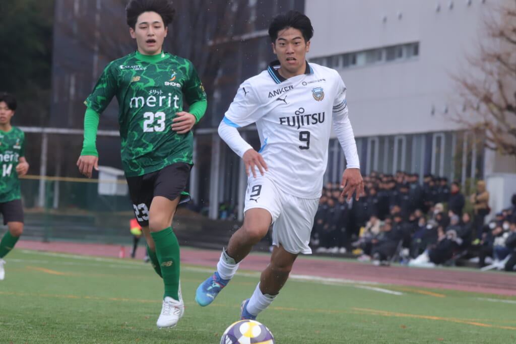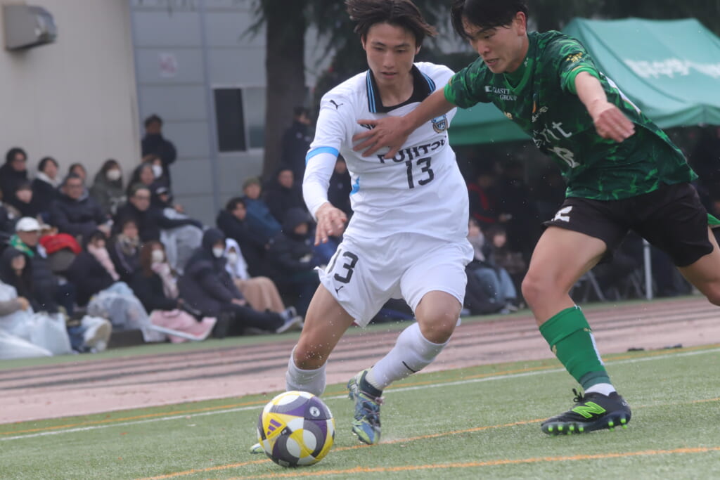 勝ち越しのゴールを狙うフロンターレ。直後には新堀のパスに、恩田が正面へ。しかし、昌平高校はブロック。