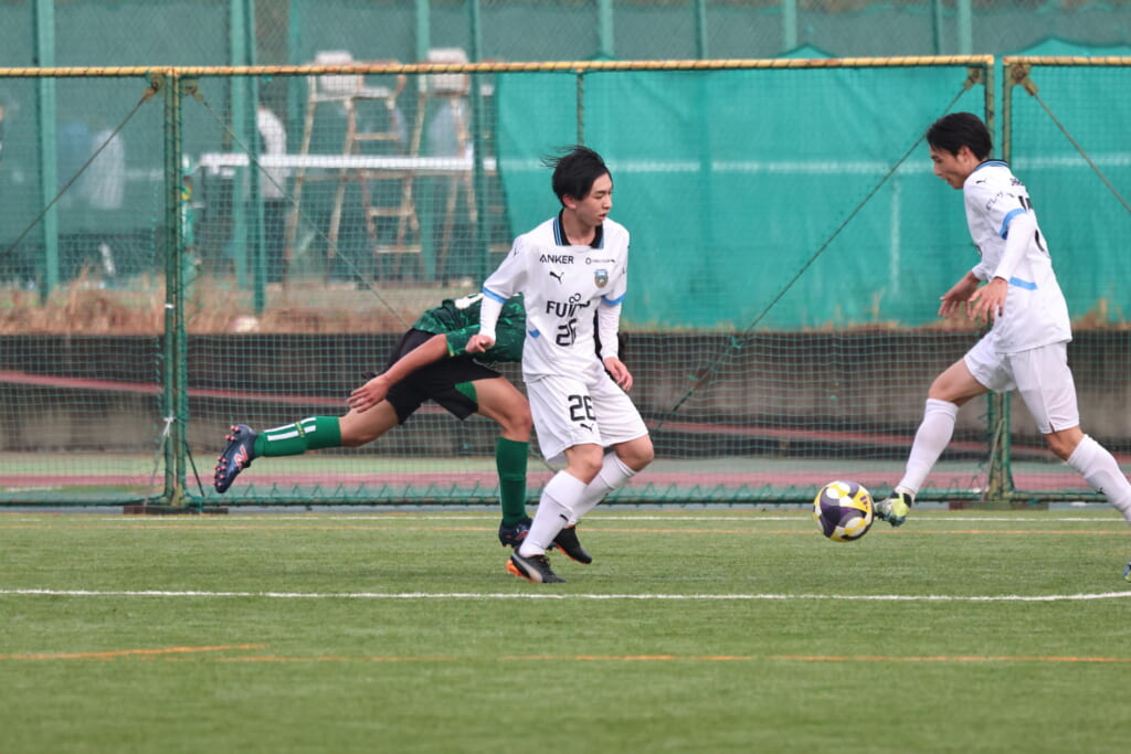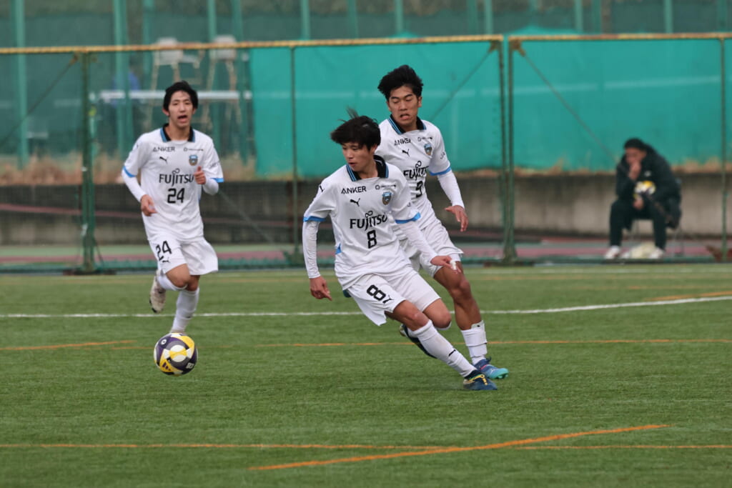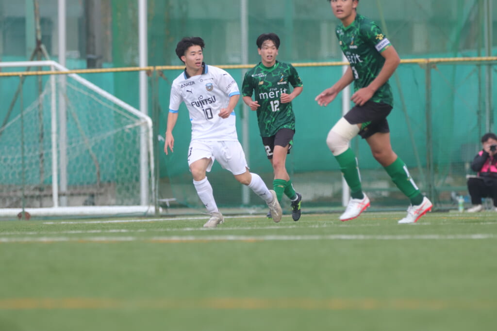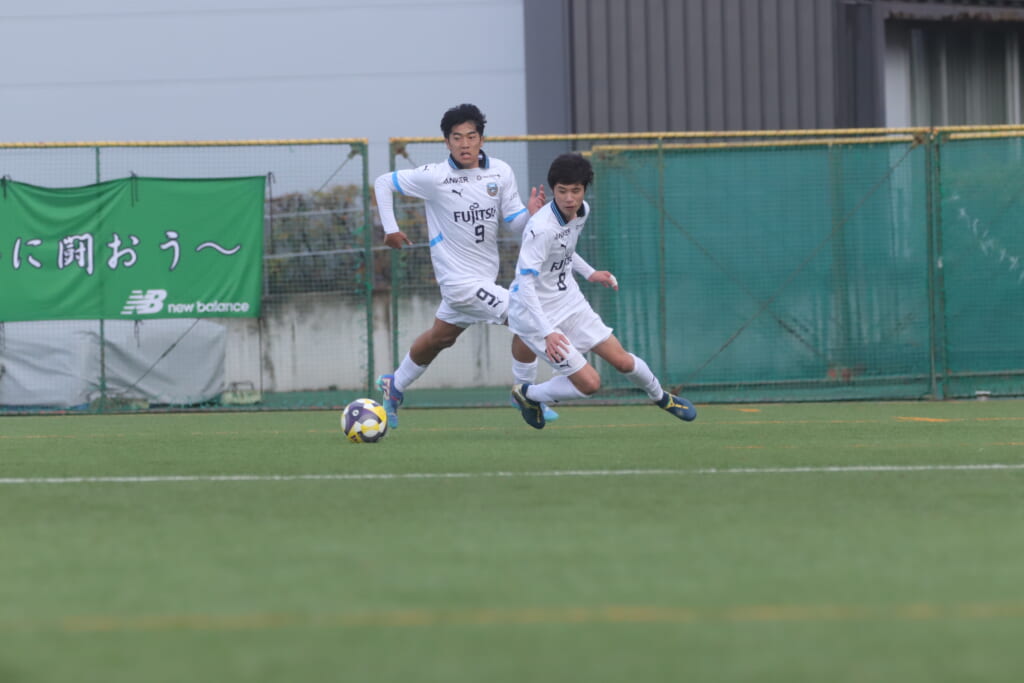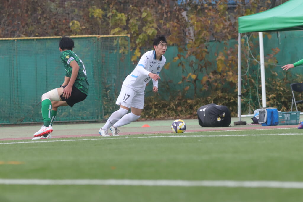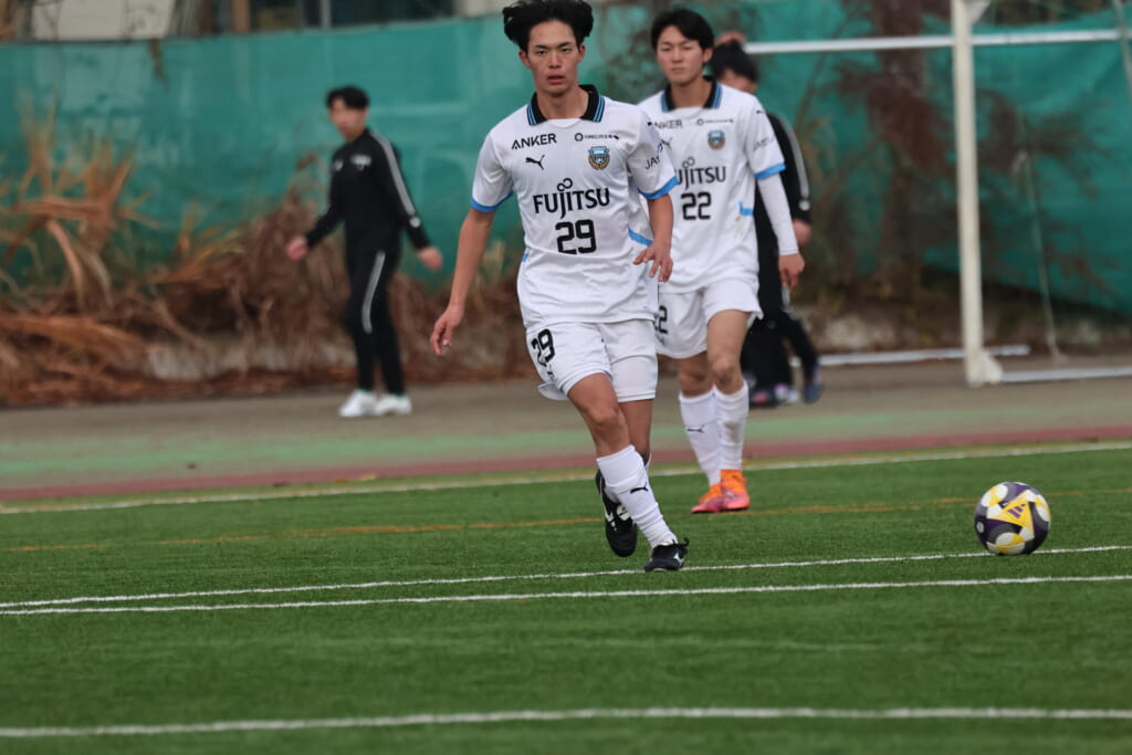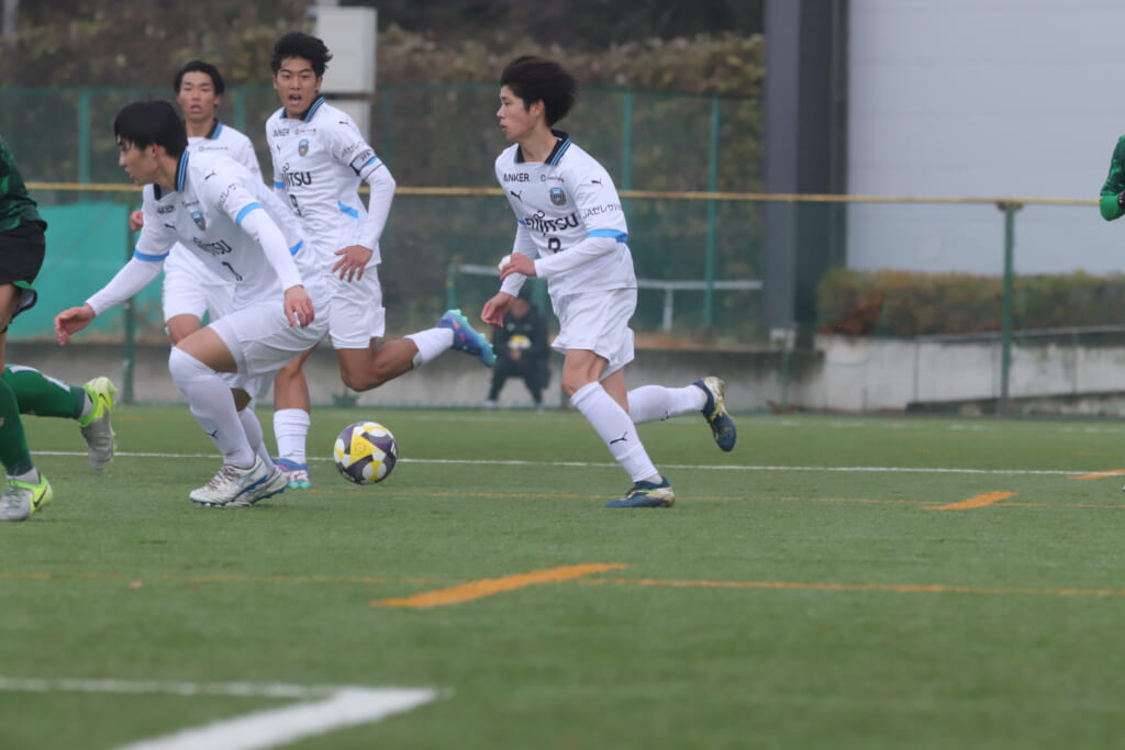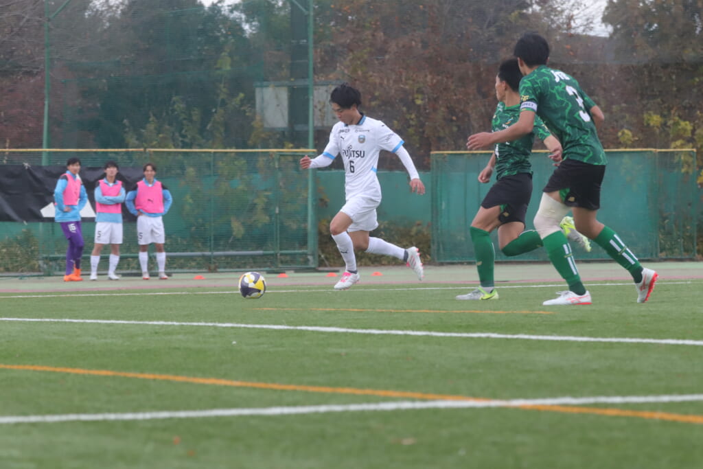 山川、藤田に中央で藤井が受け、小川尋斗が流れの中で右サイド、高い位置へ。左サイドを突くパスに、関が抜け出すなど、相手陣内での時間を増やしていくフロンターレ。