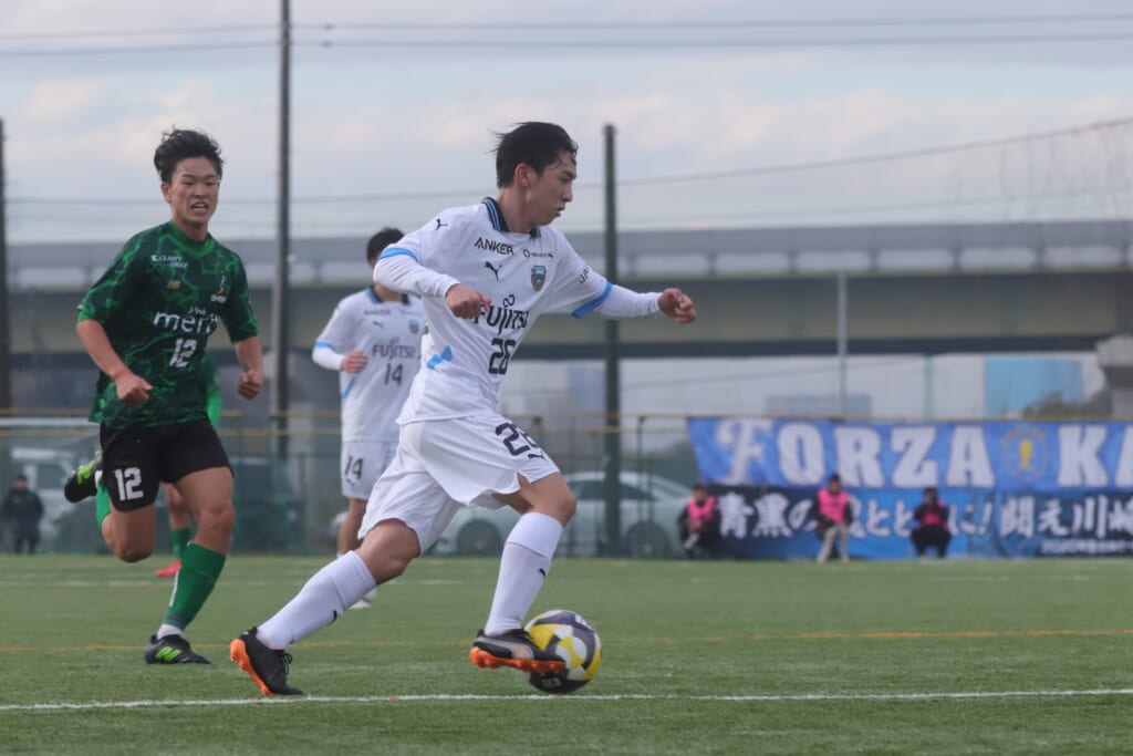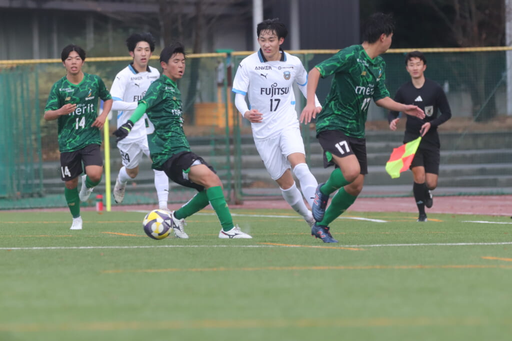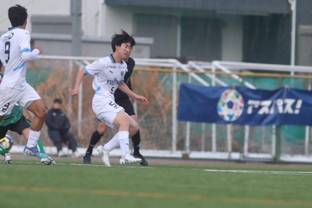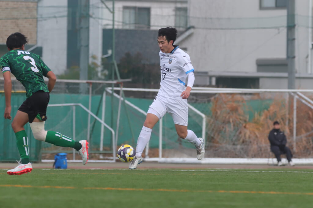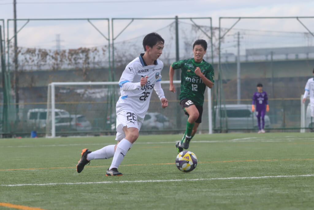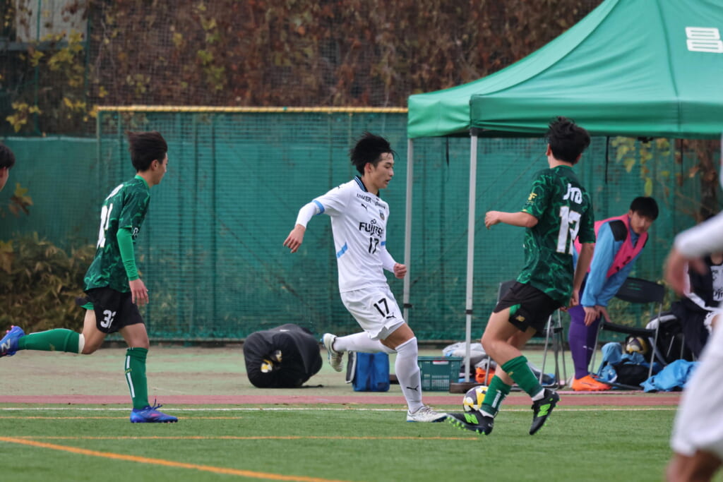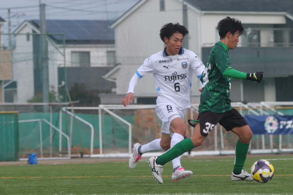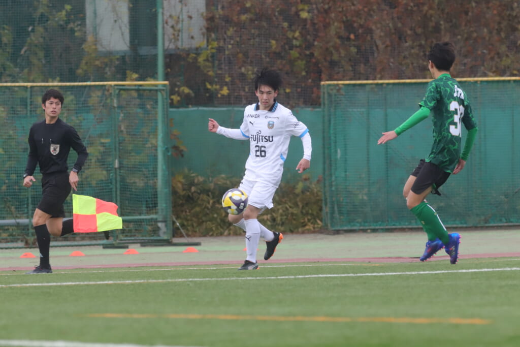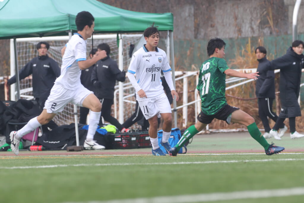 山川、藤田に中央で藤井が受け、小川尋斗が流れの中で右サイド、高い位置へ。左サイドを突くパスに、関が抜け出すなど、相手陣内での時間を増やしていくフロンターレ。
