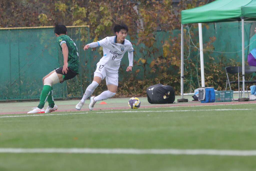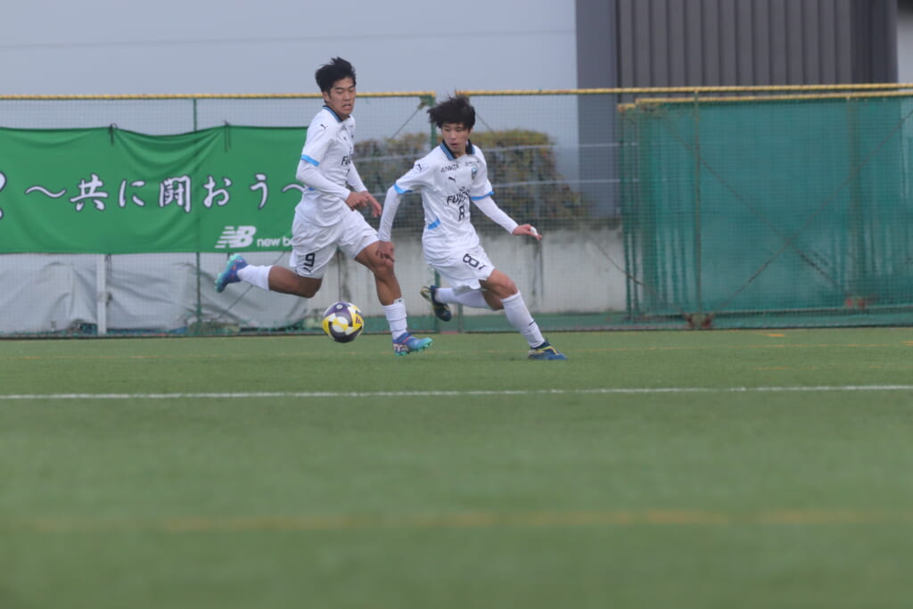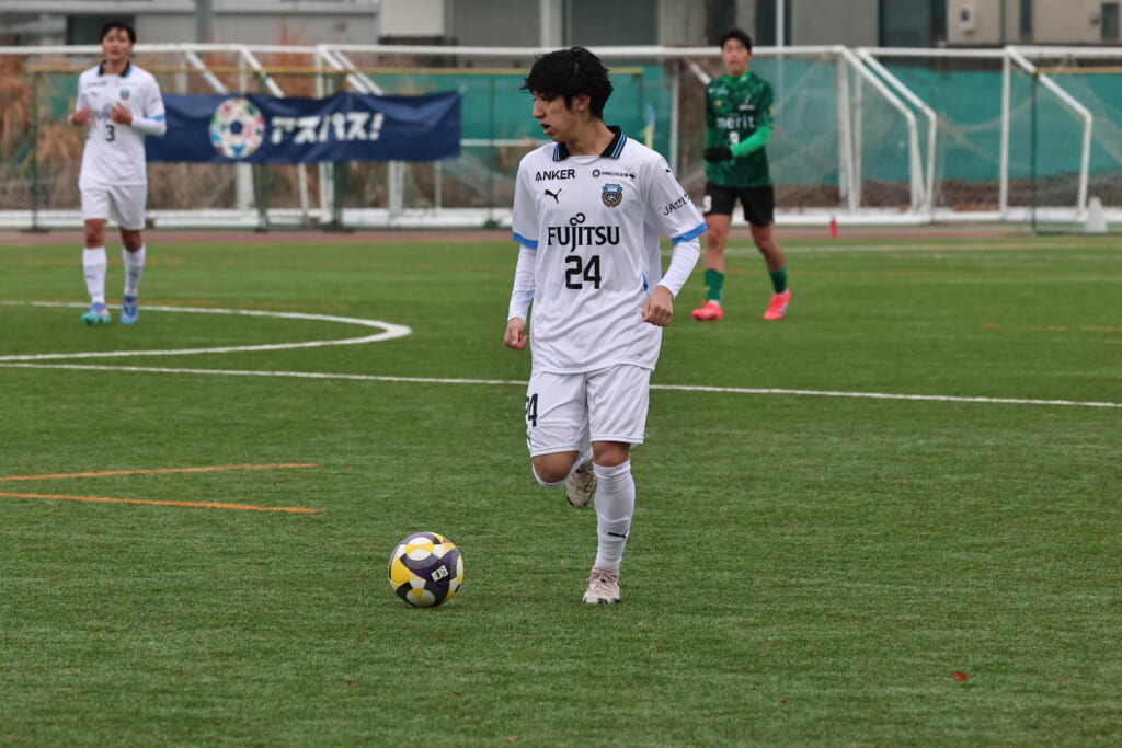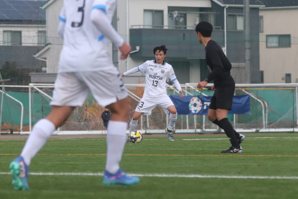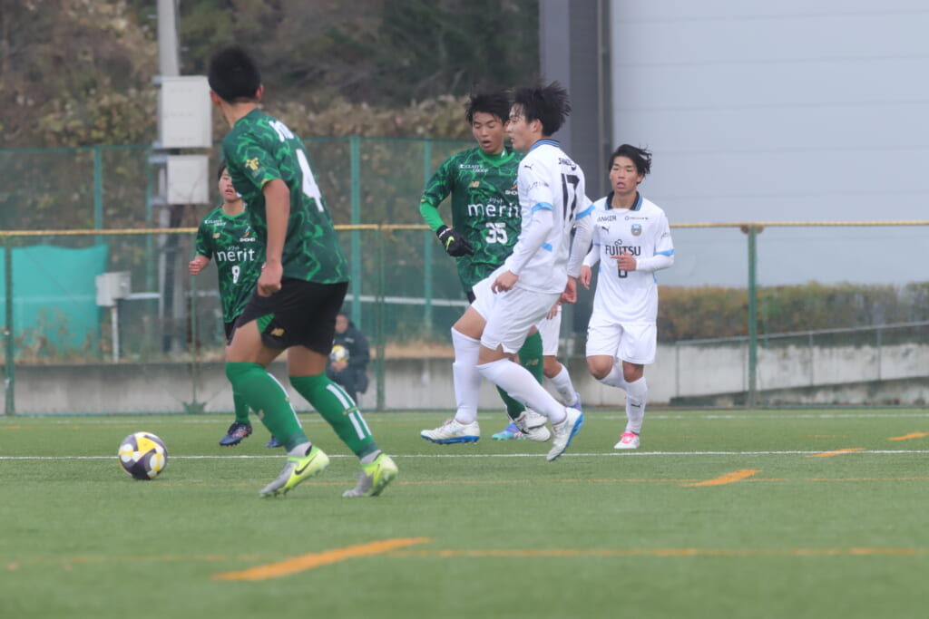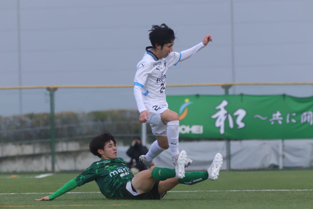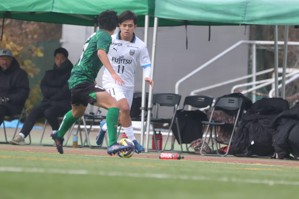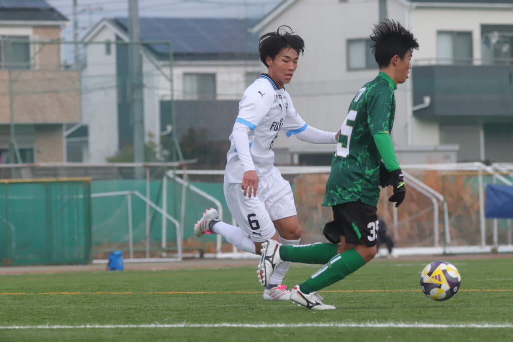 山川、藤田に中央で藤井が受け、小川尋斗が流れの中で右サイド、高い位置へ。左サイドを突くパスに、関が抜け出すなど、相手陣内での時間を増やしていくフロンターレ。