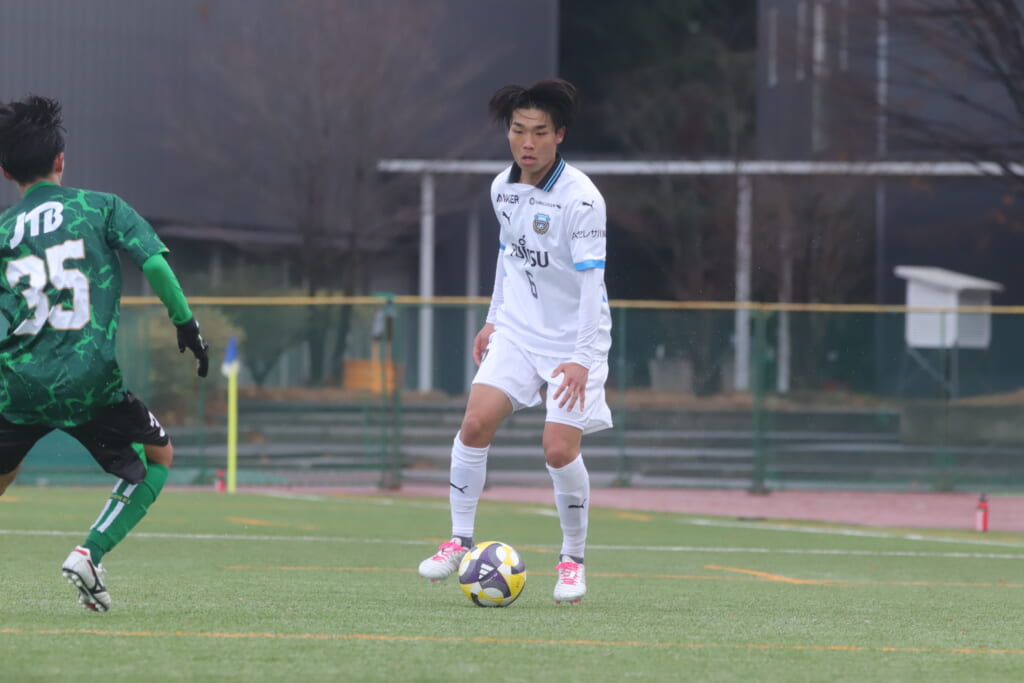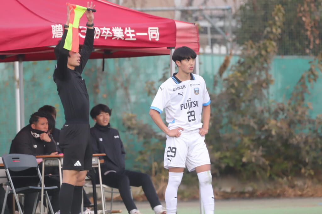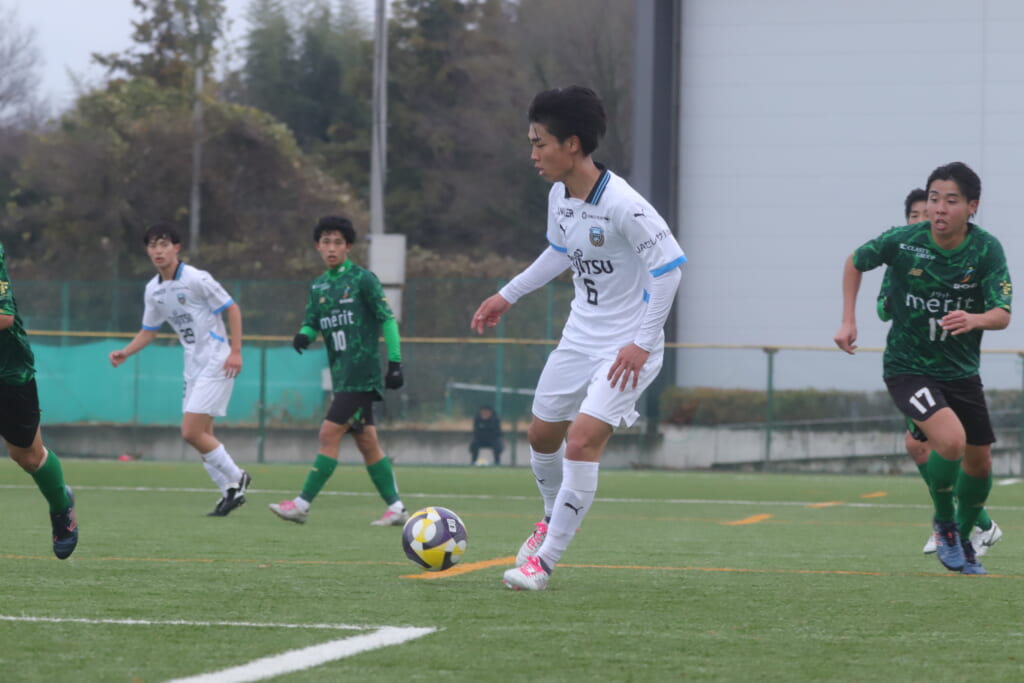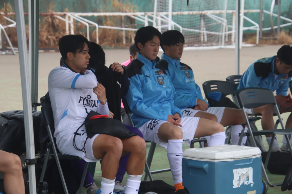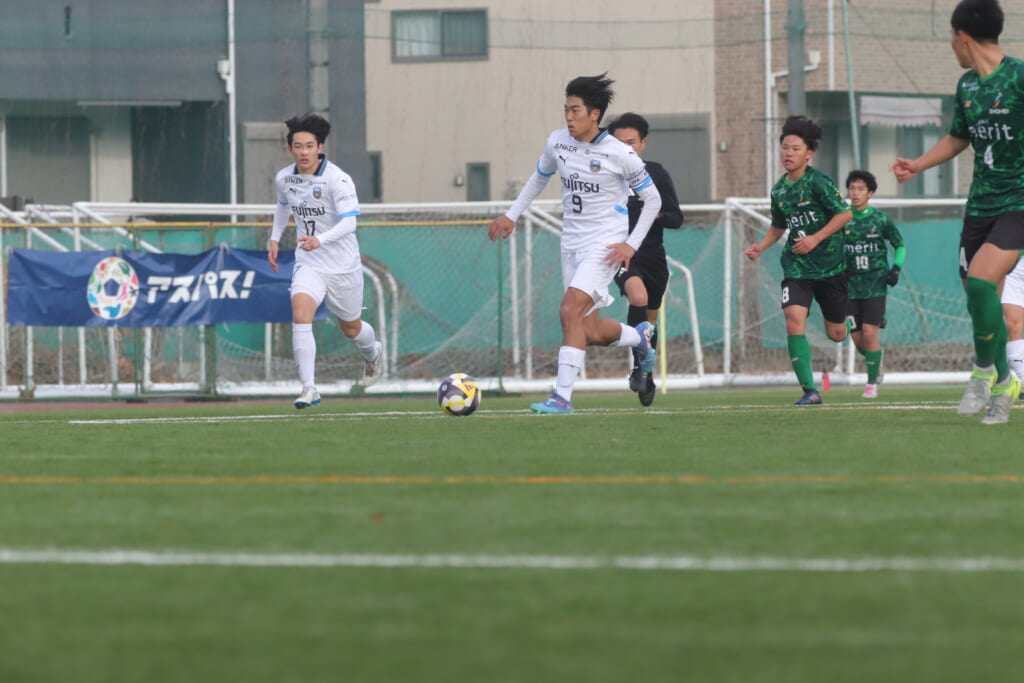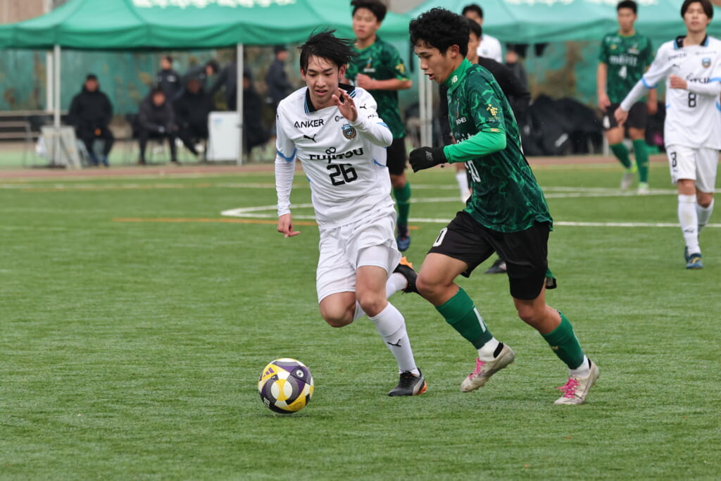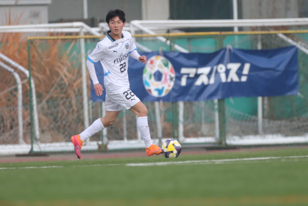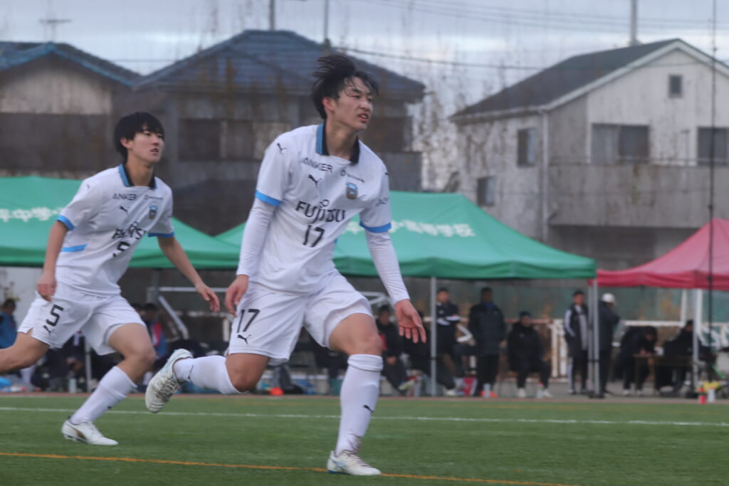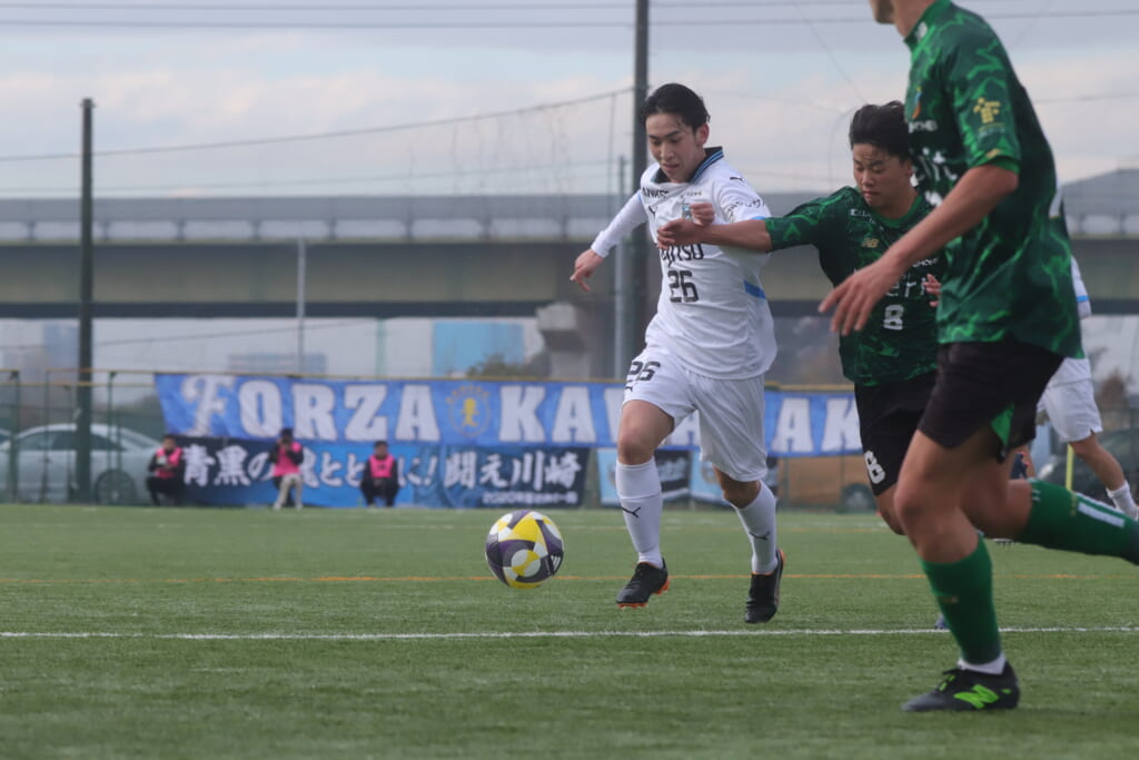 山川、藤田に中央で藤井が受け、小川尋斗が流れの中で右サイド、高い位置へ。左サイドを突くパスに、関が抜け出すなど、相手陣内での時間を増やしていくフロンターレ。