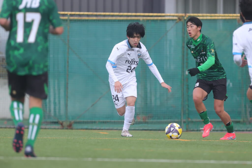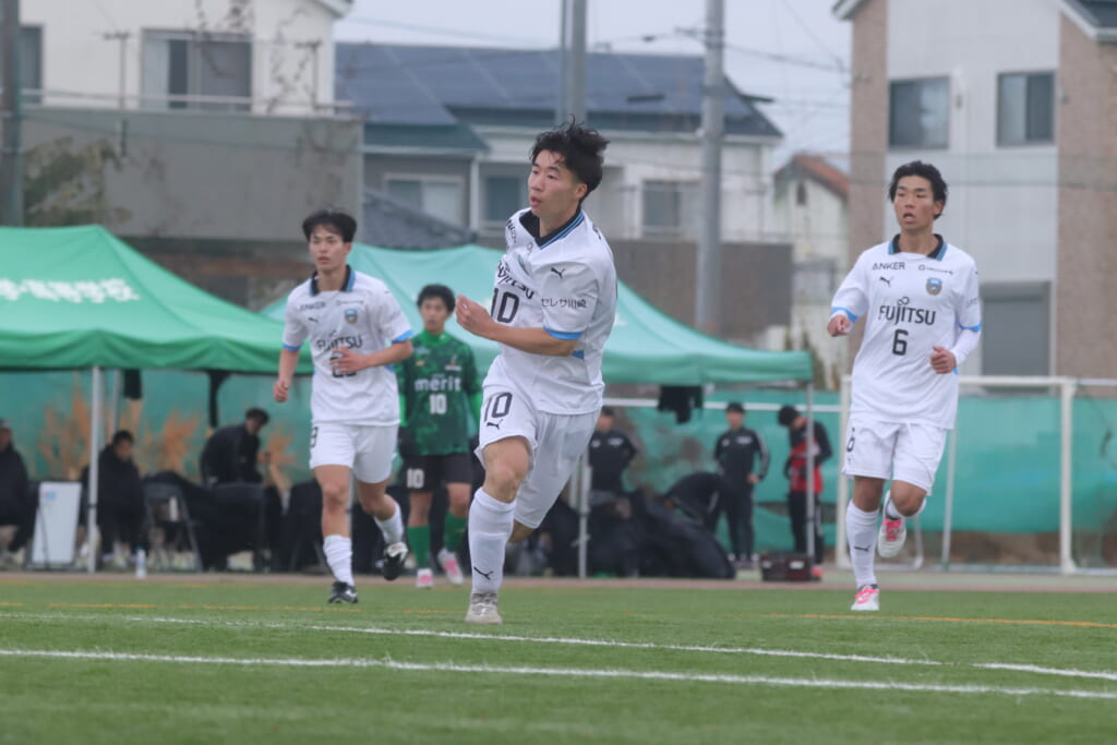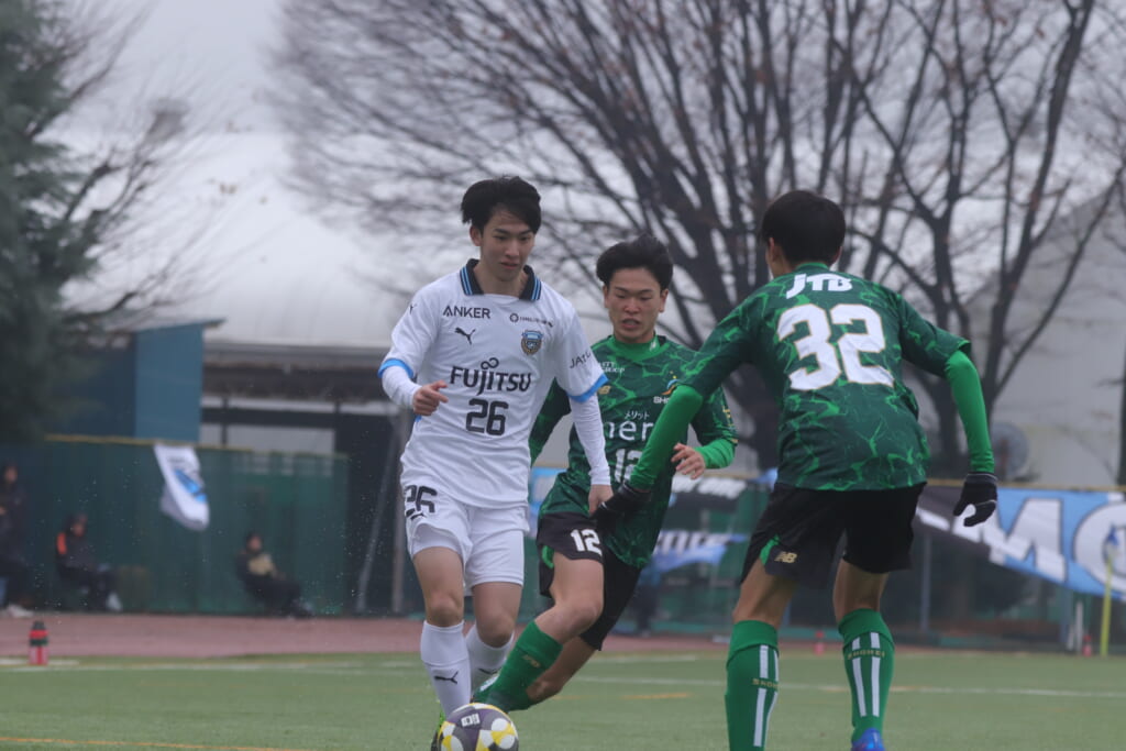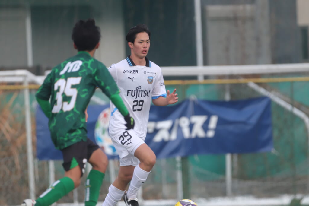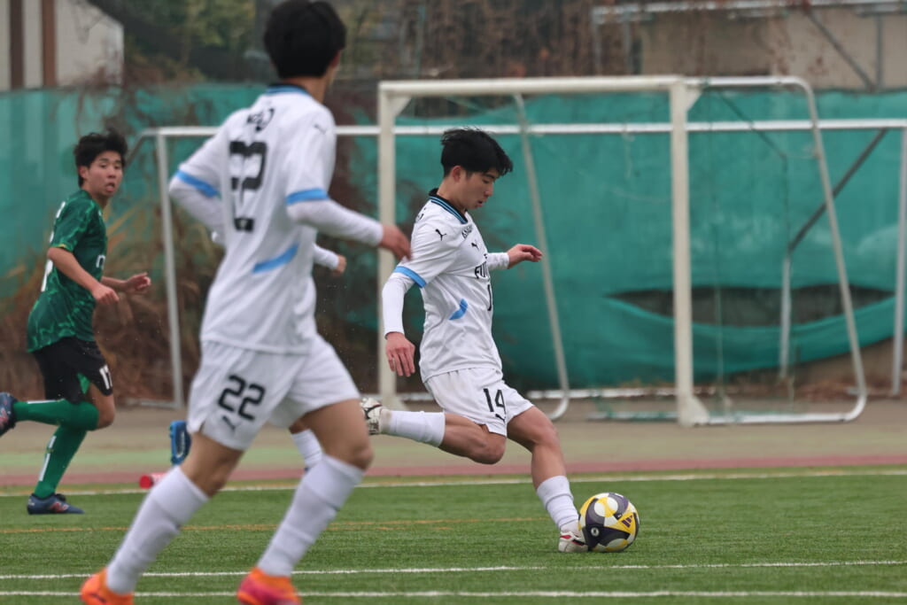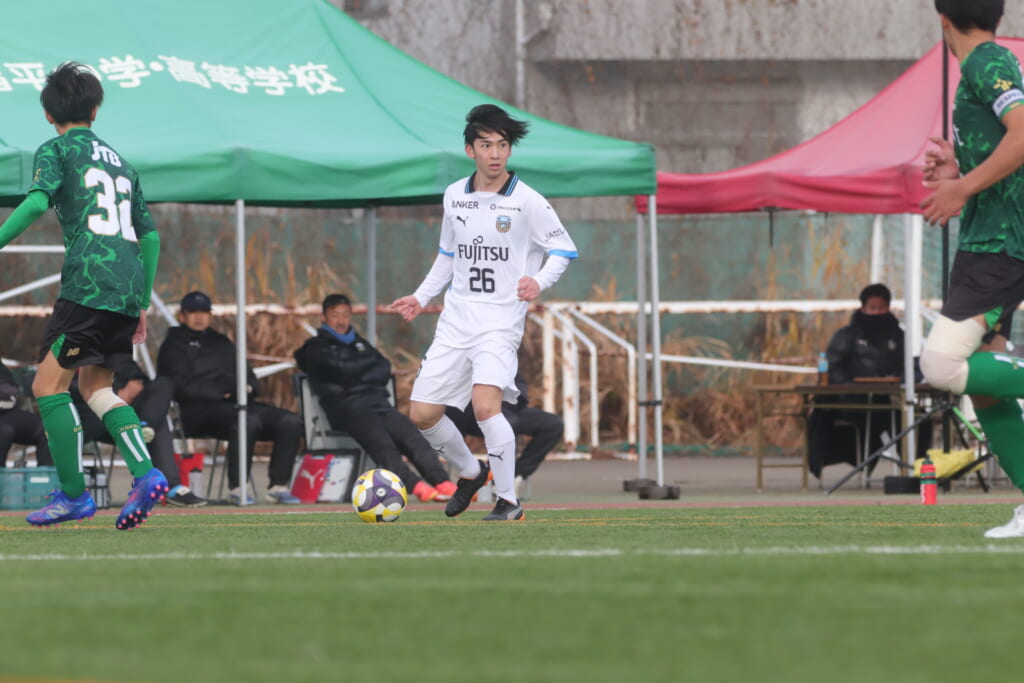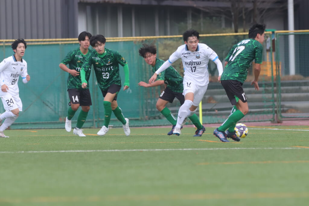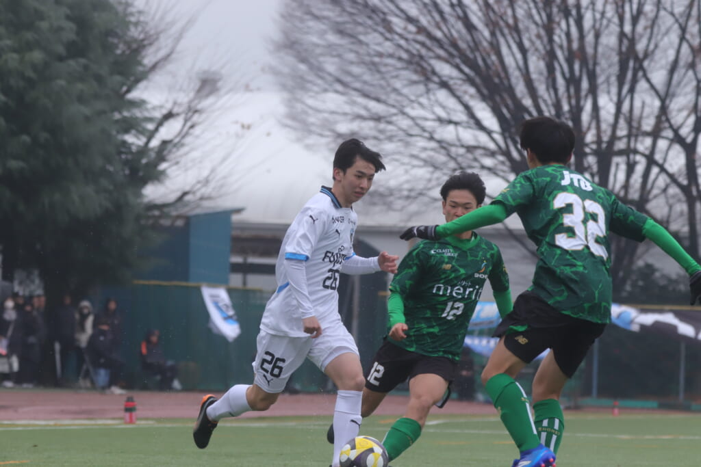 山川、藤田に中央で藤井が受け、小川尋斗が流れの中で右サイド、高い位置へ。左サイドを突くパスに、関が抜け出すなど、相手陣内での時間を増やしていくフロンターレ。