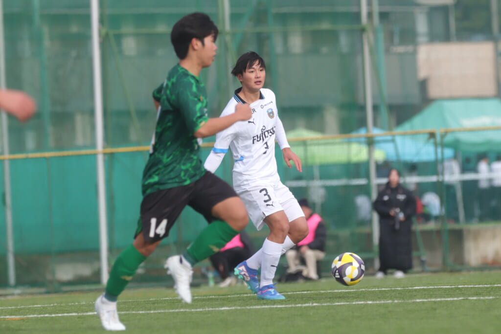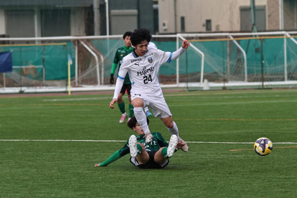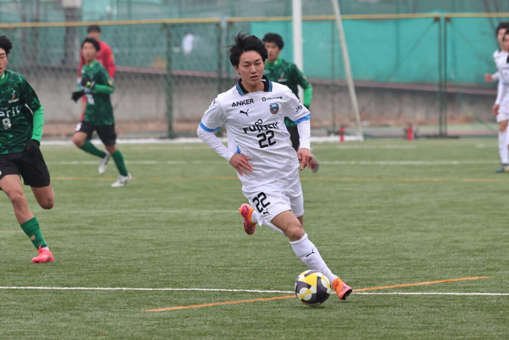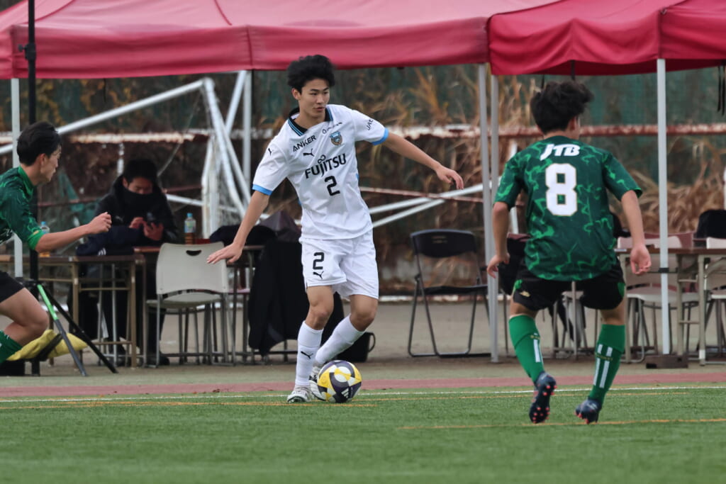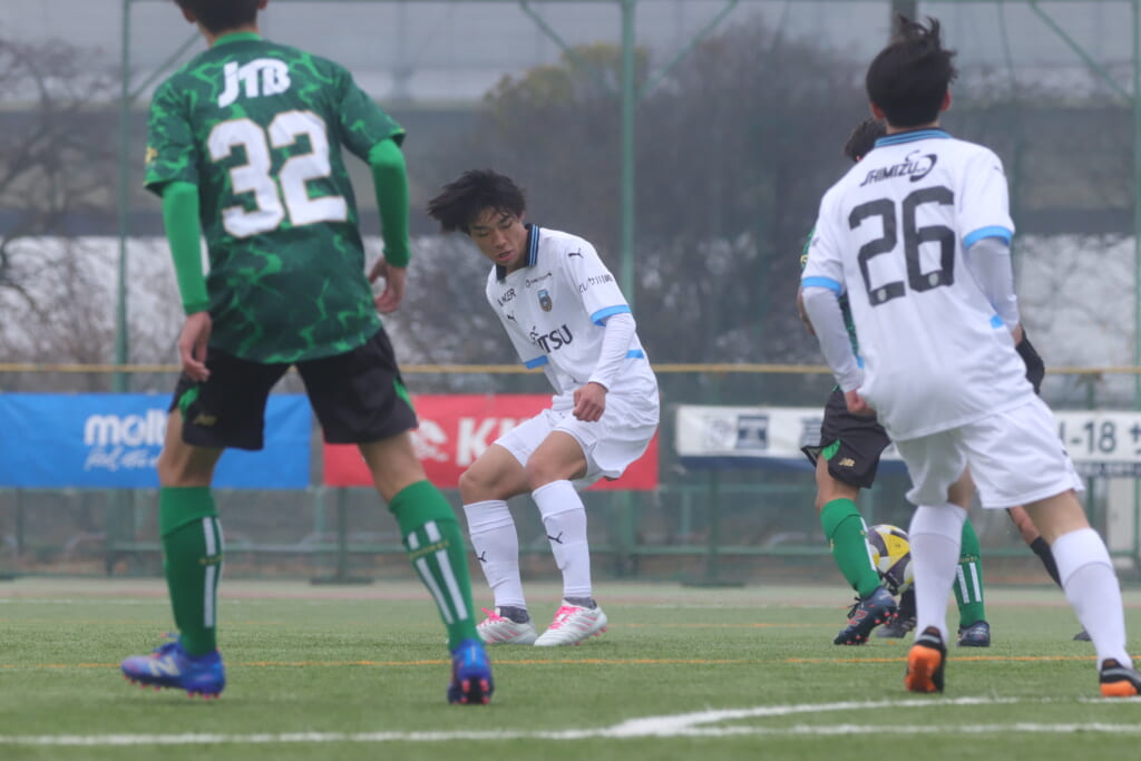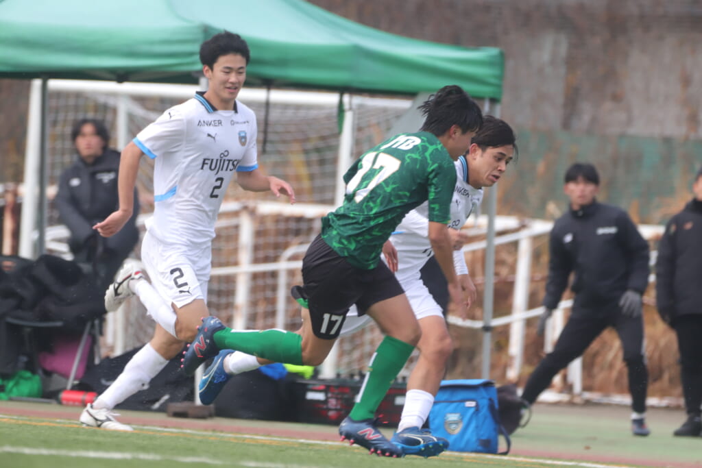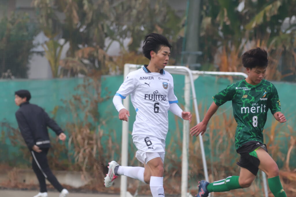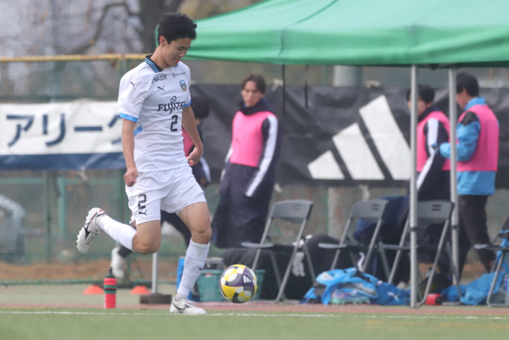 山川、藤田に中央で藤井が受け、小川尋斗が流れの中で右サイド、高い位置へ。左サイドを突くパスに、関が抜け出すなど、相手陣内での時間を増やしていくフロンターレ。