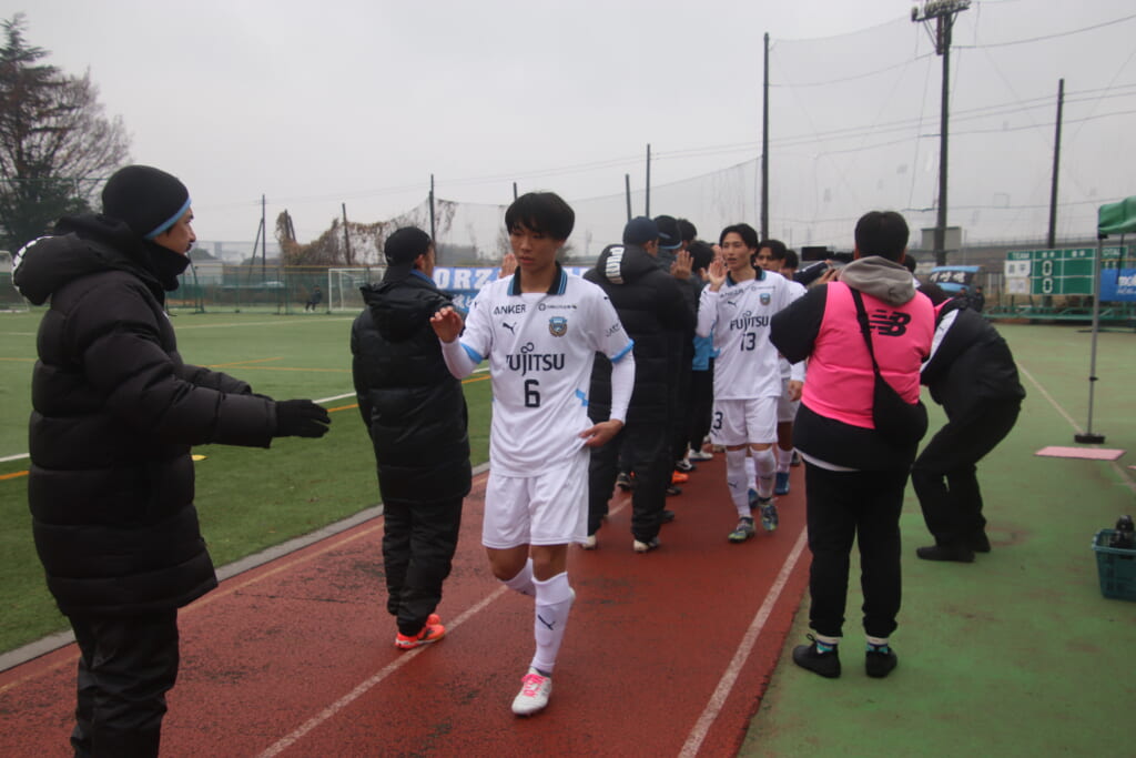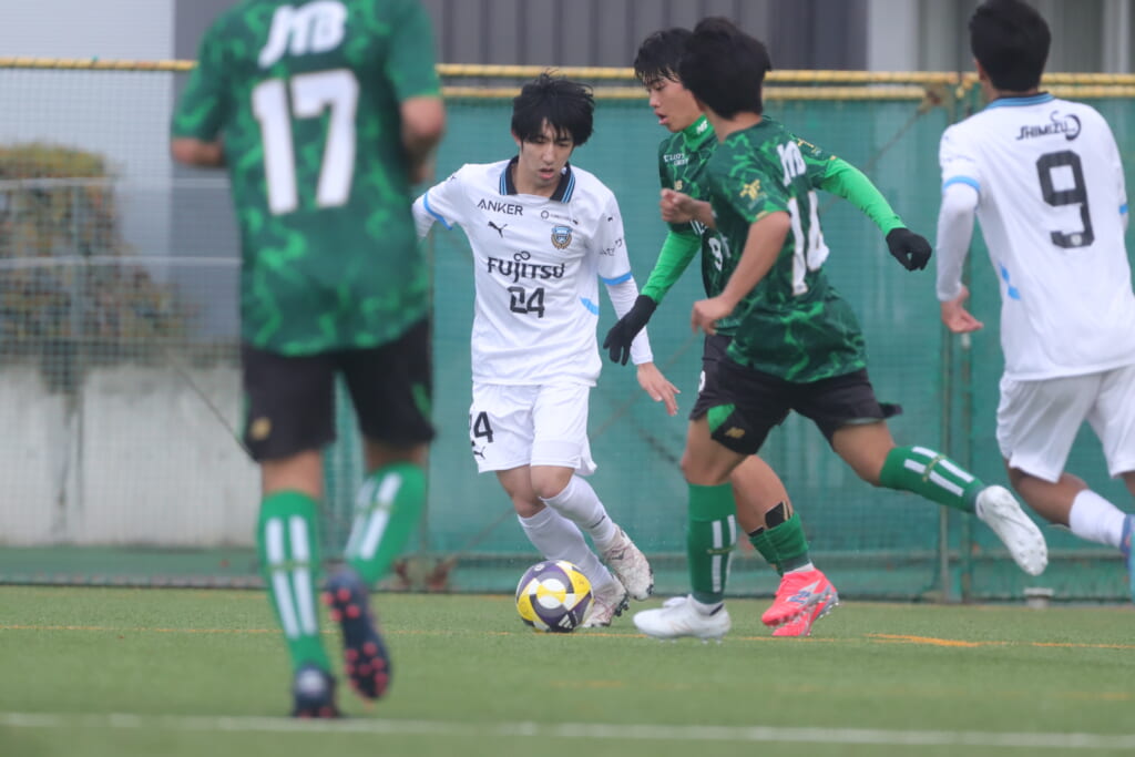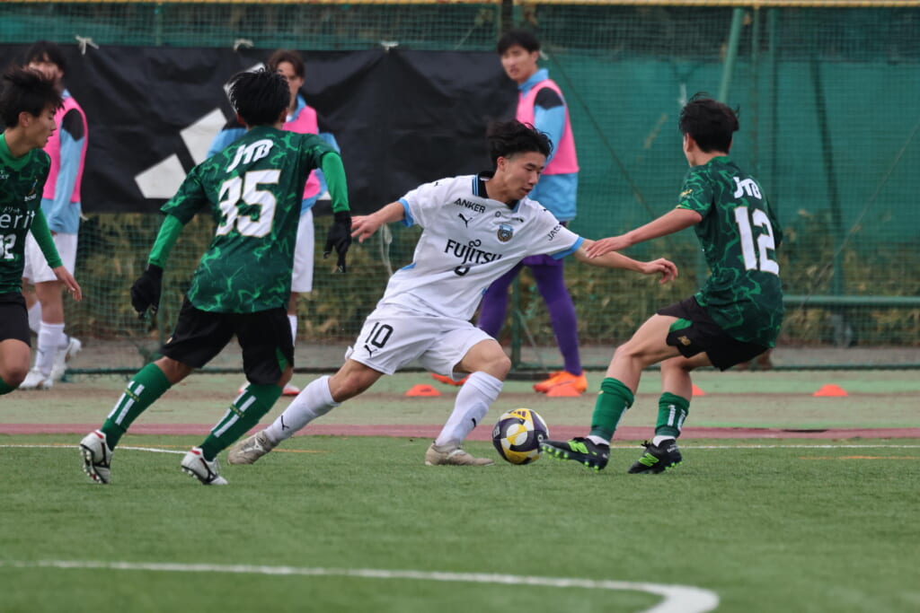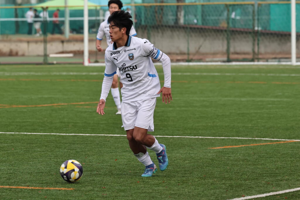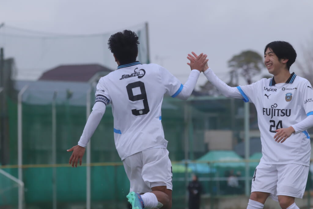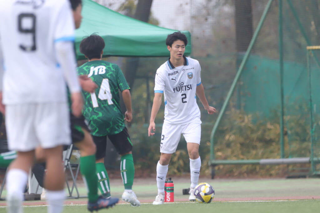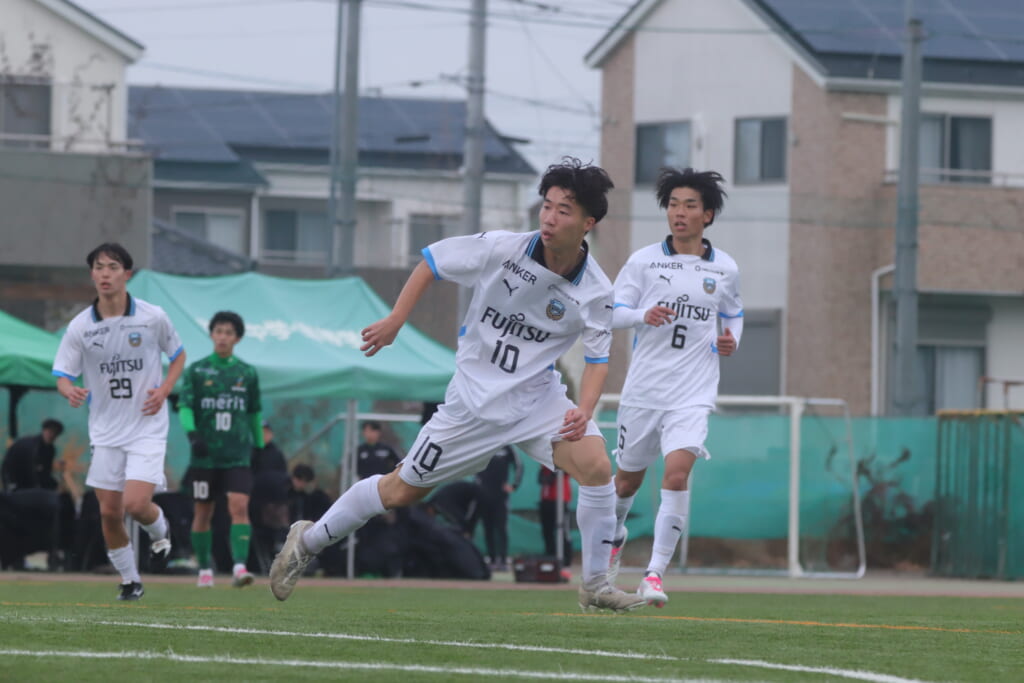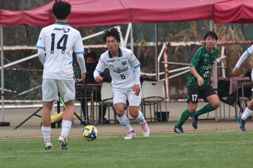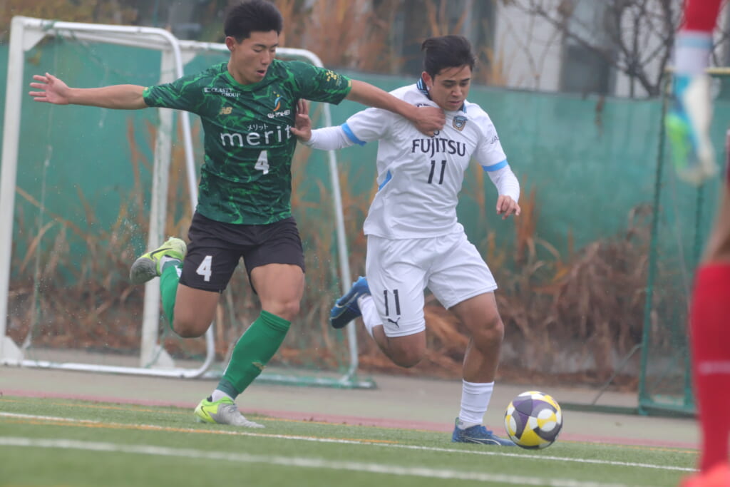 山川、藤田に中央で藤井が受け、小川尋斗が流れの中で右サイド、高い位置へ。左サイドを突くパスに、関が抜け出すなど、相手陣内での時間を増やしていくフロンターレ。