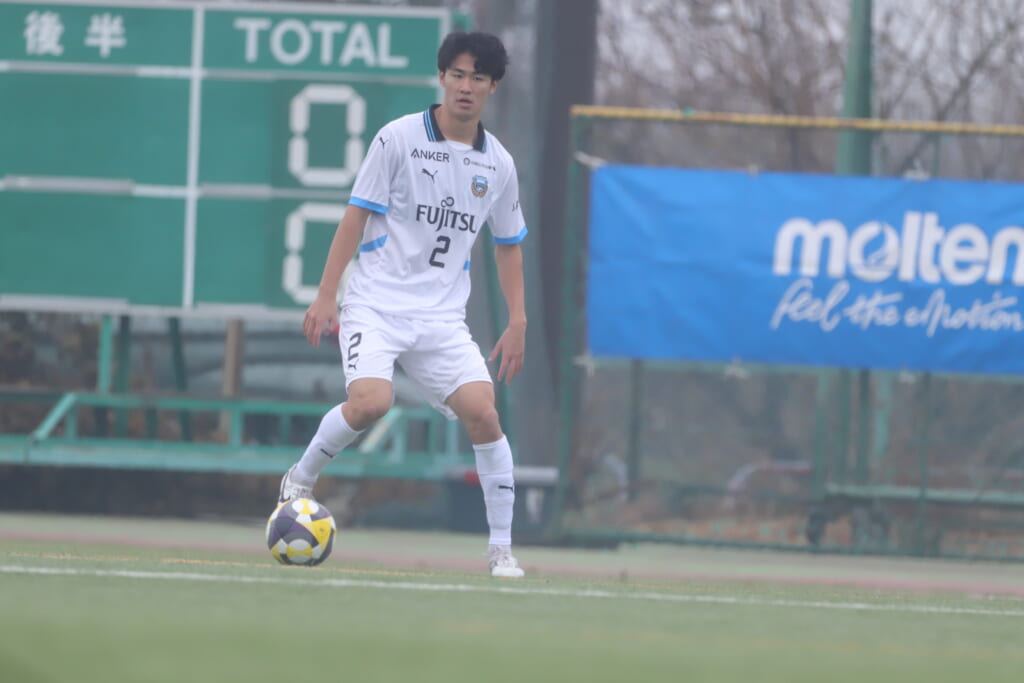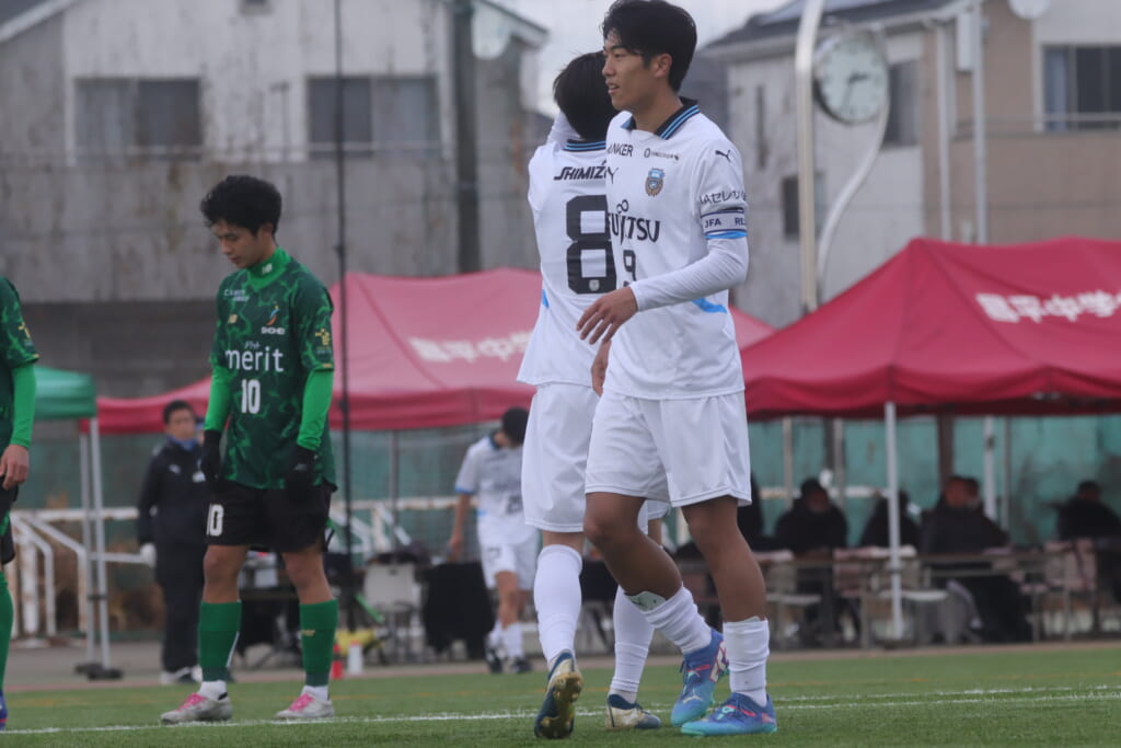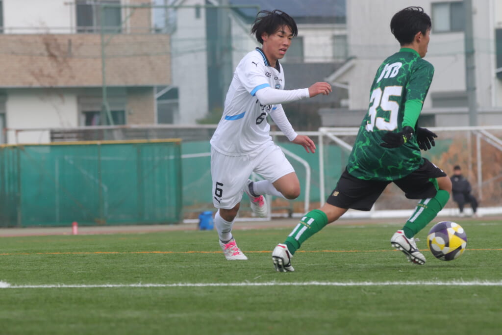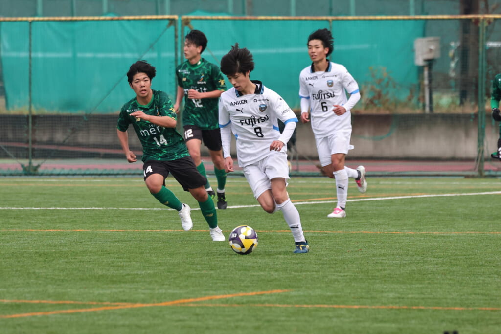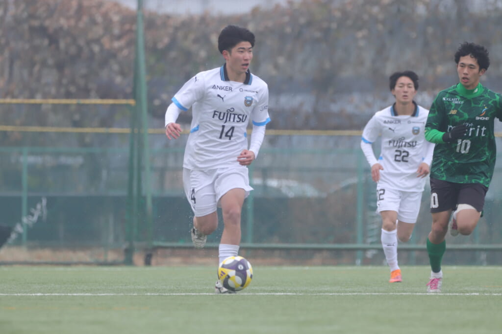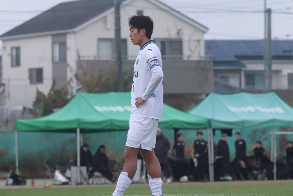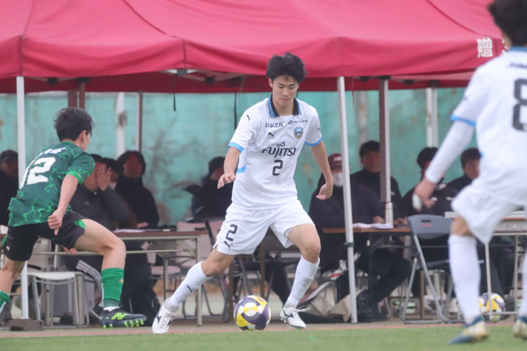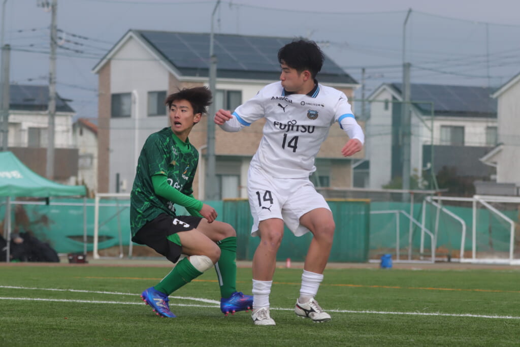 山川、藤田に中央で藤井が受け、小川尋斗が流れの中で右サイド、高い位置へ。左サイドを突くパスに、関が抜け出すなど、相手陣内での時間を増やしていくフロンターレ。