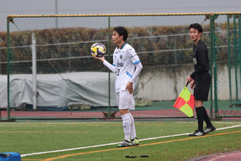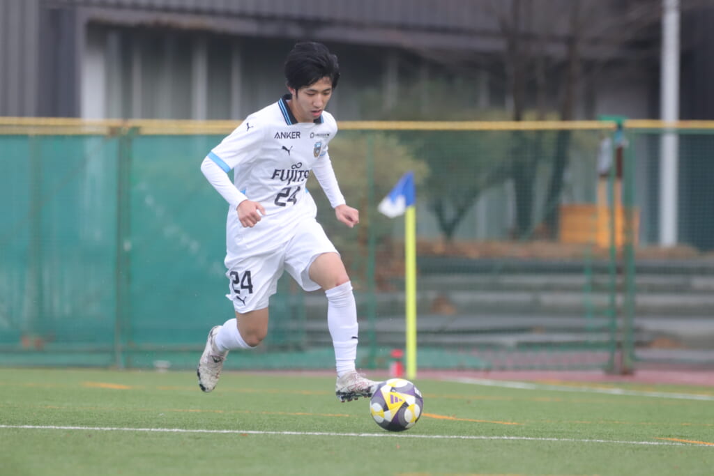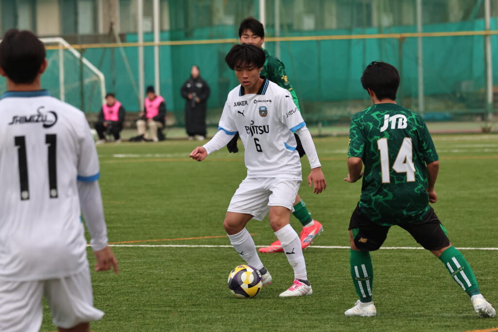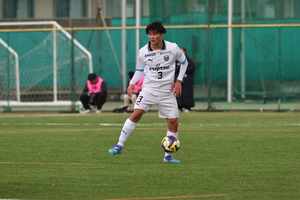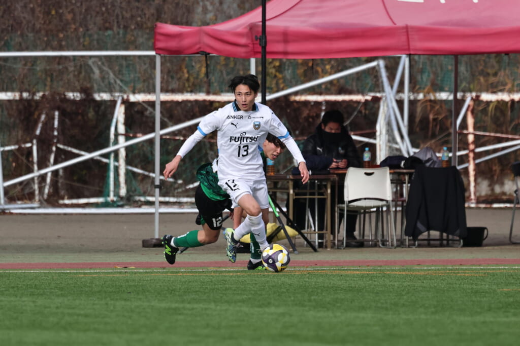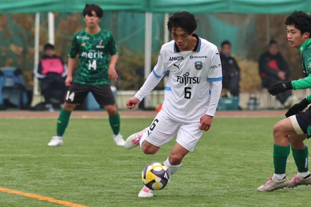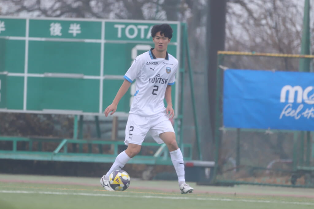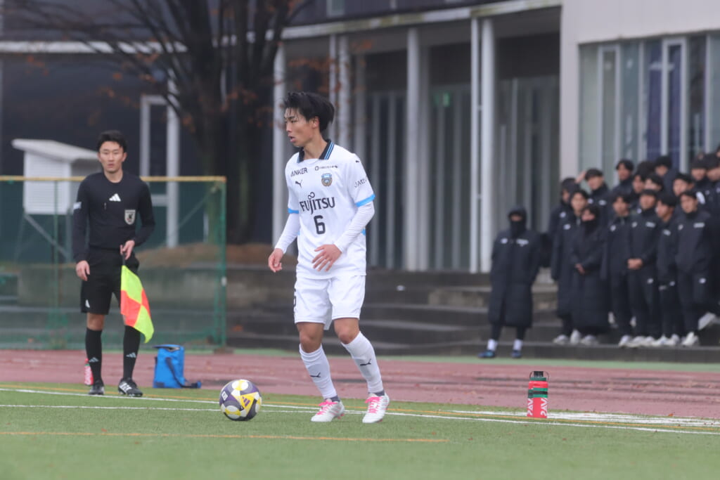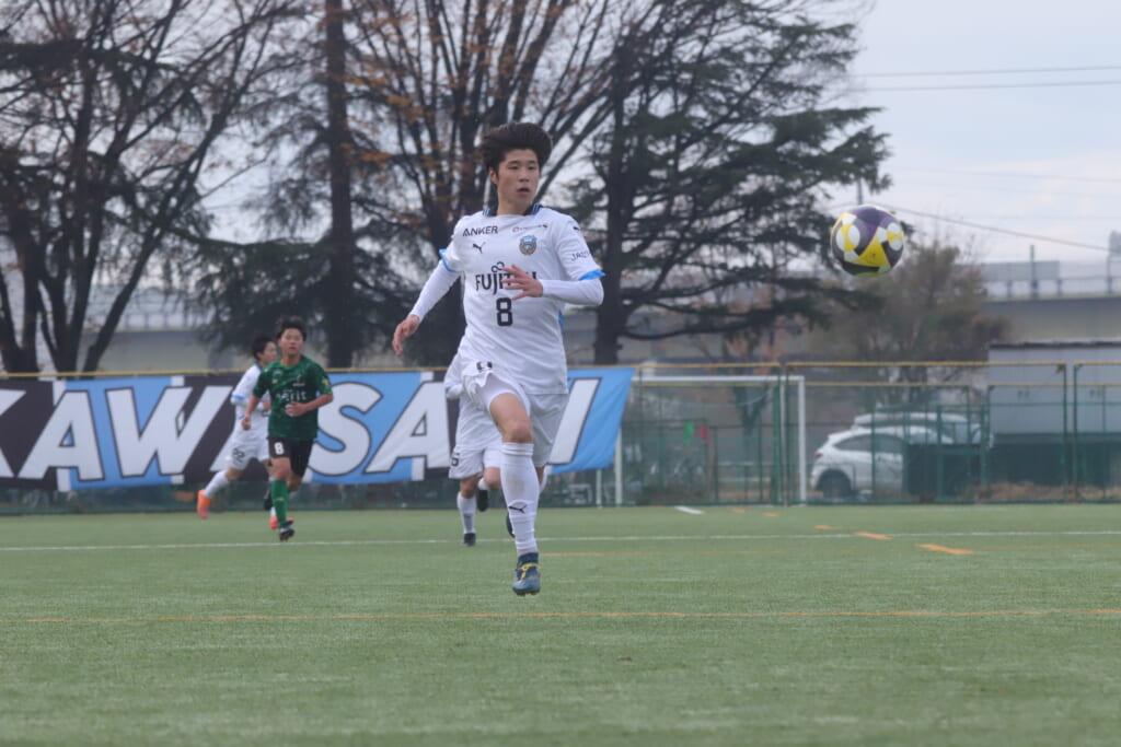 山川、藤田に中央で藤井が受け、小川尋斗が流れの中で右サイド、高い位置へ。左サイドを突くパスに、関が抜け出すなど、相手陣内での時間を増やしていくフロンターレ。