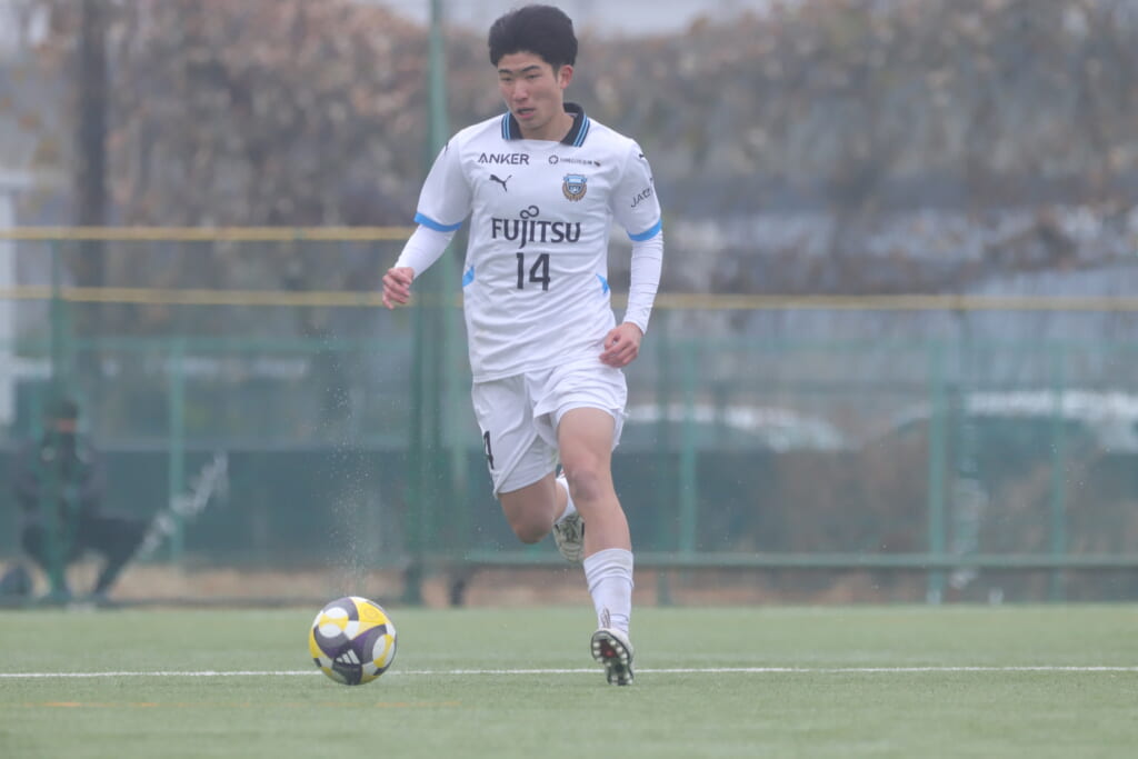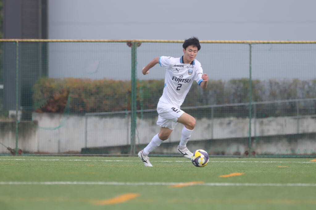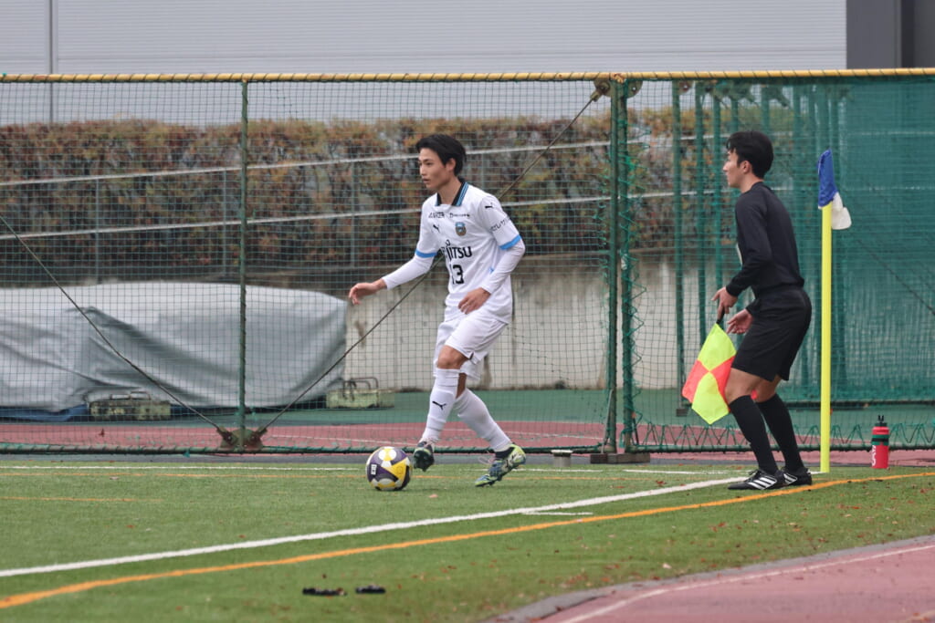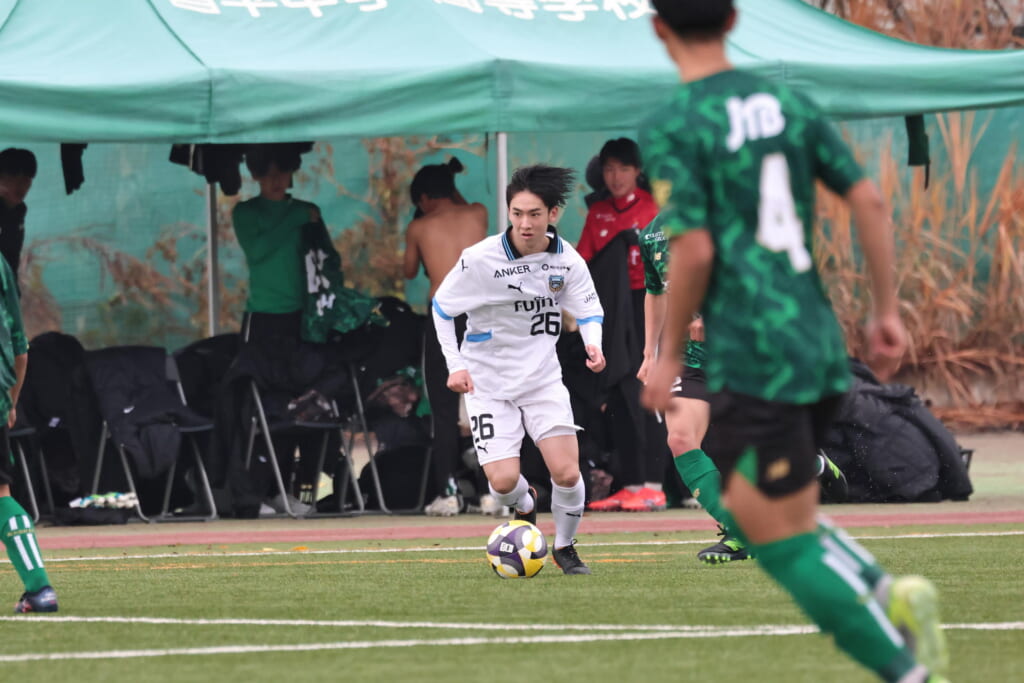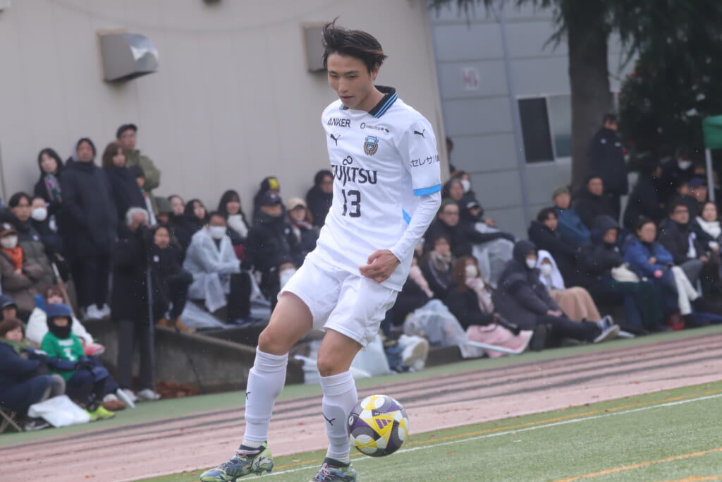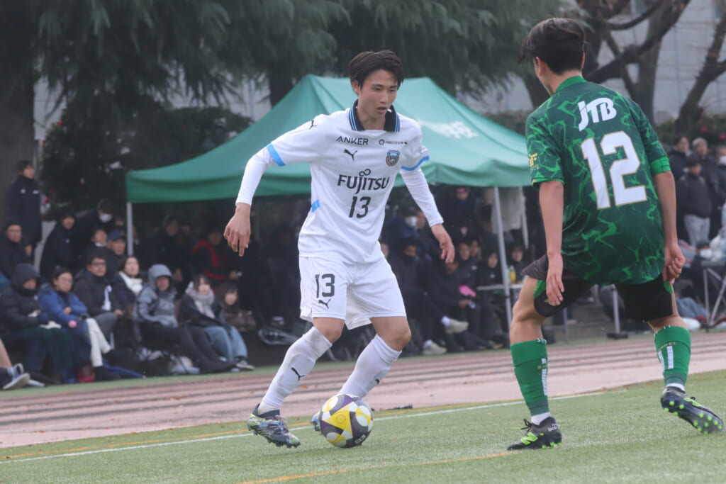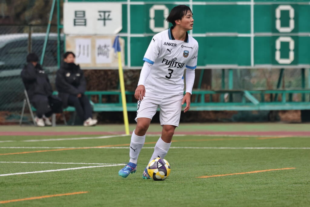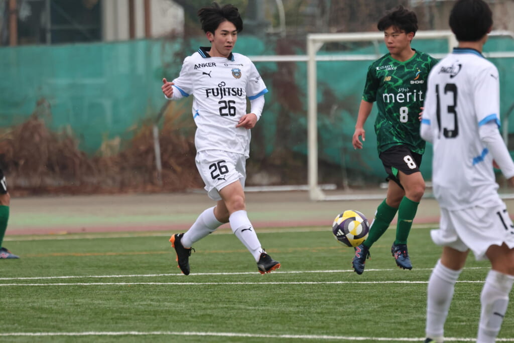 山川、藤田に中央で藤井が受け、小川尋斗が流れの中で右サイド、高い位置へ。左サイドを突くパスに、関が抜け出すなど、相手陣内での時間を増やしていくフロンターレ。