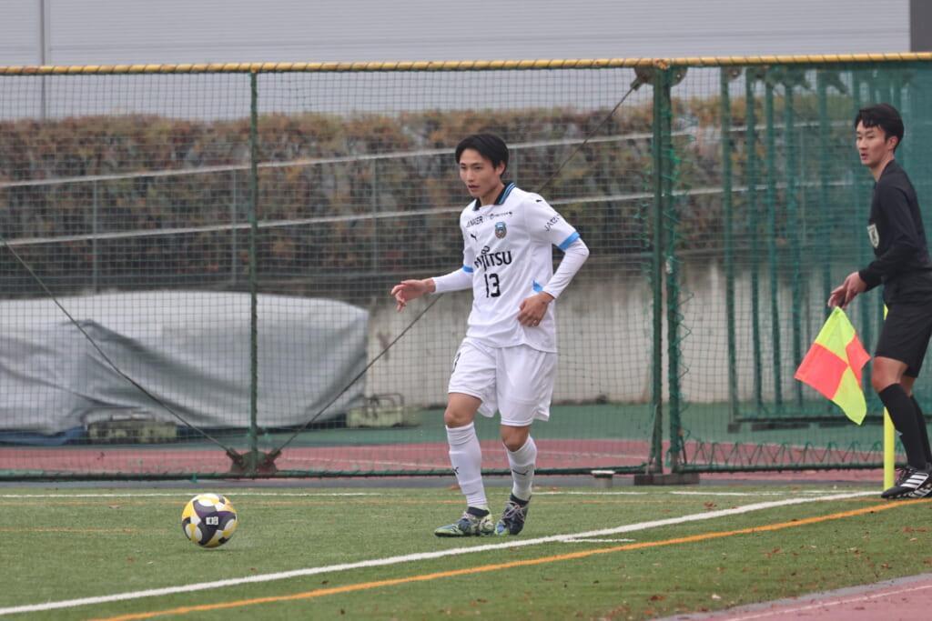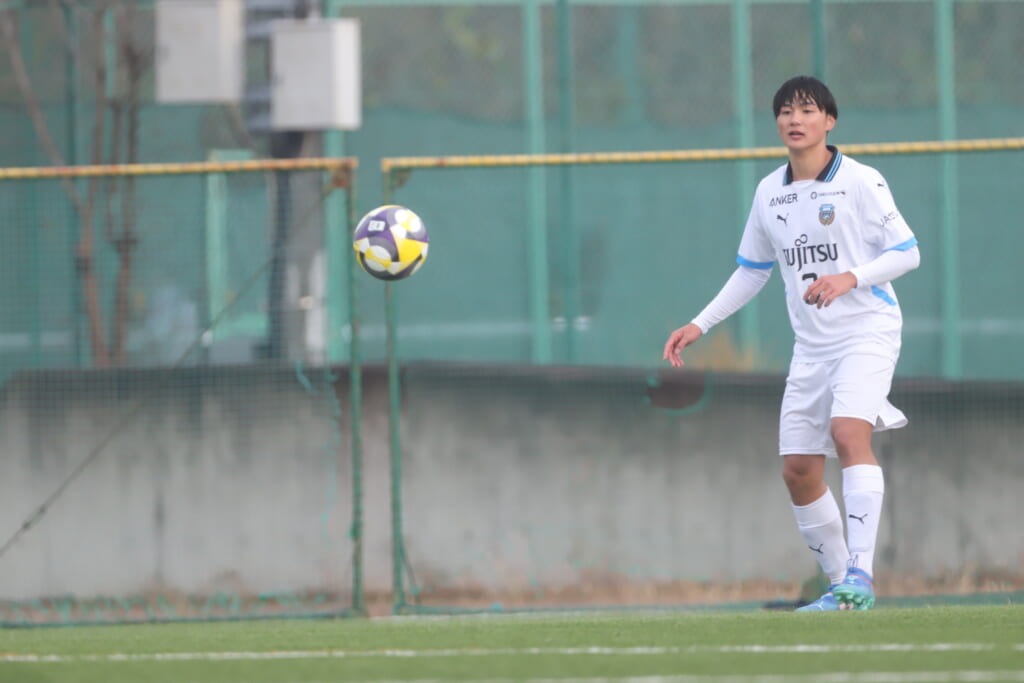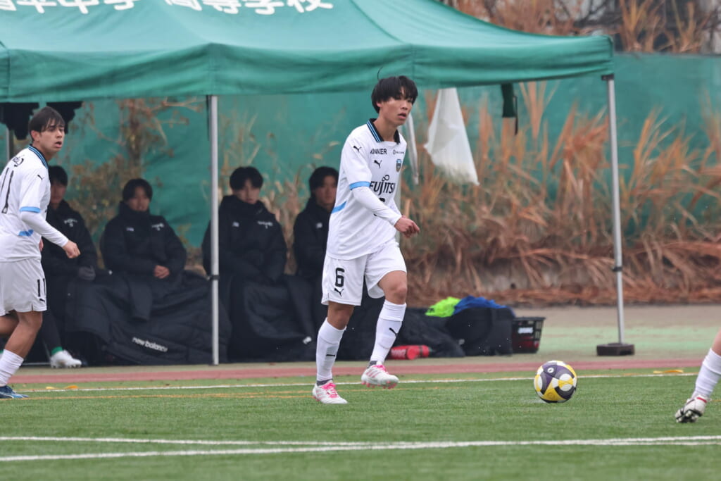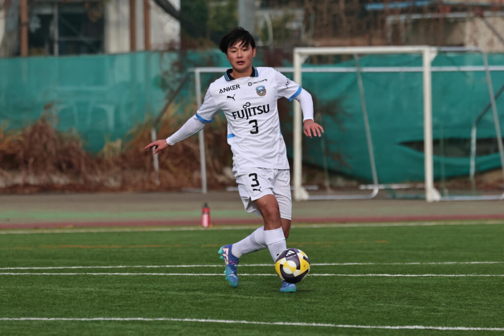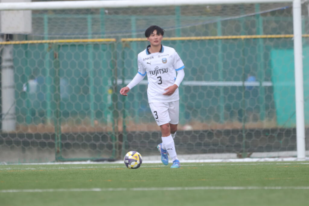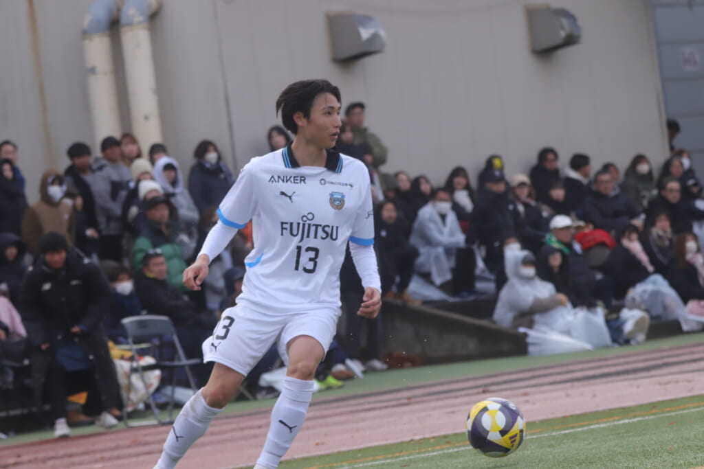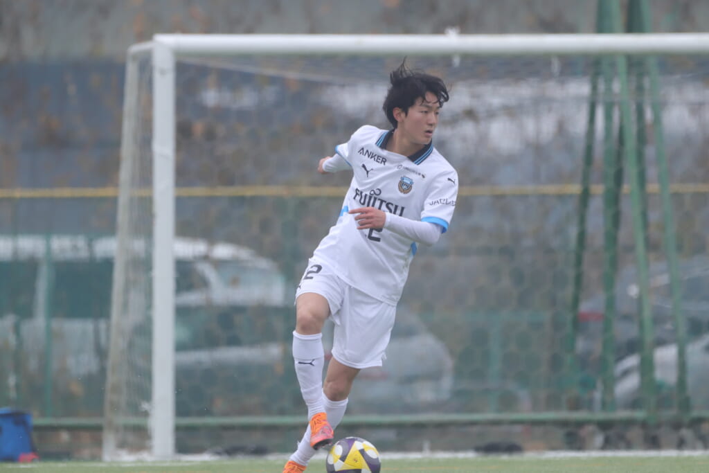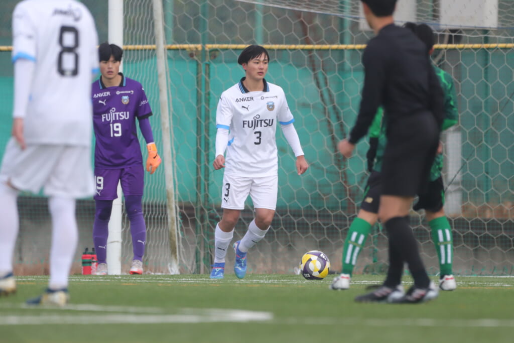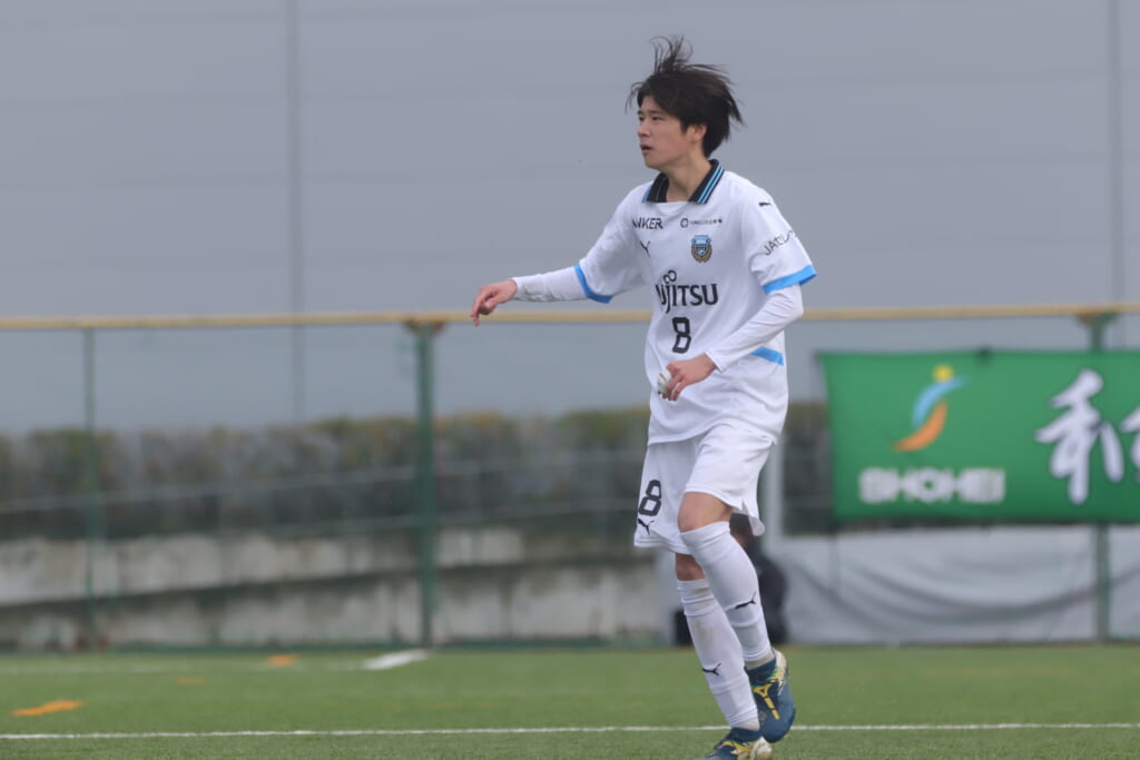 山川、藤田に中央で藤井が受け、小川尋斗が流れの中で右サイド、高い位置へ。左サイドを突くパスに、関が抜け出すなど、相手陣内での時間を増やしていくフロンターレ。