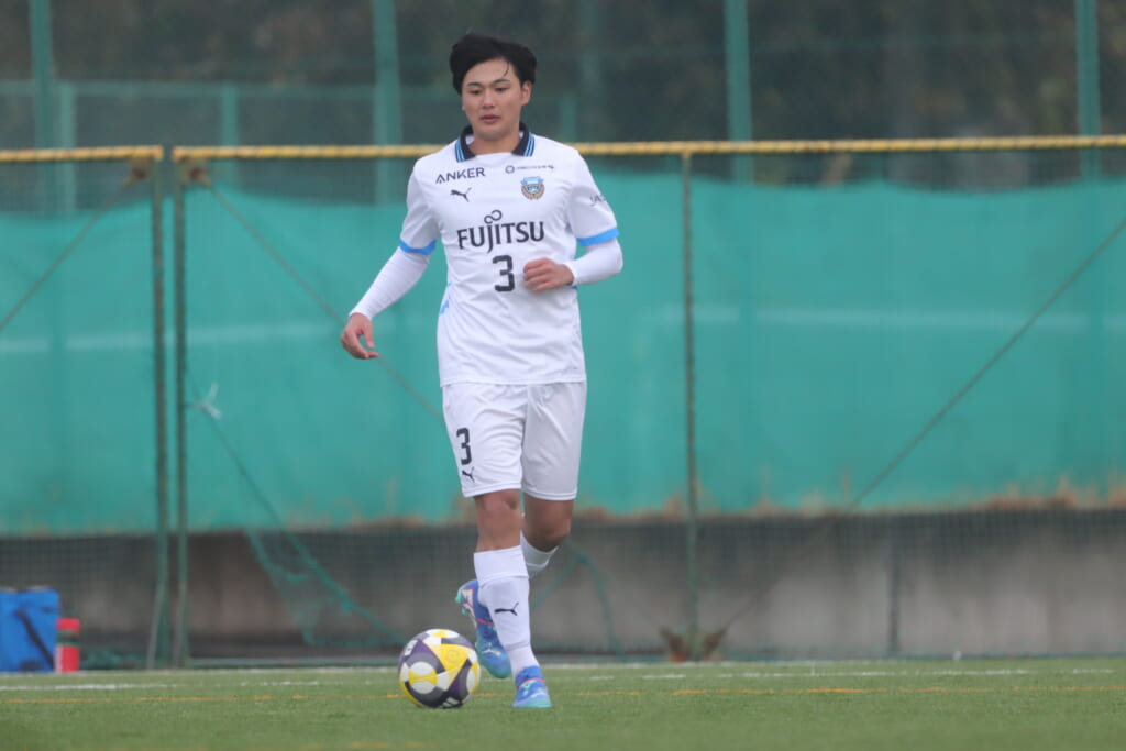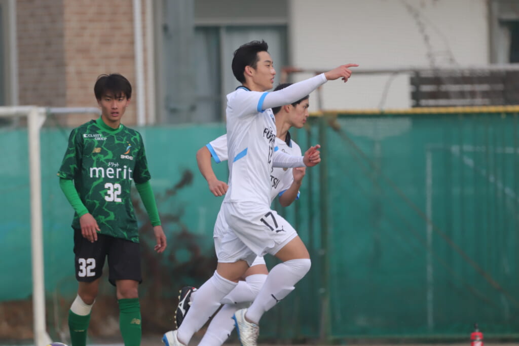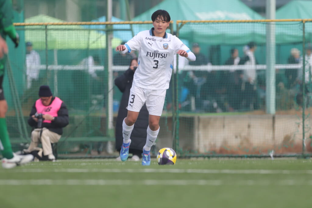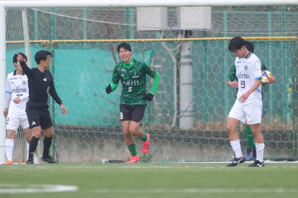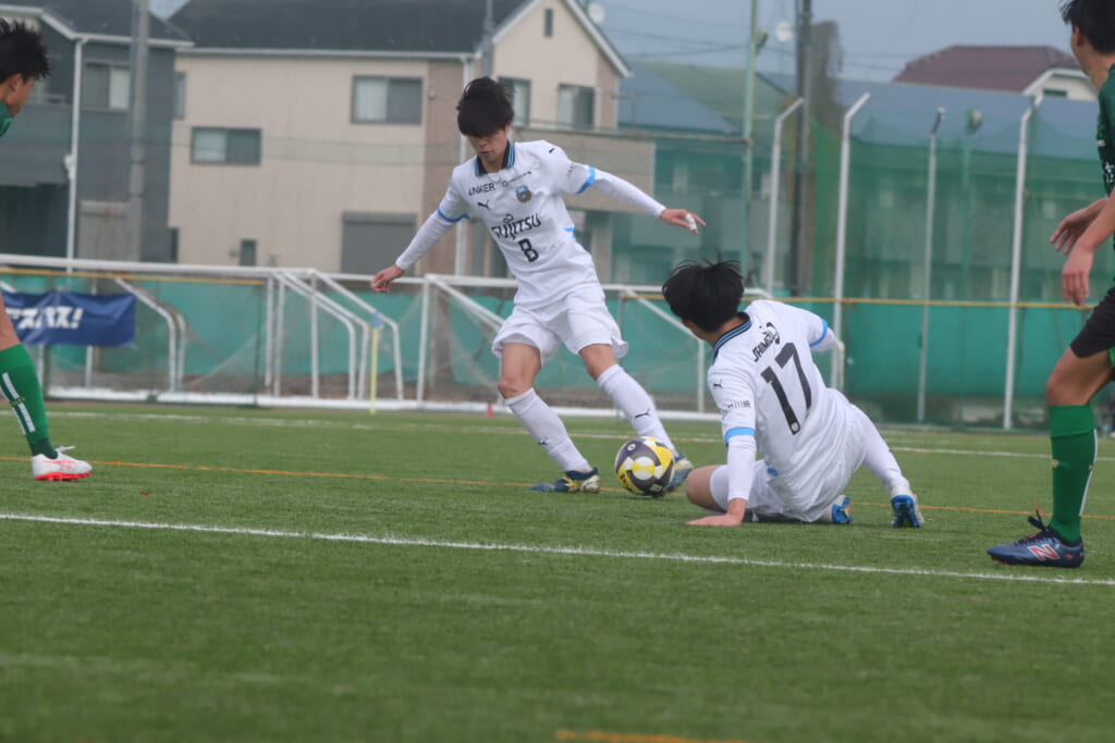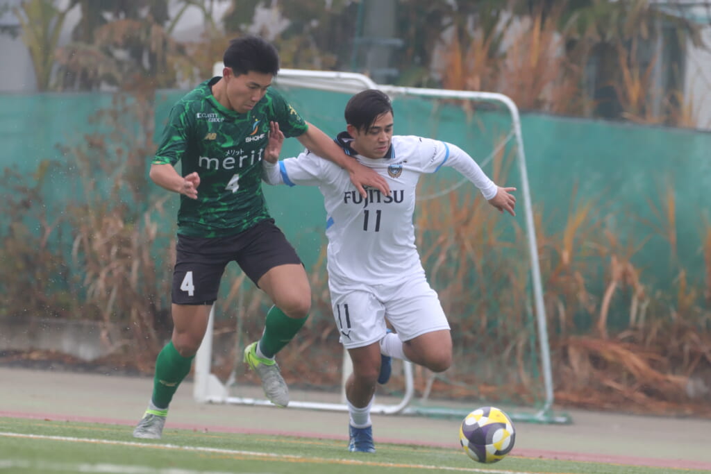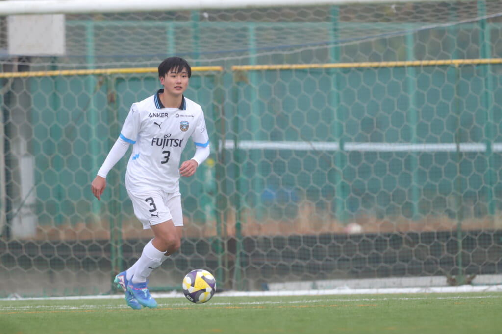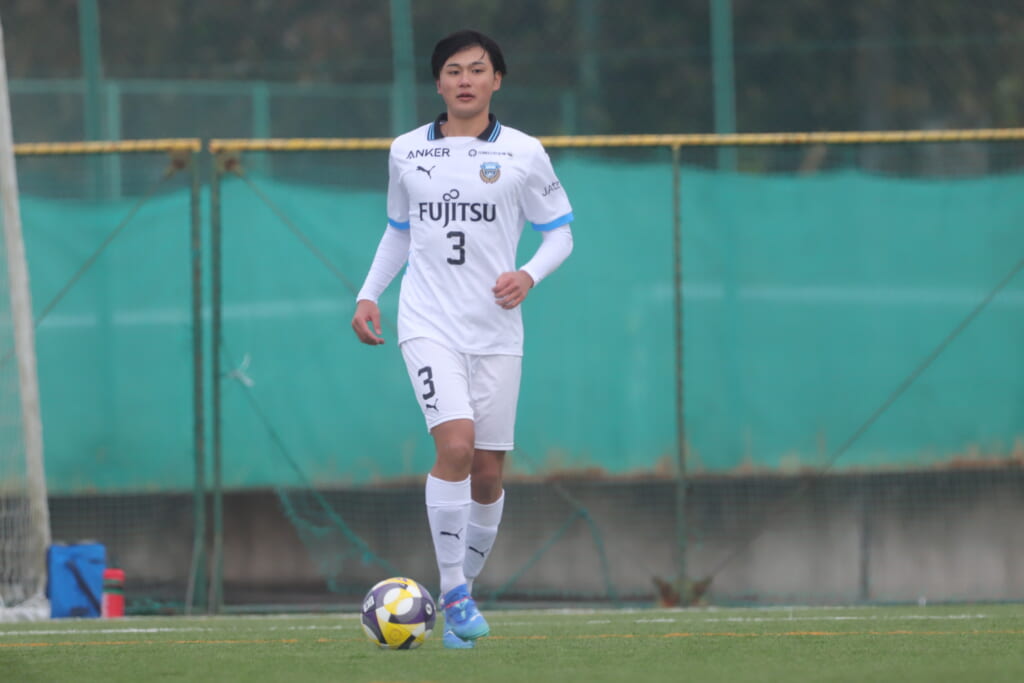 山川、藤田に中央で藤井が受け、小川尋斗が流れの中で右サイド、高い位置へ。左サイドを突くパスに、関が抜け出すなど、相手陣内での時間を増やしていくフロンターレ。