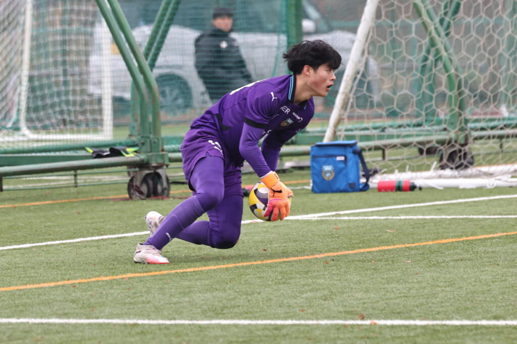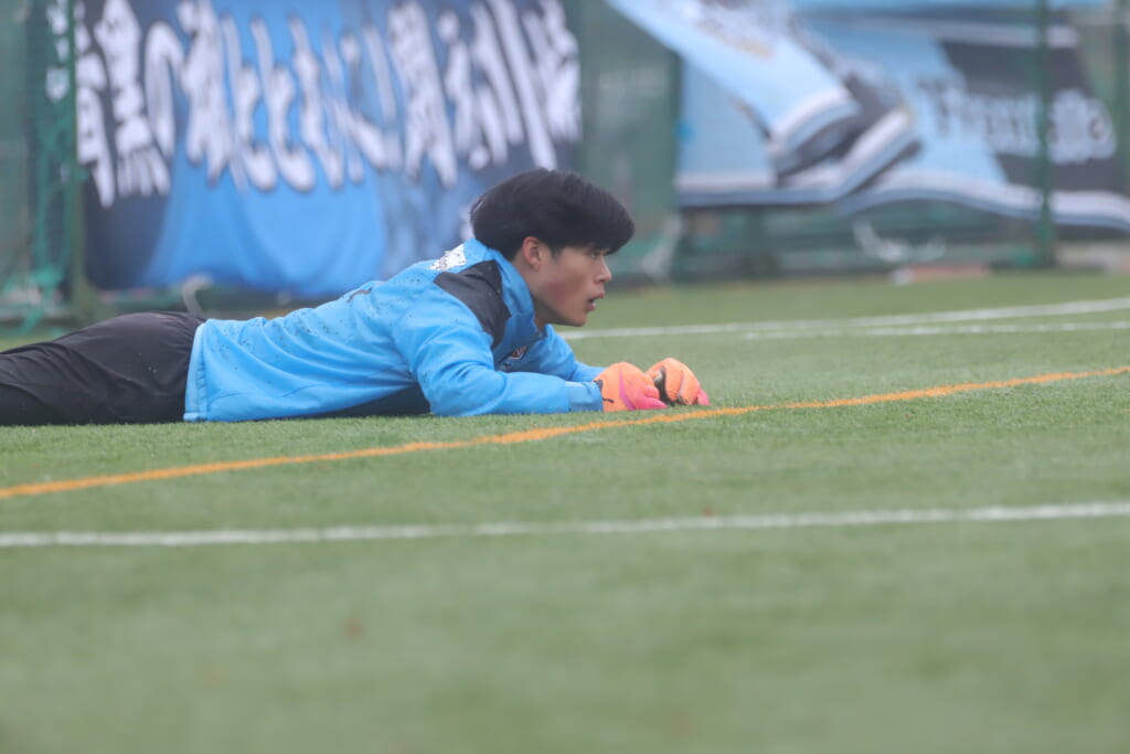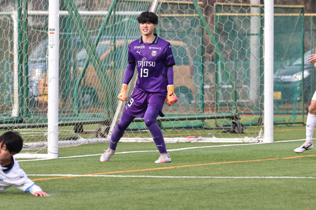 10分には、最終ラインの山川が少し前に持ち出し、柏村へ。柏村から間で受けた新堀から左サイド、関へ。関からステンパーへつながり、高い位置へ持ち込んだステンパーが折り返すと、新堀が正面でシュート。枠をとらえますが、土渕が素晴らしい反応を見せ、これを阻む好守。