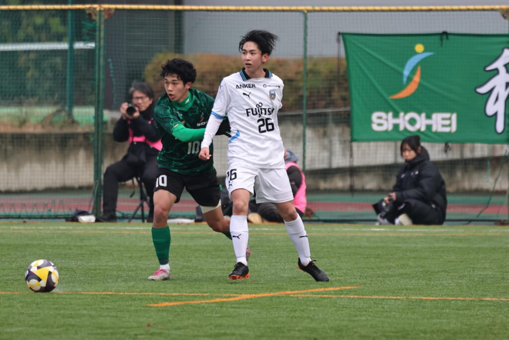 8分には、フロンターレ、藤田のフィードに、恩田がエリア正面右へ。ここは昌平高校、伊藤が粘り強く寄せていき、シュートは枠をとらえることはできず。