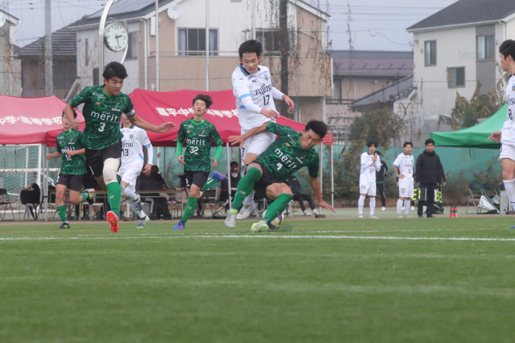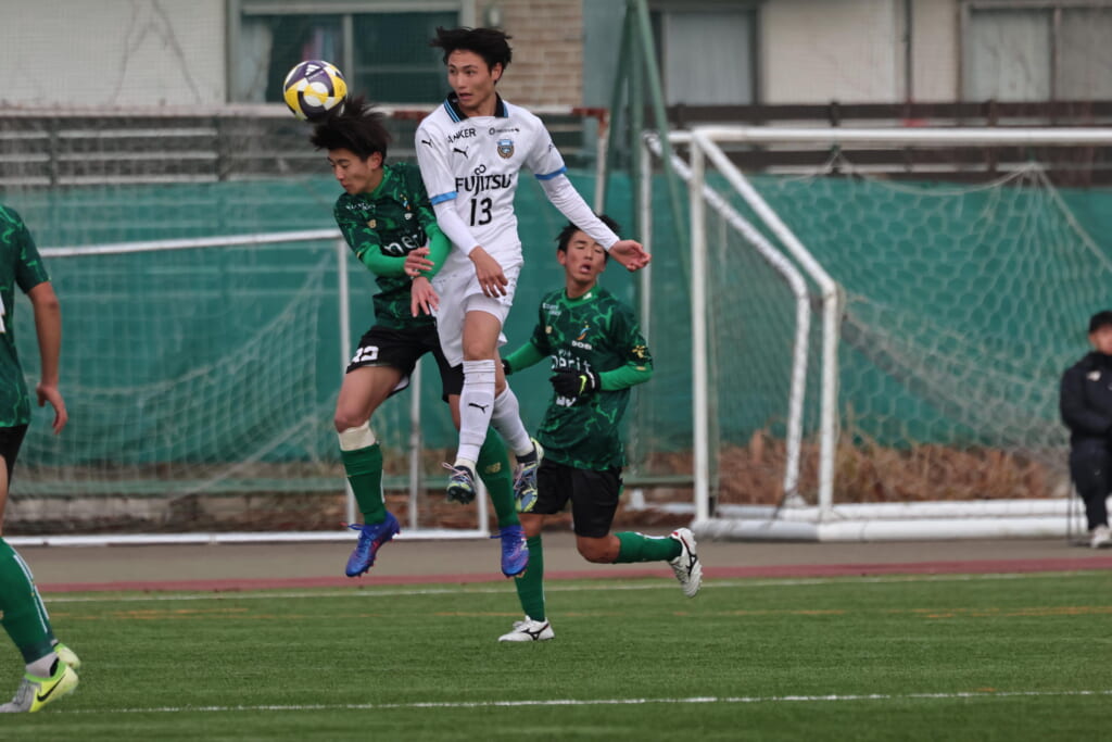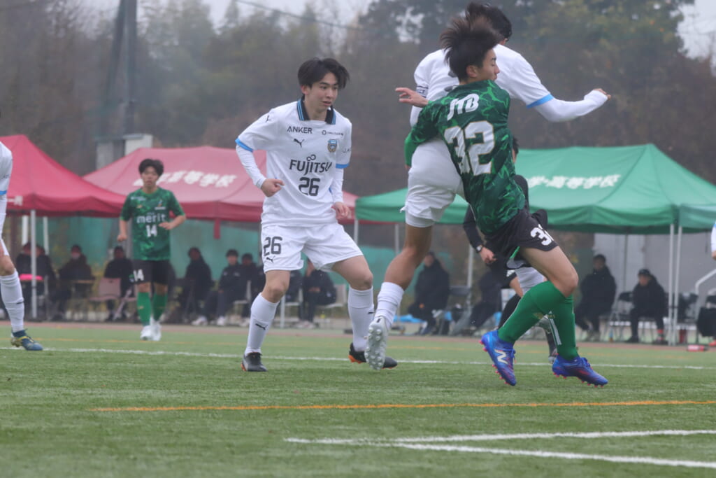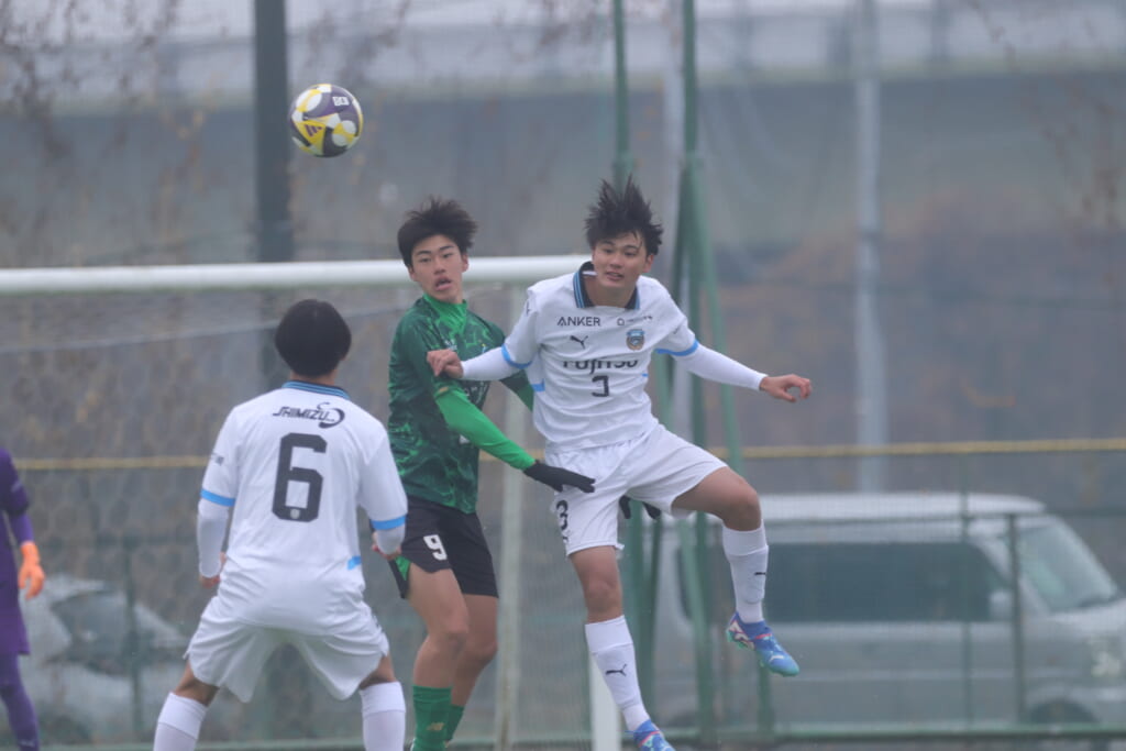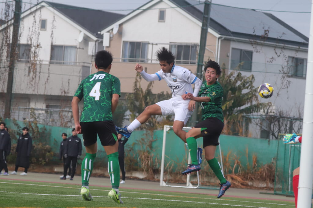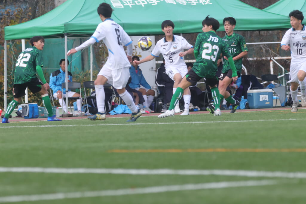すると直後にはフロンターレ。浮き球を恩田が競り、新堀が正面へ。ここは昌平高校、伊藤、さらに高橋が対応。