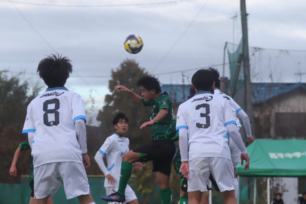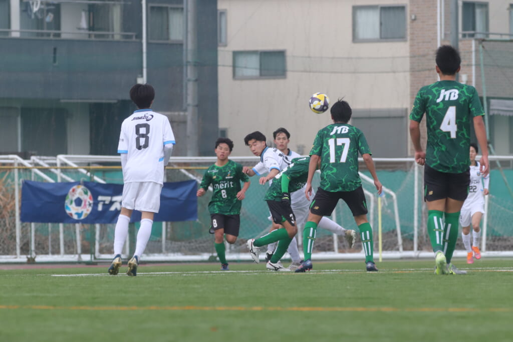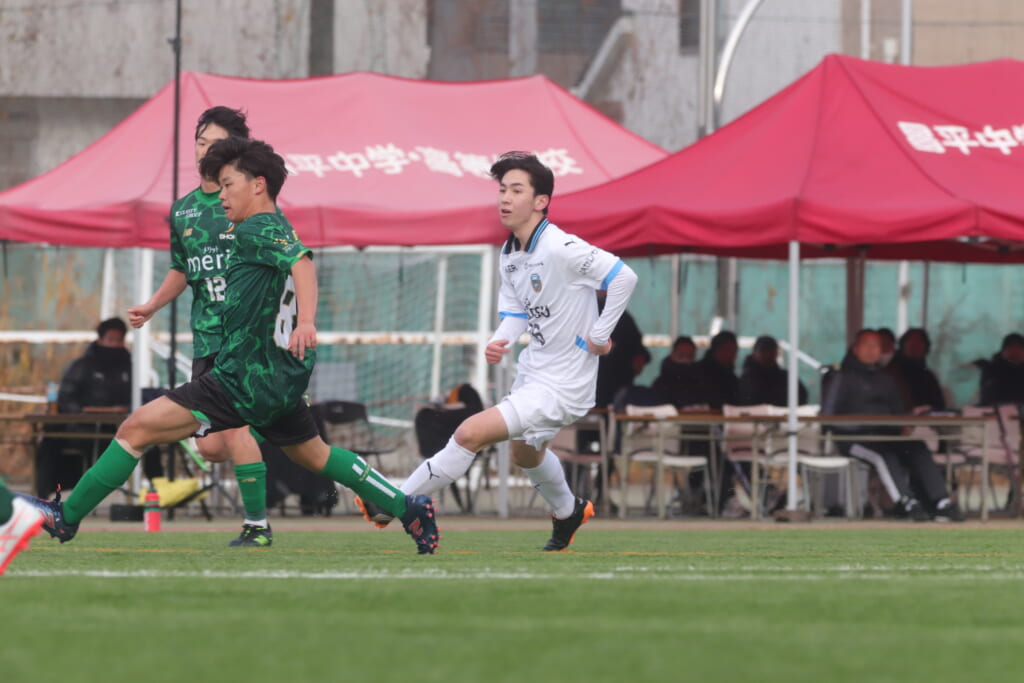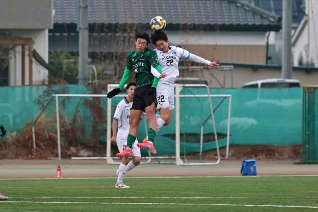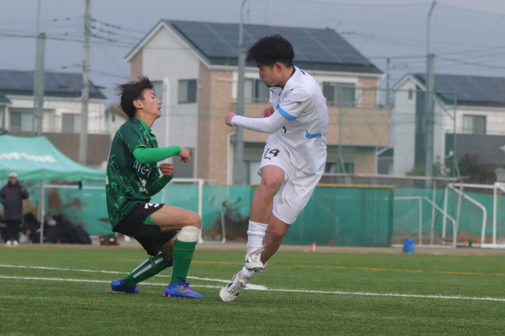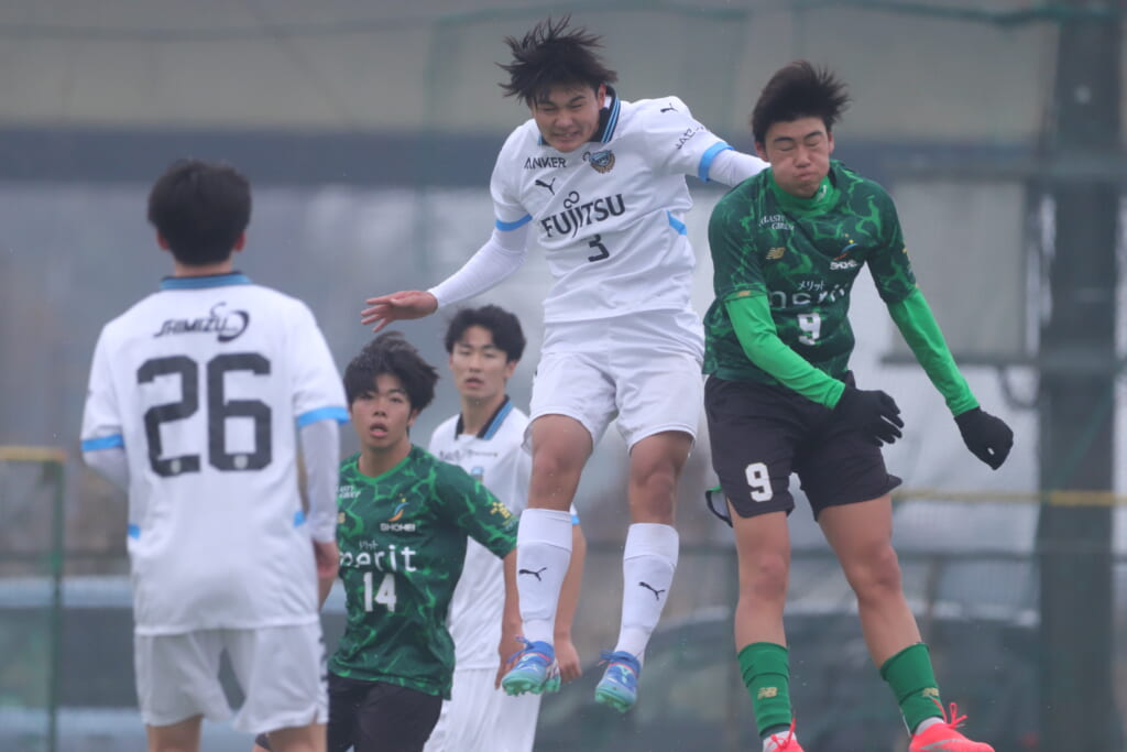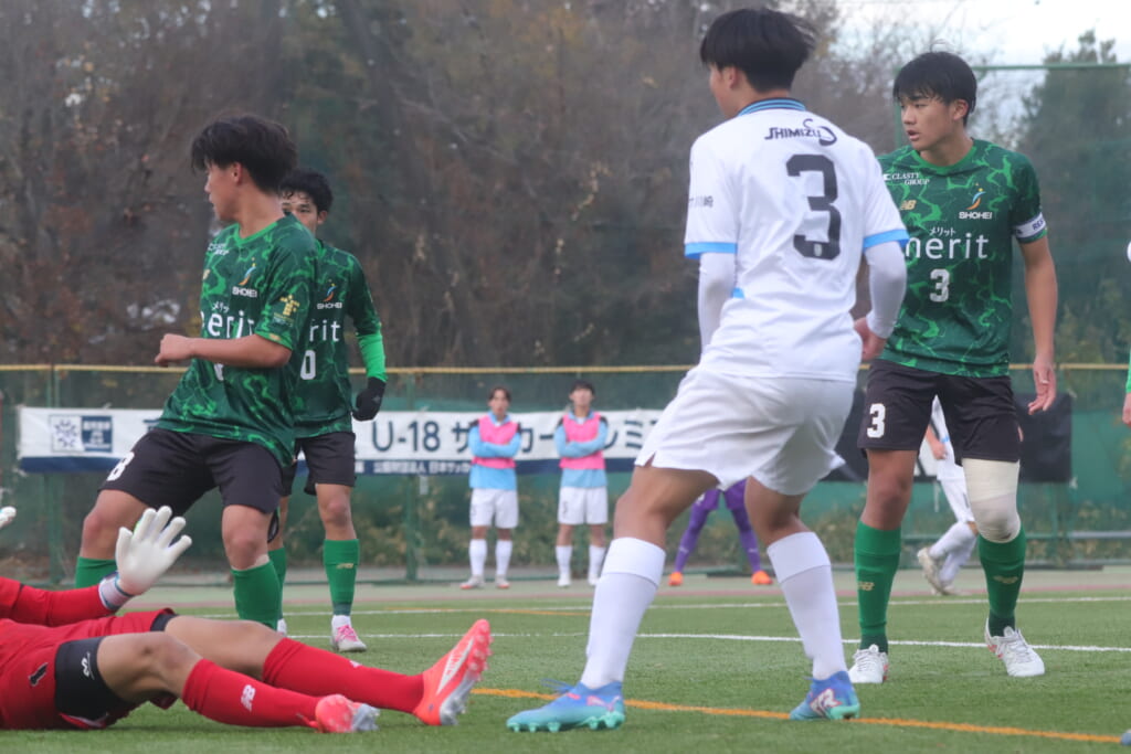 すると直後にはフロンターレ。浮き球を恩田が競り、新堀が正面へ。ここは昌平高校、伊藤、さらに高橋が対応。