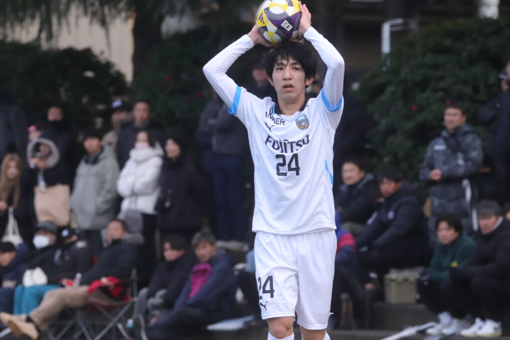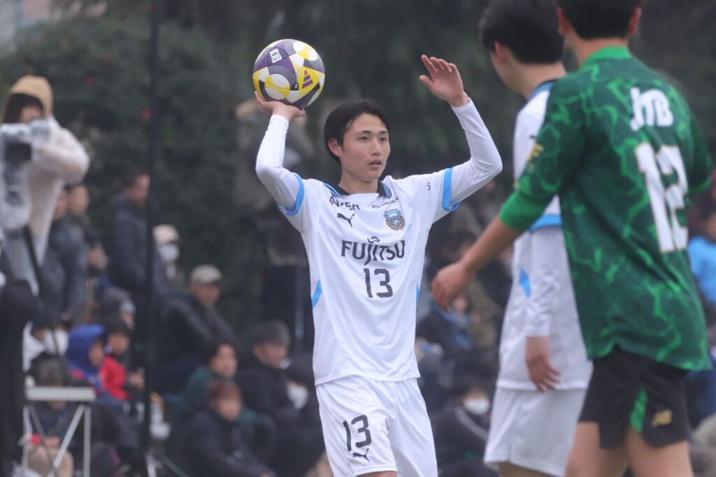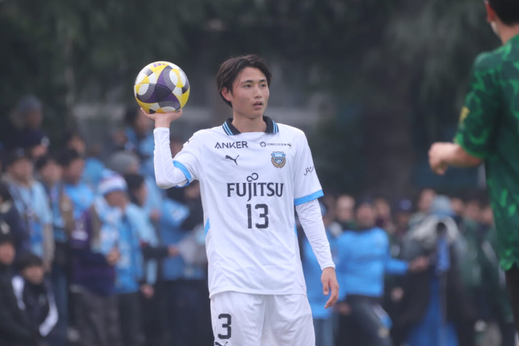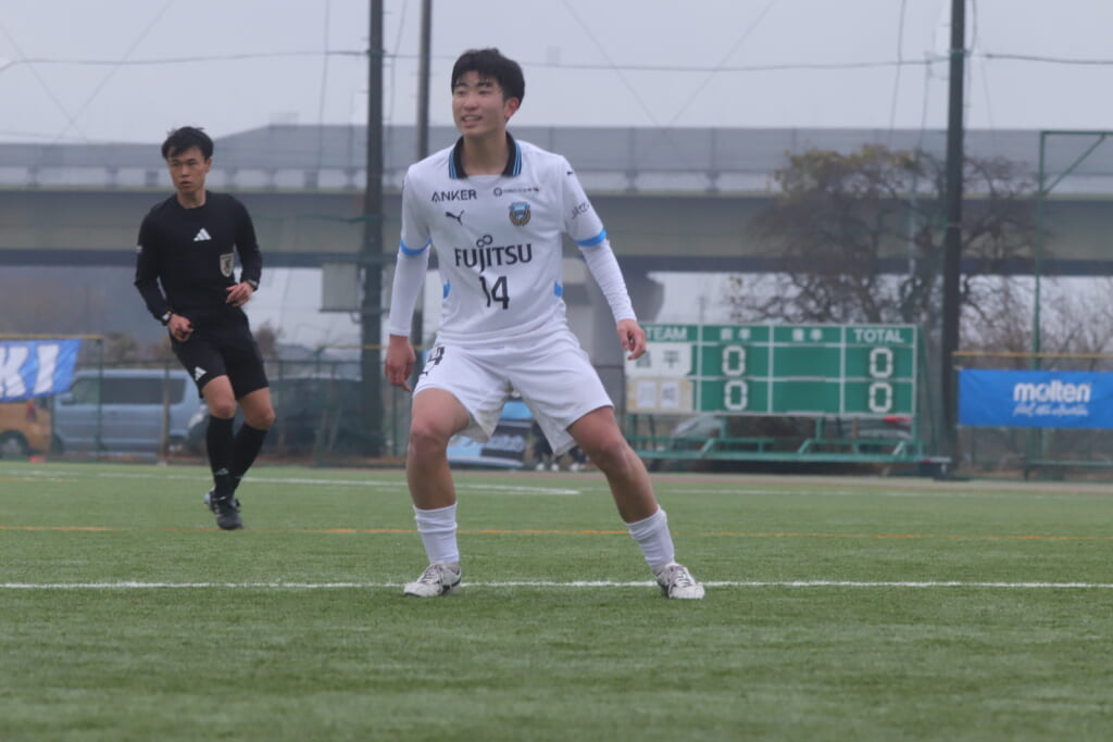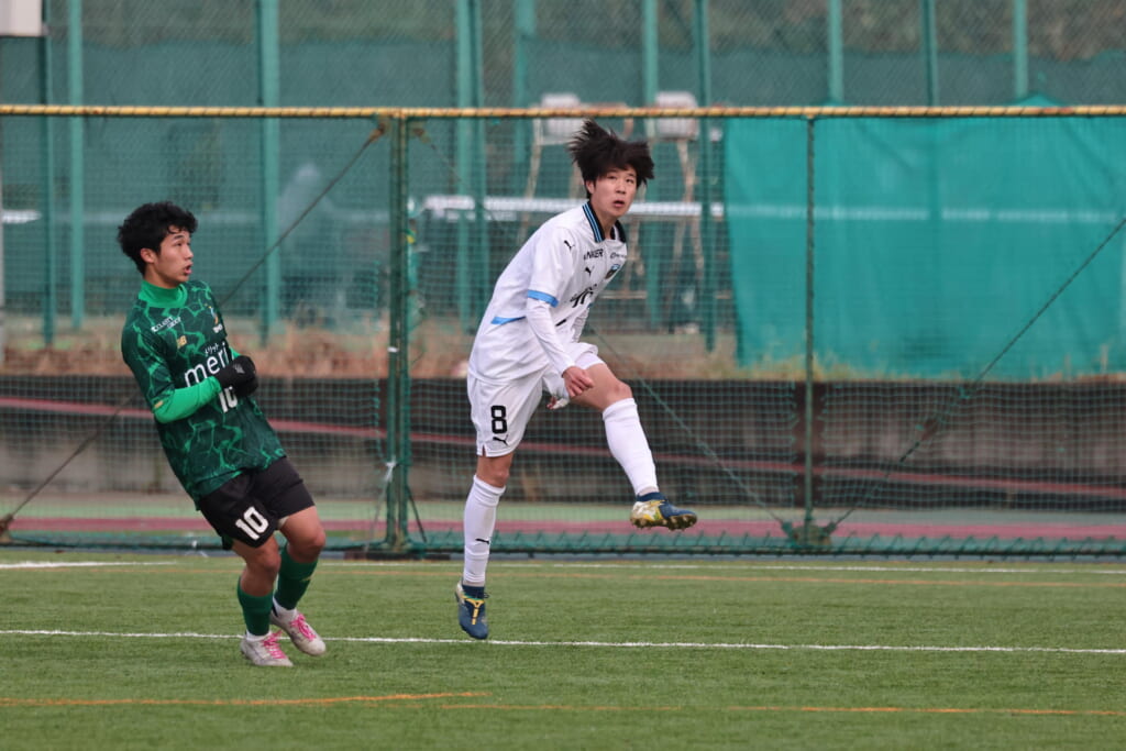 フィードに対しては、藤田が対応。セカンドボールを藤井が拾い、再びフロンターレのボールに。新堀が高い位置へ仕掛け、再び相手陣内へ。