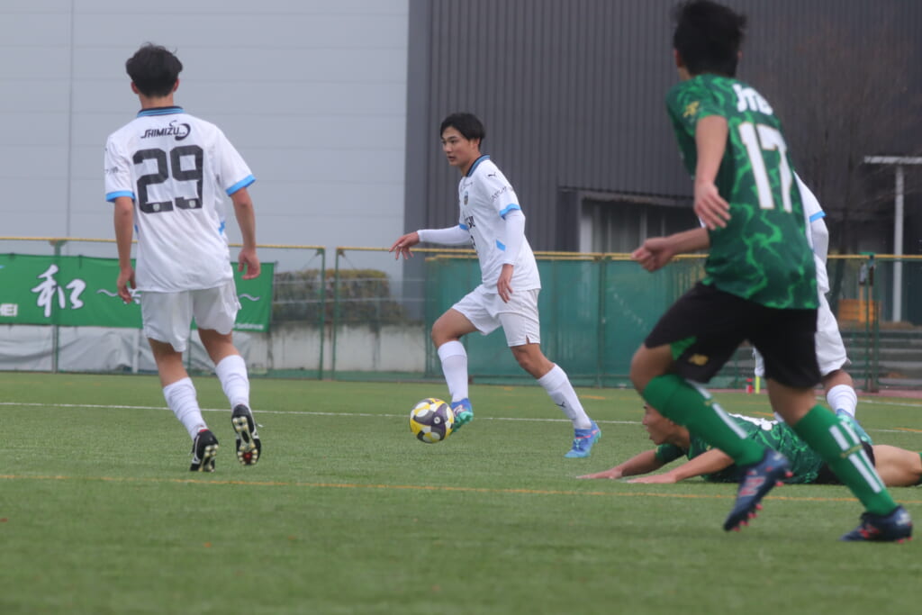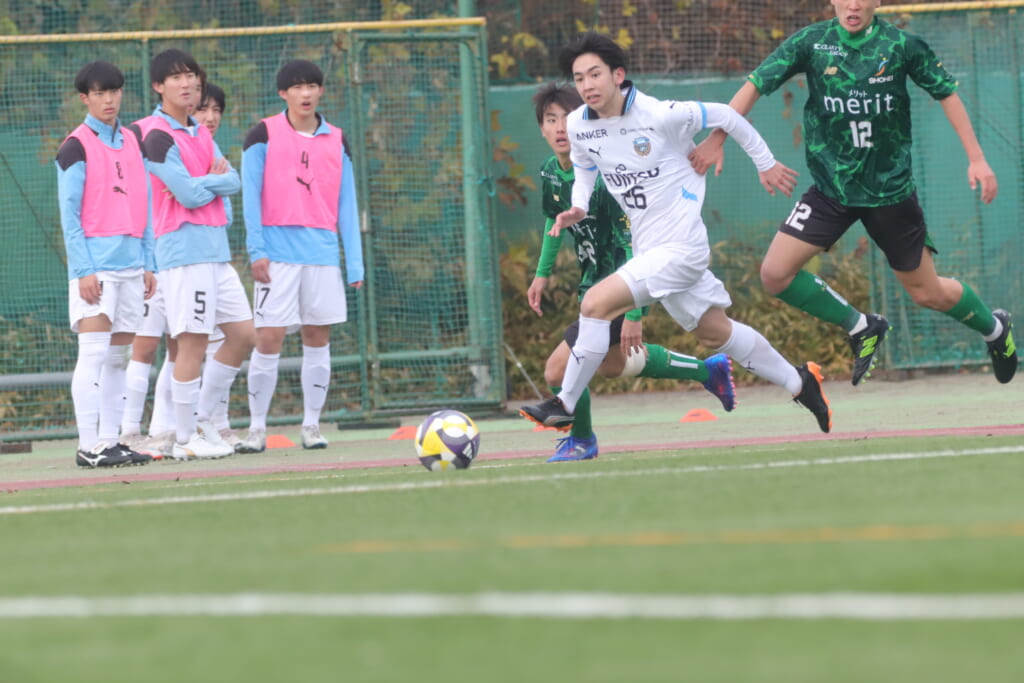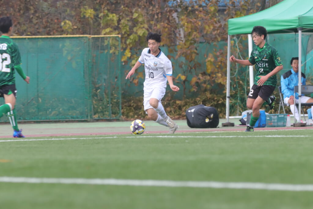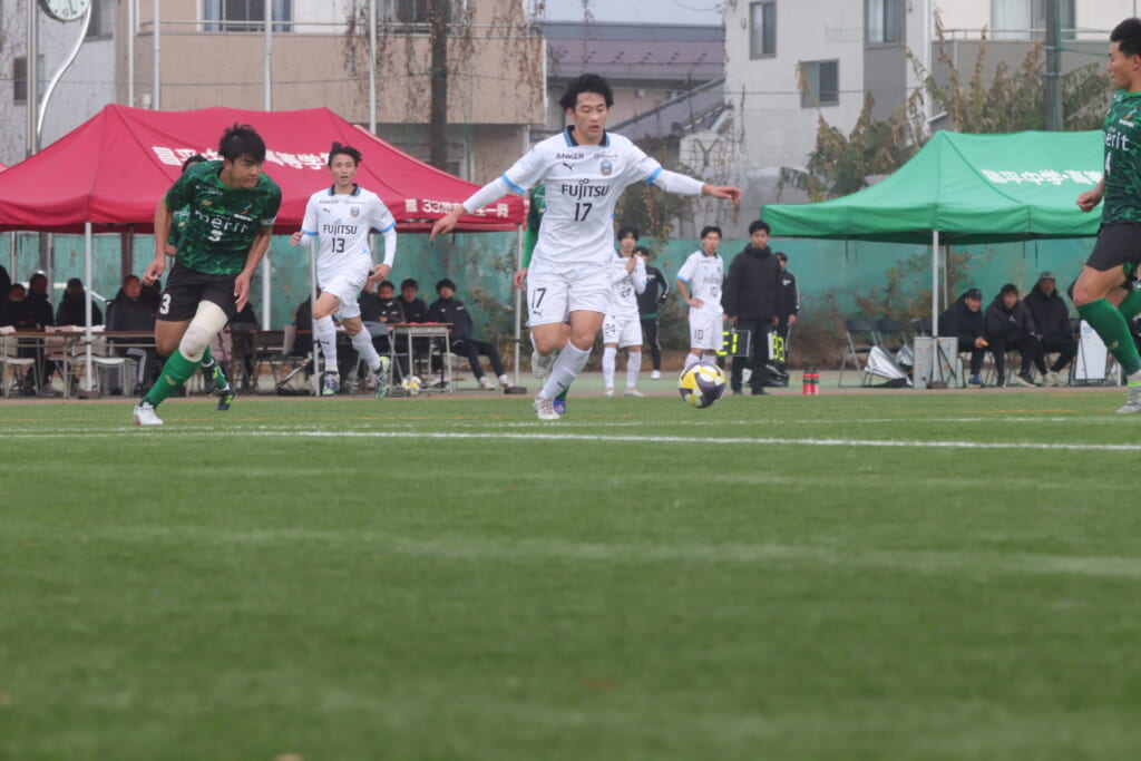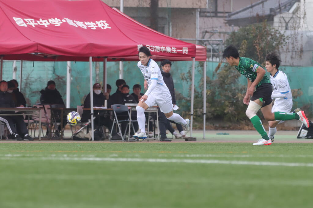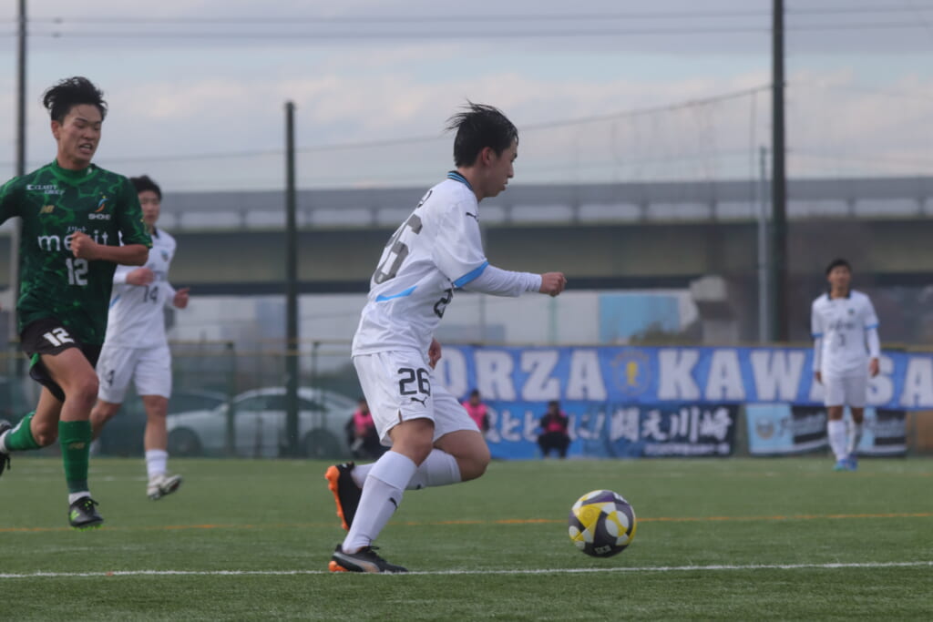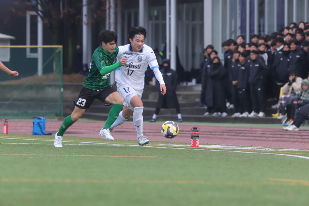 フロンターレの左コーナーキックとなり、それをしのいだ昌平高校は、古川が前に持ち込んでいきますが、フロンターレは関、さらに小川尋斗がカバー。